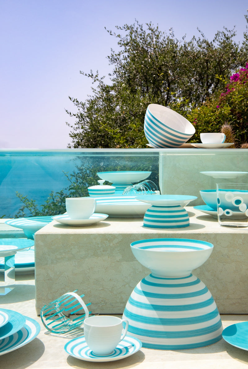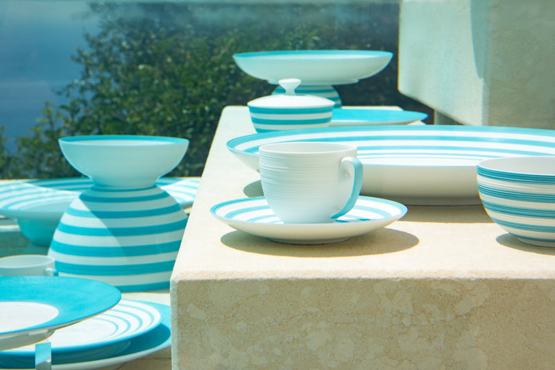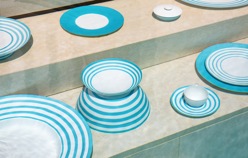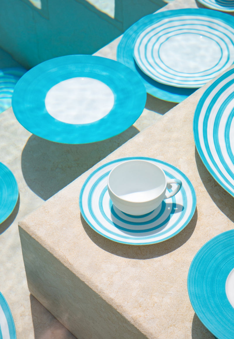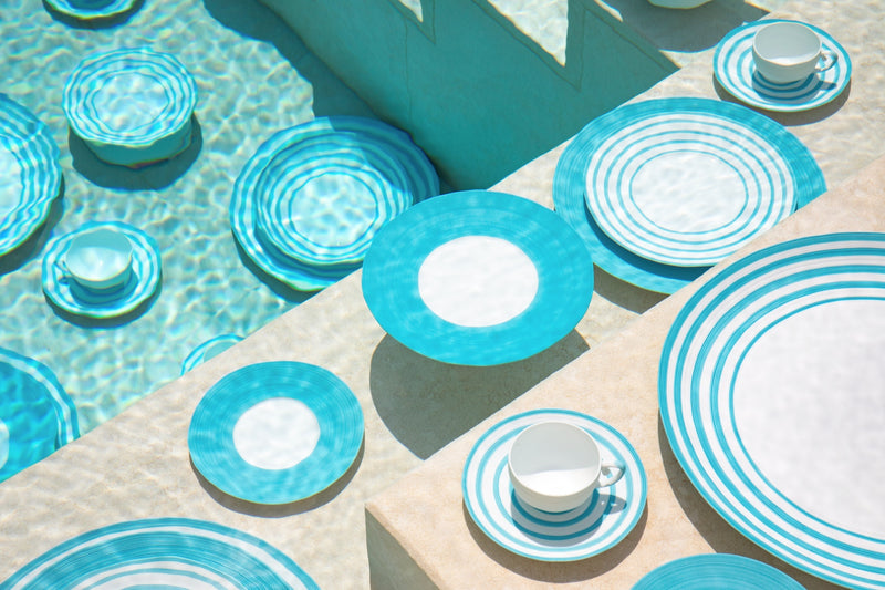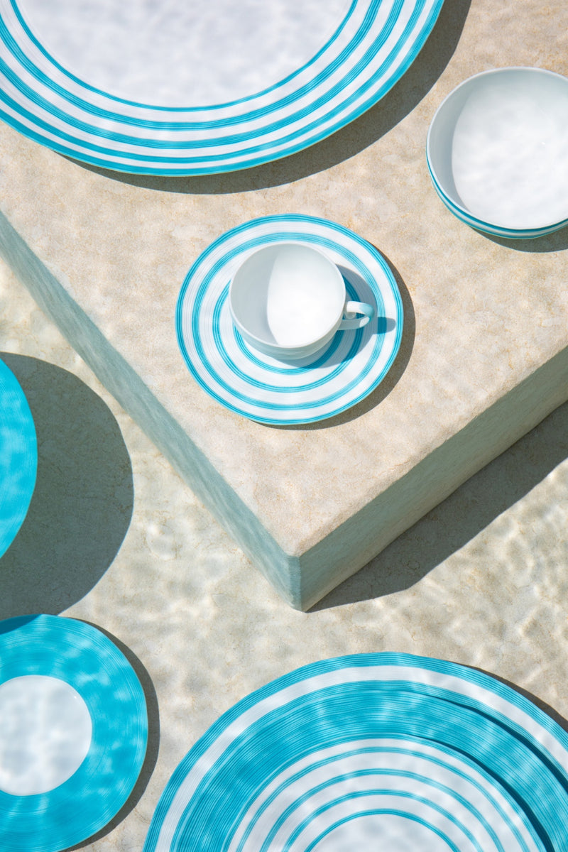 The new “Hemisphère Turquoise” tableware is an ode to summer blues and the simplicity of a Mediterranean table. It is a summer twist on the existing best-selling hemisphere White Satin line by J.L Coquet. Give your dining table a fresh look; white porcelain china with turquoise stripes and rims to mix and match! Wine and dine as you please…It’s a tablescape of opportunities! Created by Carla Ballerio at Sabrina Monte-Carlo in collaboration with J.L Coquet, for the “Arts de Table” store.