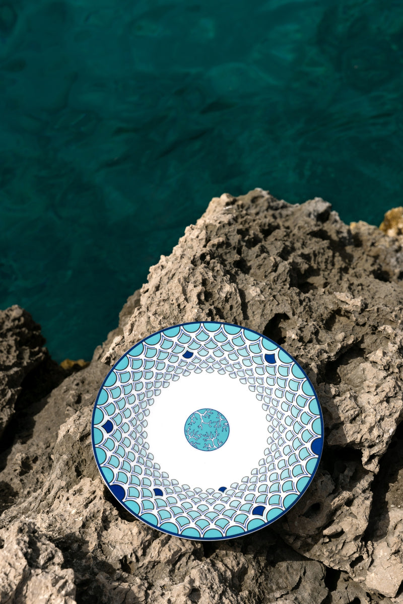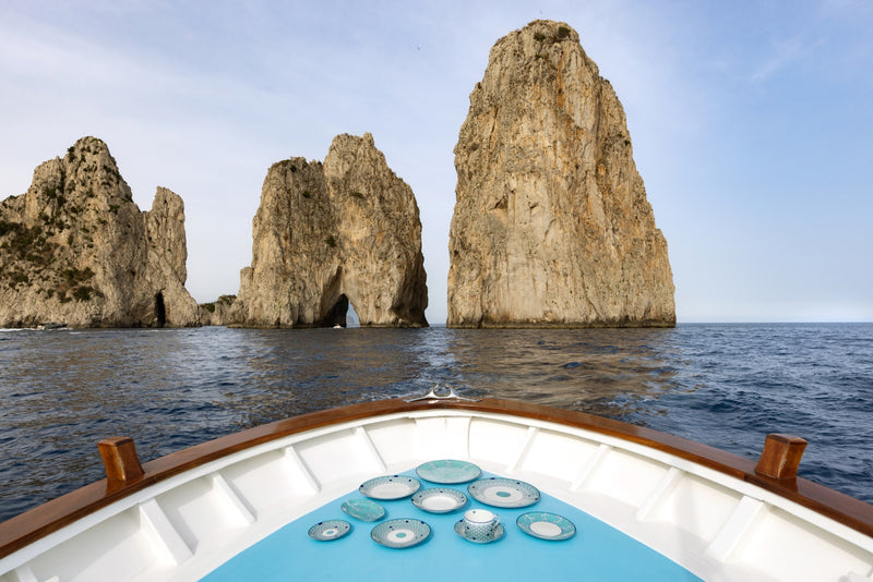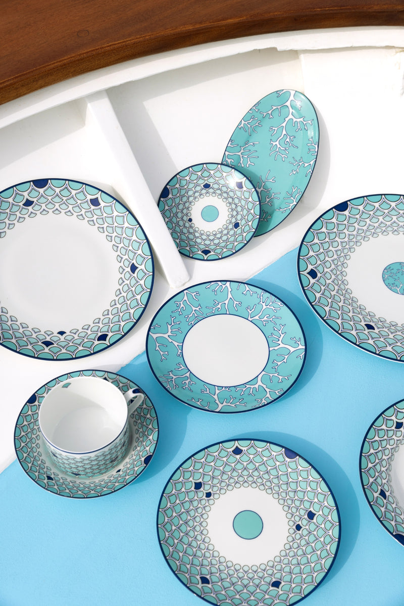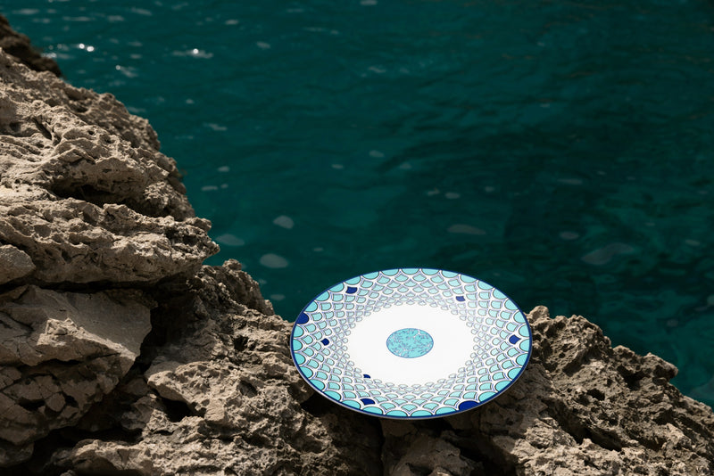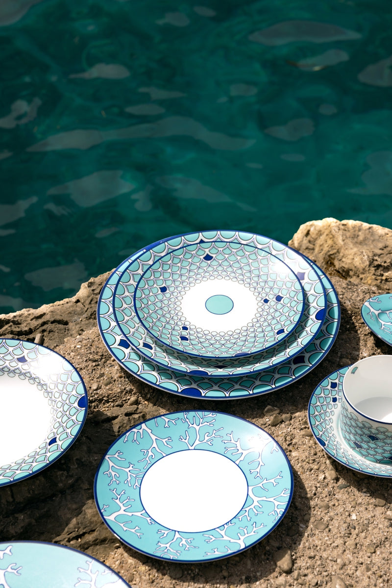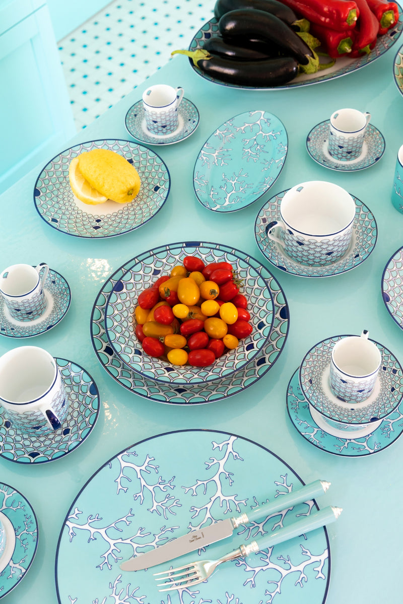 Sabrina Monte-Carlo is proud to introduce its newest collaboration with interior designer Pinto. Carla, Sabrina’s daughter, and the Parisian interiors agency put a modern spin on the existing “Lagoon” collection. This tableware was imagined and shot in Capri; an island that carries sentimental value for the entire Sabrina family. This dishwasher safe set features intricate sea-inspired elements, like corals and fish scales in different blue tones, which is an ode to the Sabrina signature color. The Capri collection is sold exclusively at Sabrina Monte-Carlo.