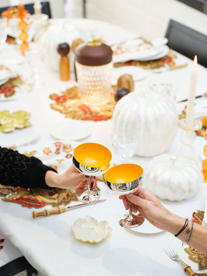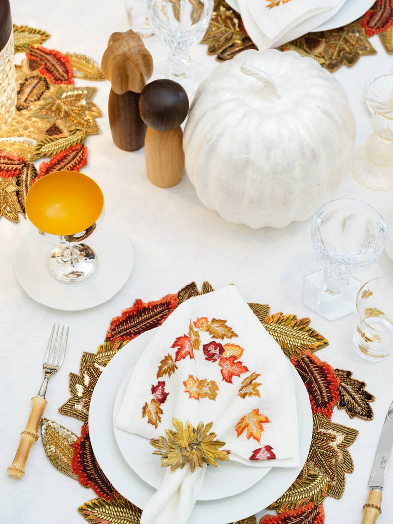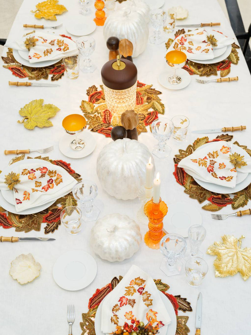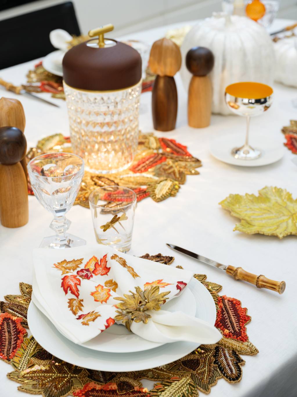 Adorned with embroidered napkins featuring delicate leaves and complemented by handmade beaded leaf placemats, this table exudes sophistication. The bamboo cutlery by Alain Saint Joanis adds a touch of natural elegance, while the White Hemisphere set sets the foundation for a refined feast. Enhance the festive ambiance with mushroom-shaped wood salt and pepper shakers by L’Objet, and elevate your drink service with Artel gilded water tumblers. For a truly elegant touch, savor the moments with Baccarat Harcourt glasses, completing the ensemble for a Thanksgiving celebration like no other.