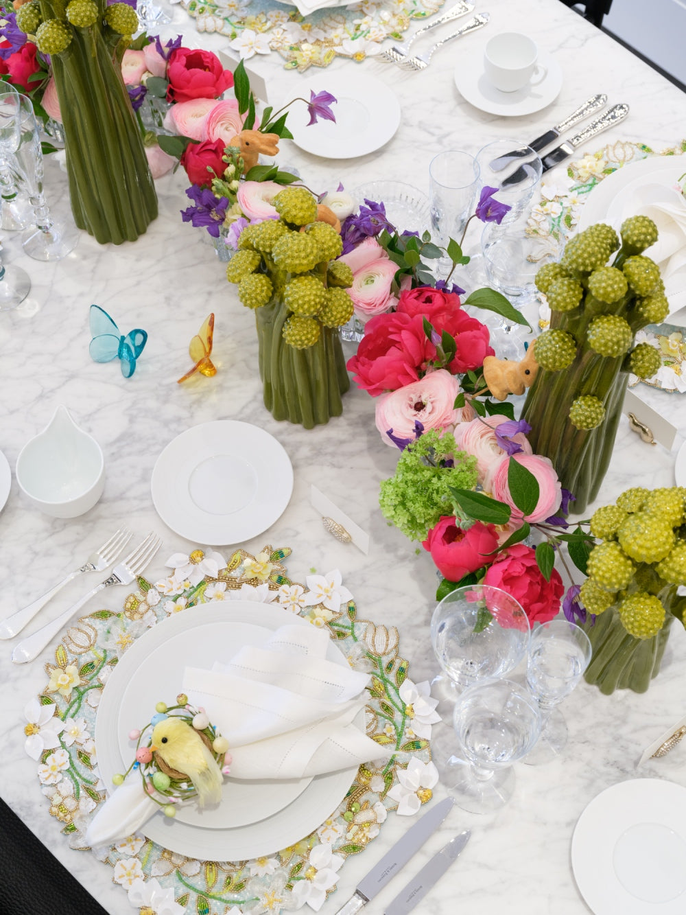 Carla accessorized with Baccarat crystal butterflies in pastel tones, which added a pop of color to the table. She also mixed in whimsical ceramic flower towers of different heights to give the table a more playful touch.