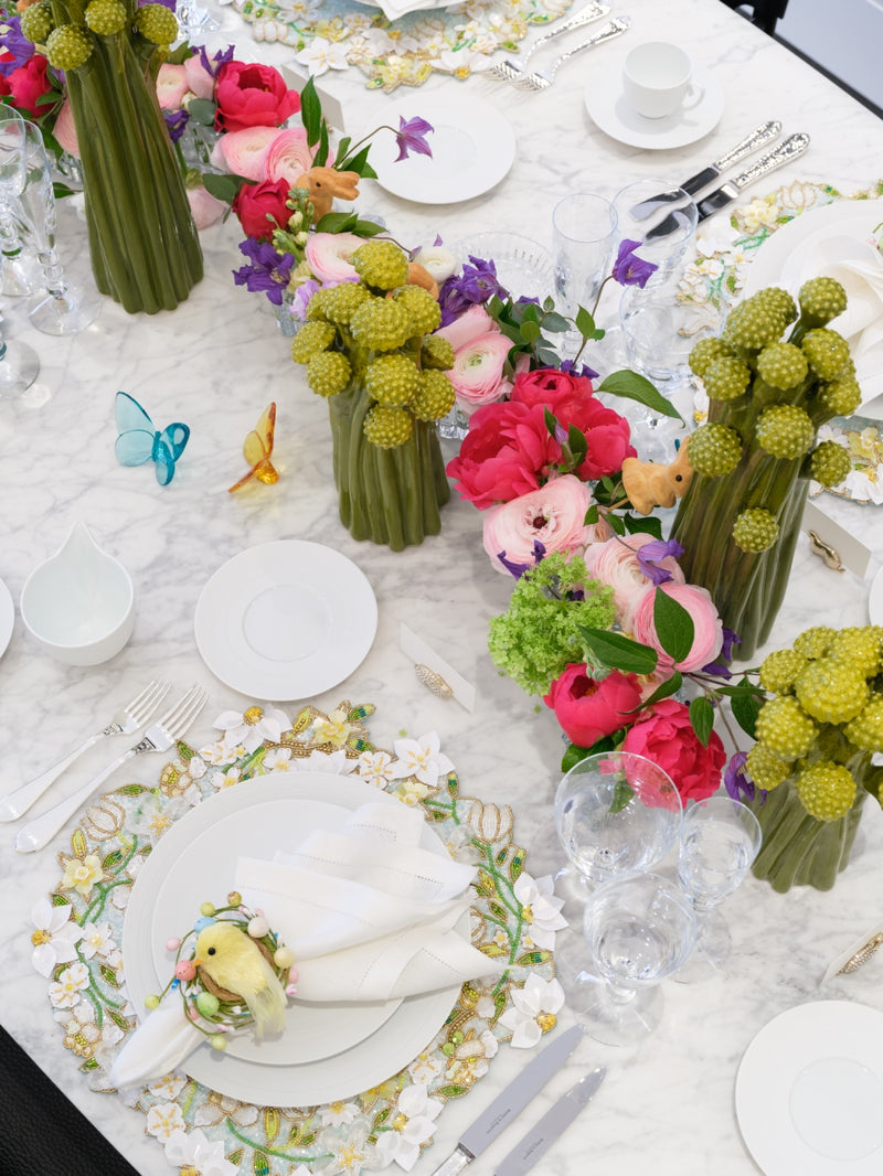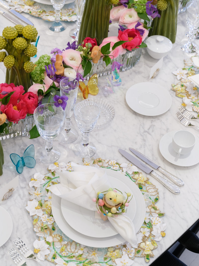 She started with beautifully beaded floral placemats by Kim Seybert in soft pastel tones and the sweetest chick napkin rings.