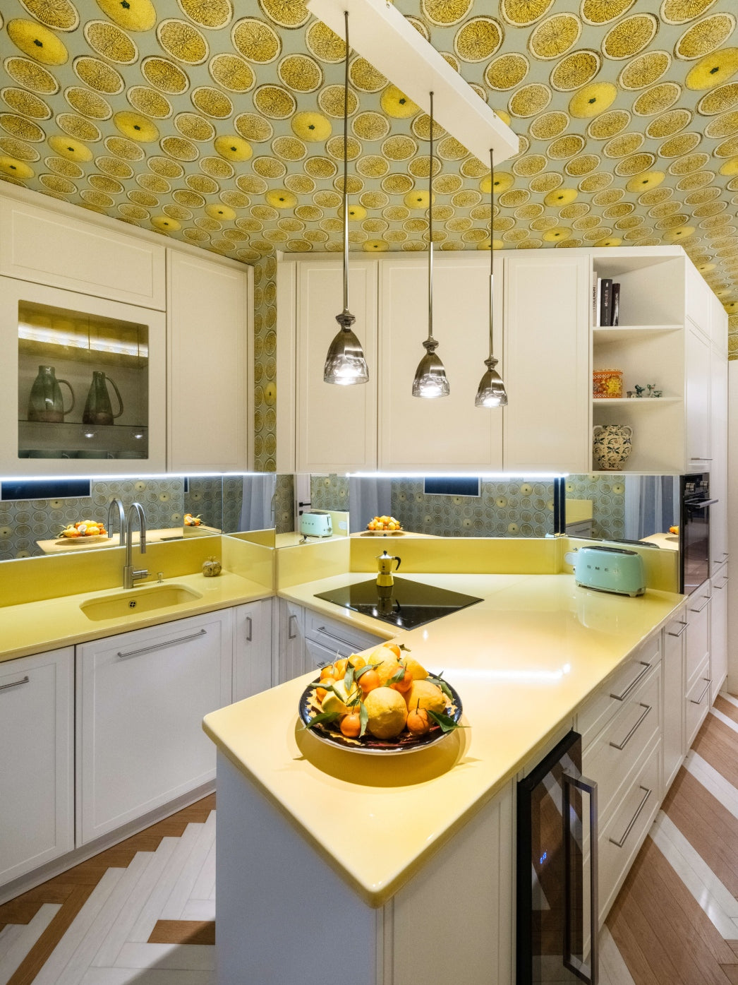 Sophie: The interior design of my apartment is inspired by the 50s and 60s and great artists such as Cocteau and Picasso. I wanted to keep the Mediterranean essence throughout the flat - my living room has a predominance of sage green to match the olive trees from my garden, and my kitchen has a custom yellow lava kitchen top as well as lemon wallpaper on the wall and ceilings! You will also find a series of lemon drawings and paintings which I designed during lockdown using different techniques.