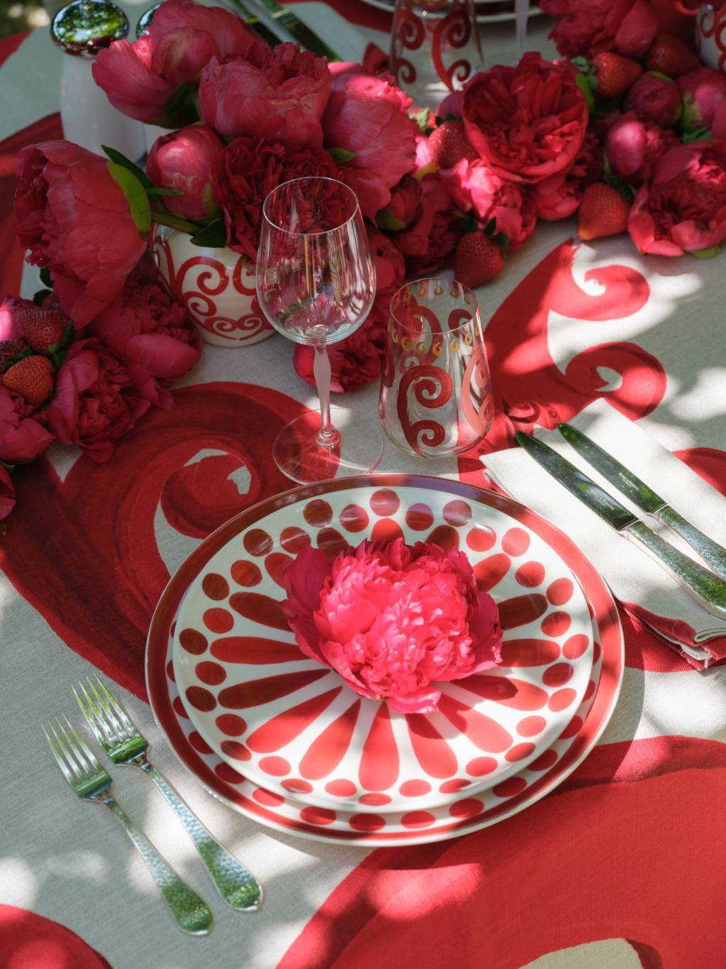 We chose refined china, glassware, and rich red linens from the Greek brand Themis Z, whose timeless aesthetic perfectly complemented the occasion. At the heart of the table, a lush arrangement of fresh red peonies and ripe strawberries added both color and seasonal charm. Guests enjoyed chilled rosé kindly offered by Hanikon, which brought the perfect touch of freshness to this celebratory afternoon.