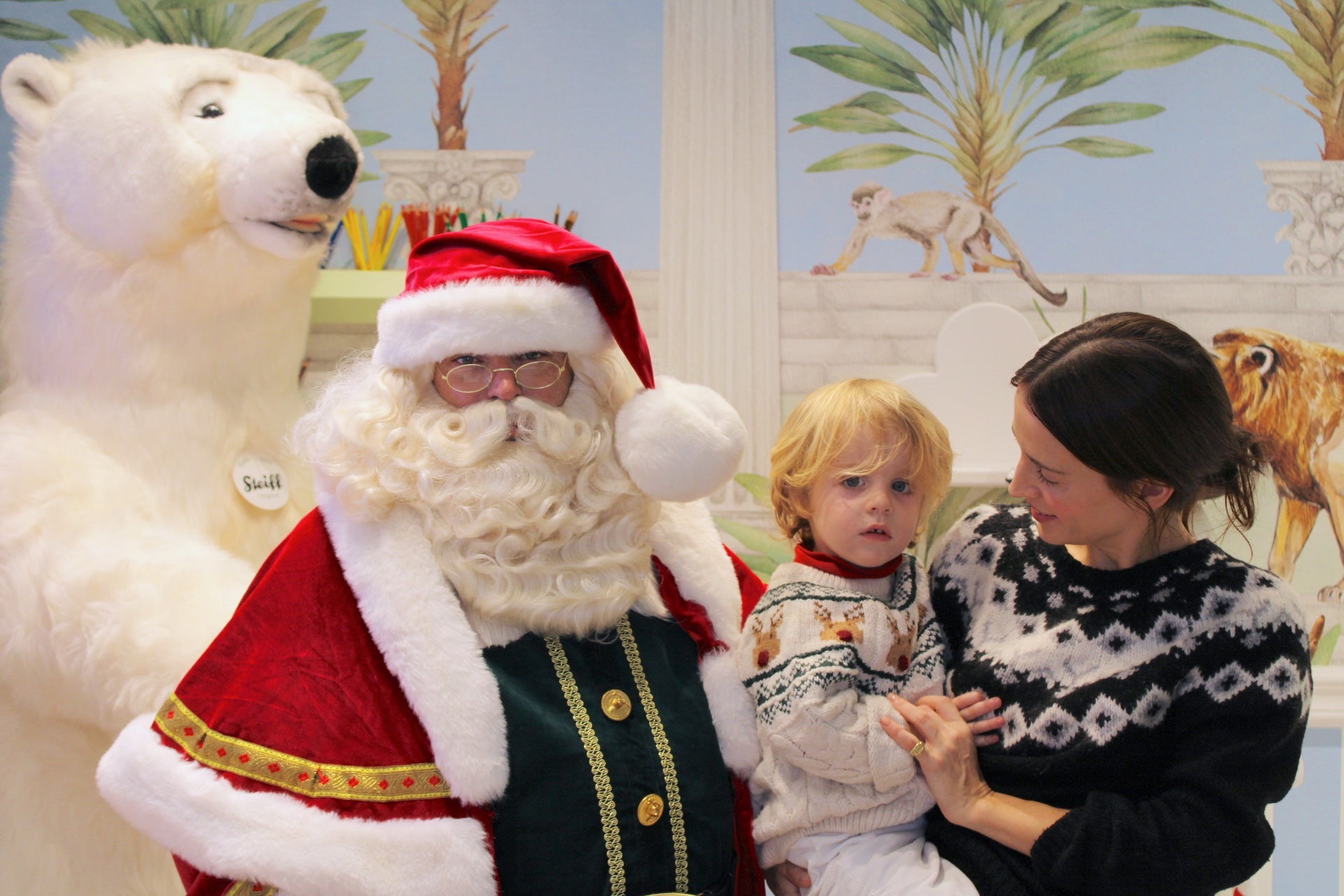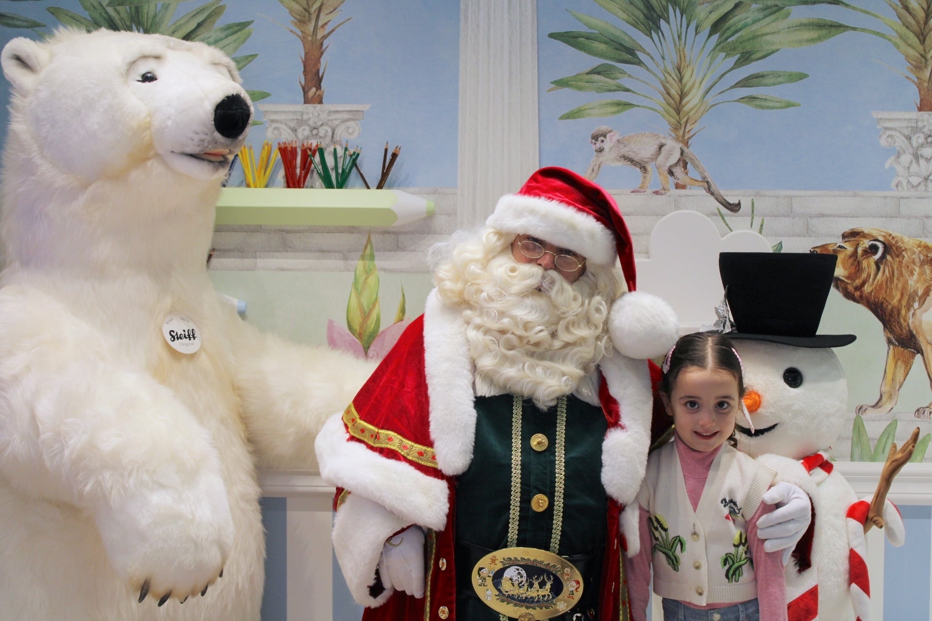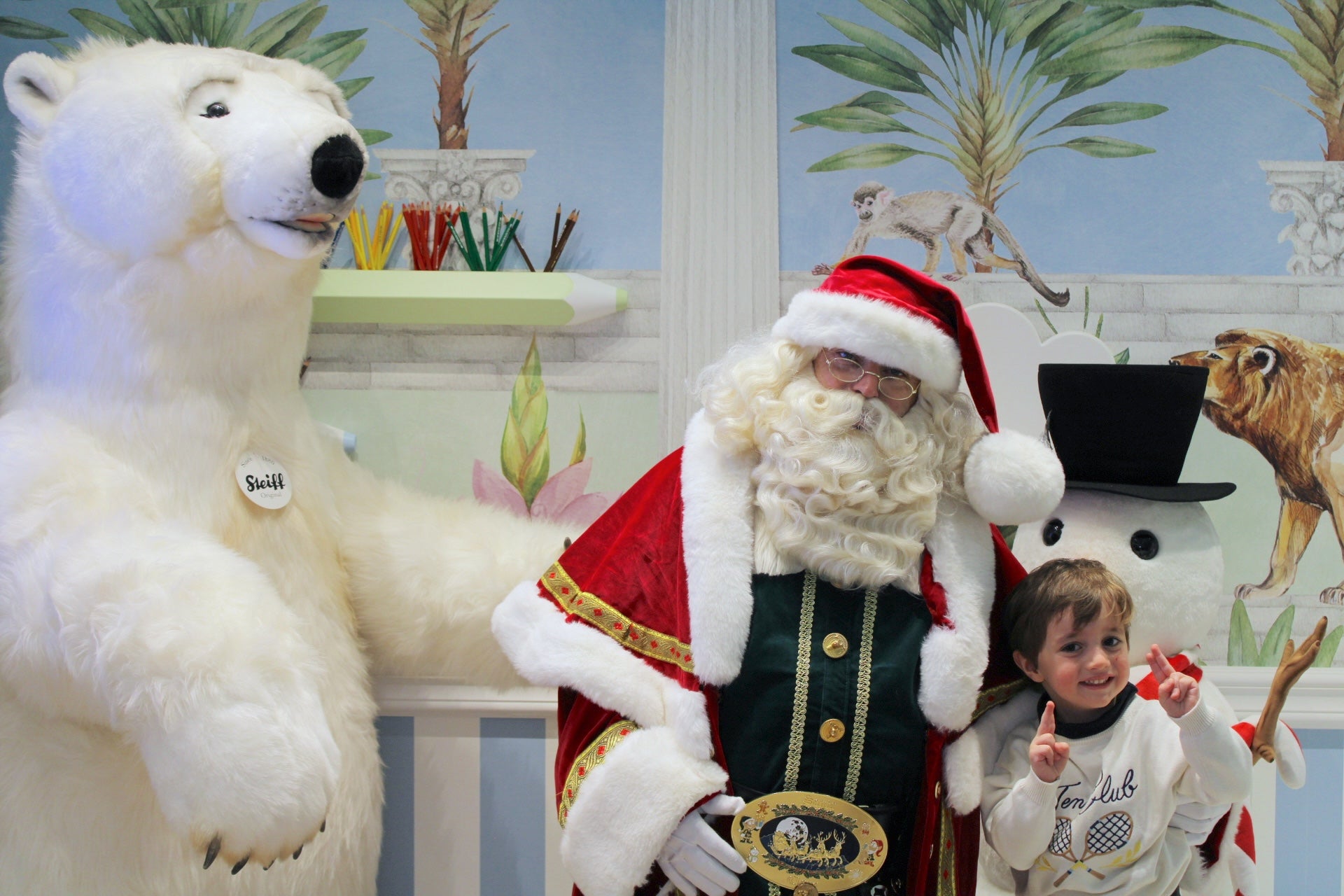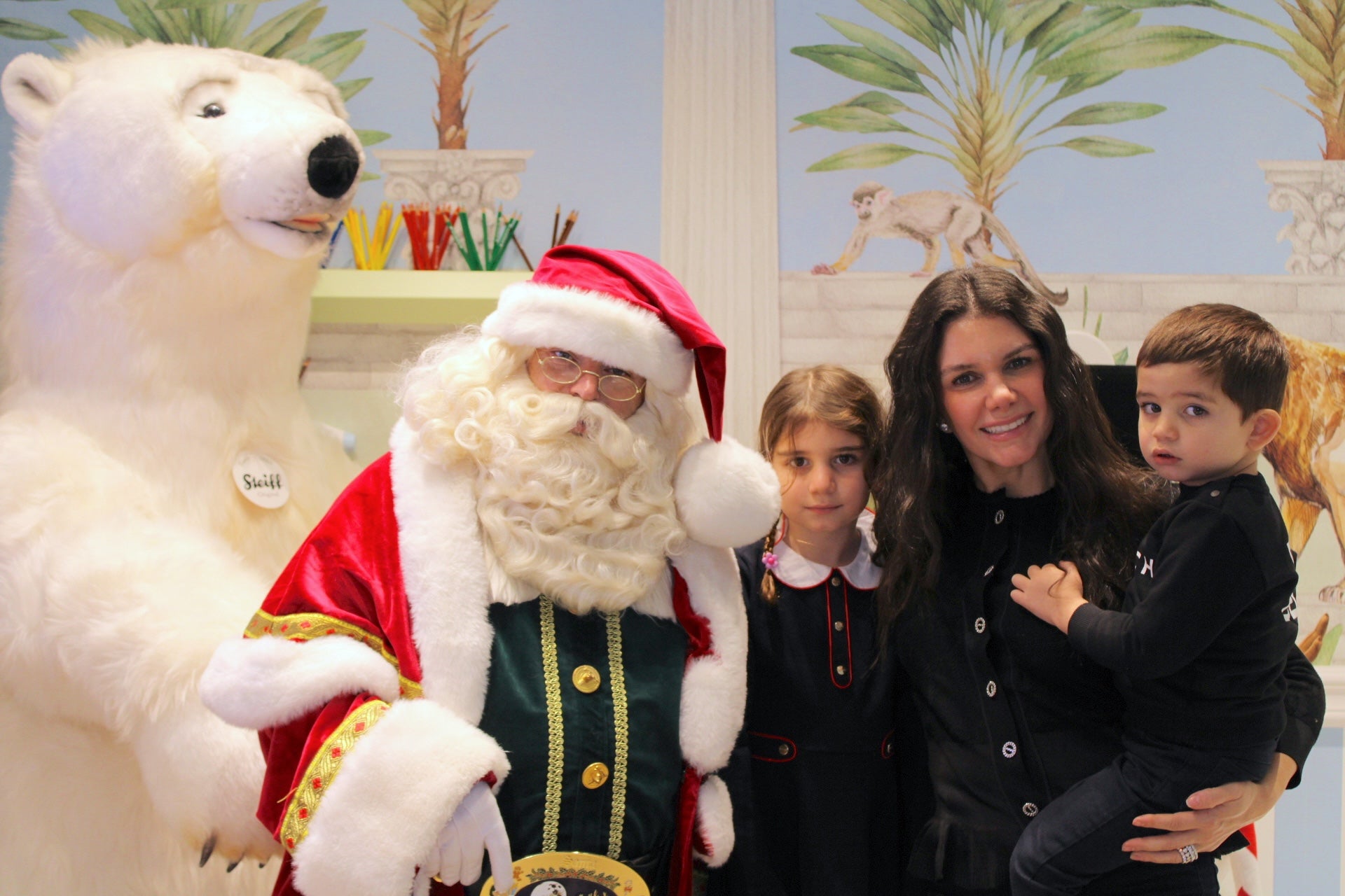 From 2 PM to 6 PM, our boutique at 4 Bd des Moulins transformed into a festive wonderland where children experienced the joy of meeting Santa in person. Against our signature tropical-inspired backdrop—with peacocks perched on classical columns, graceful giraffes, and playful lemurs amid palm trees—the holiday spirit came alive.