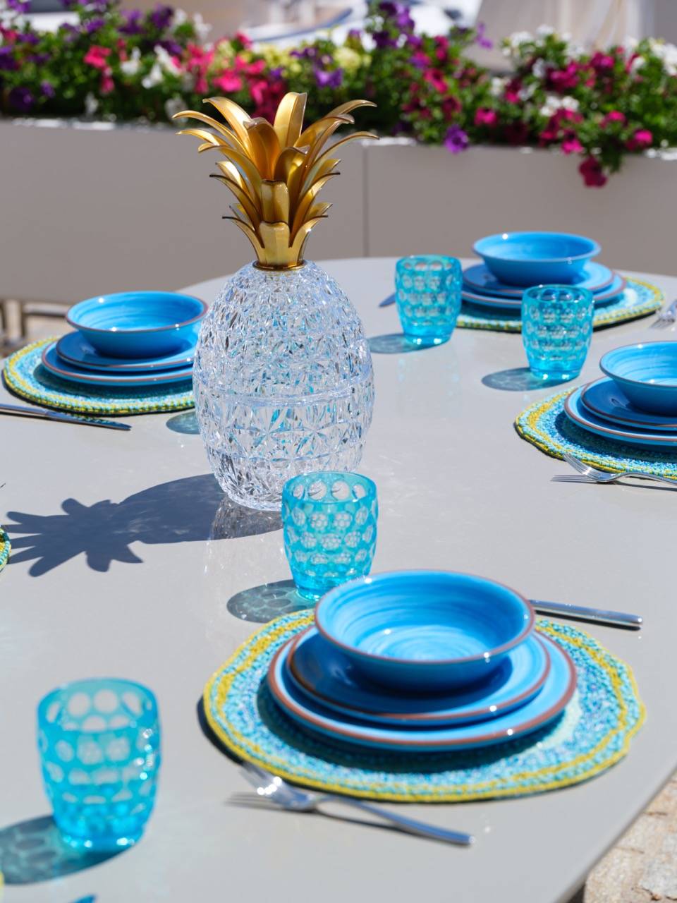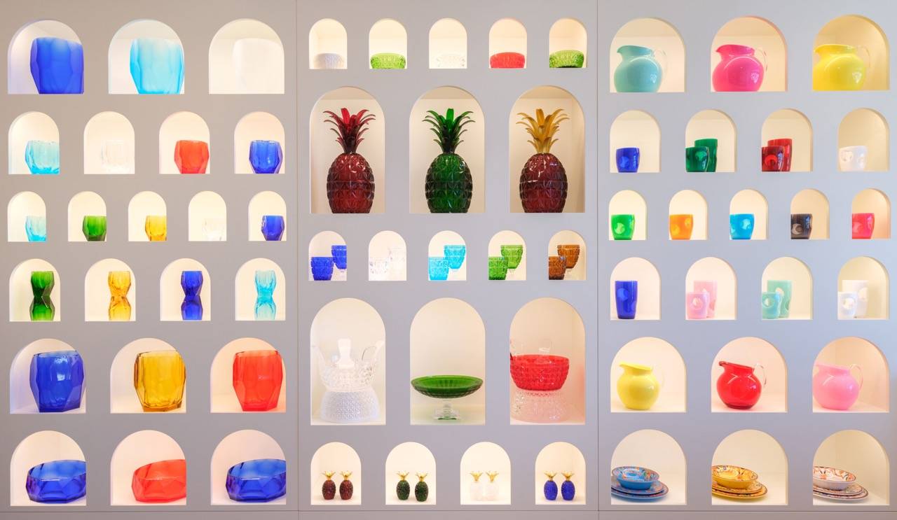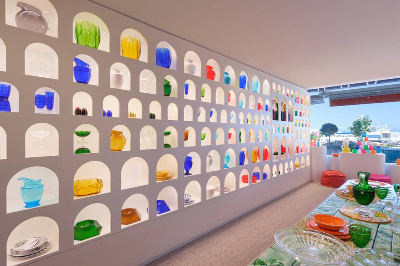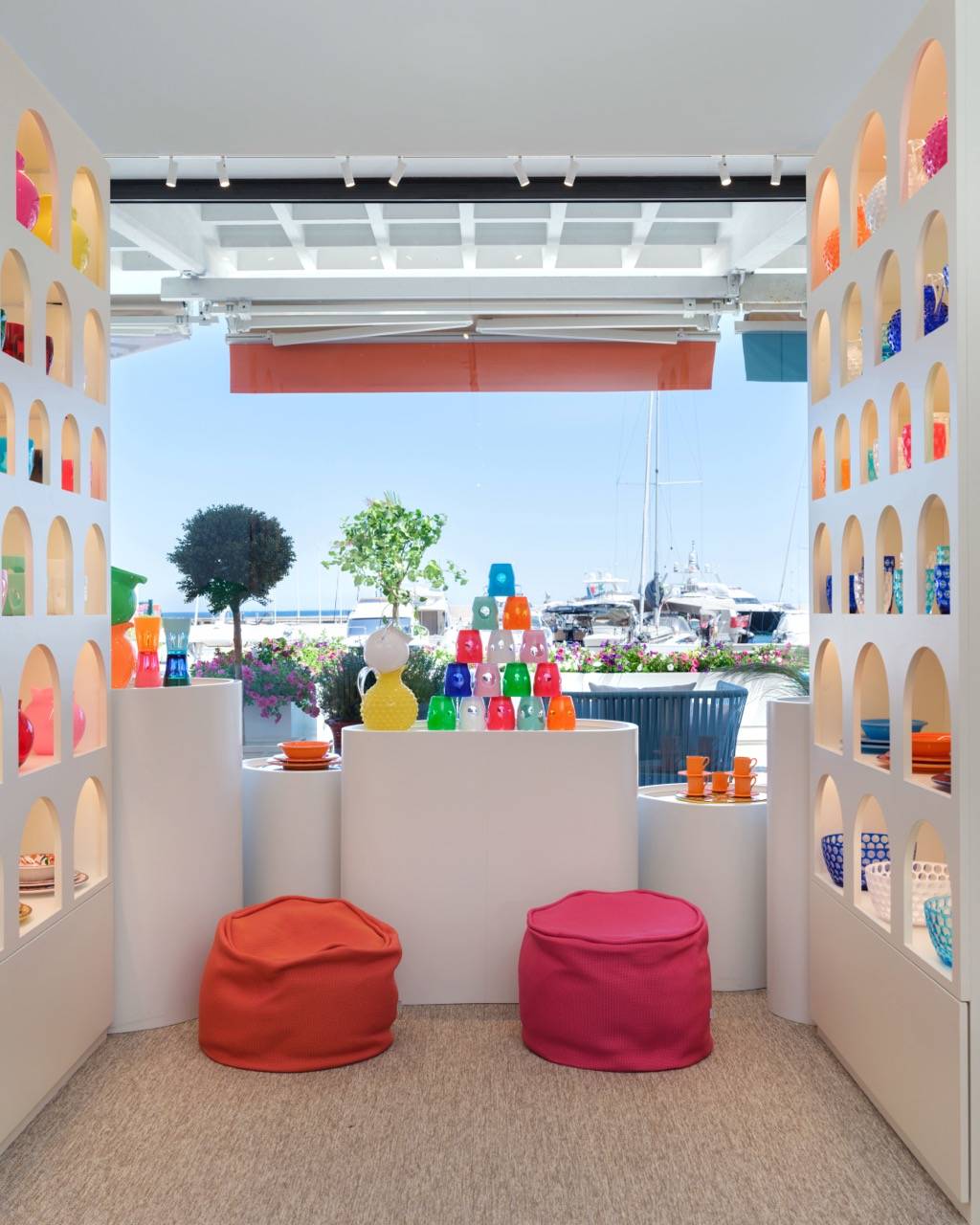 In a Mediterranean setting composed of arched shelving, rope flooring and white and yellow painted stripes, you will discover the glasses in every color of the rainbow.