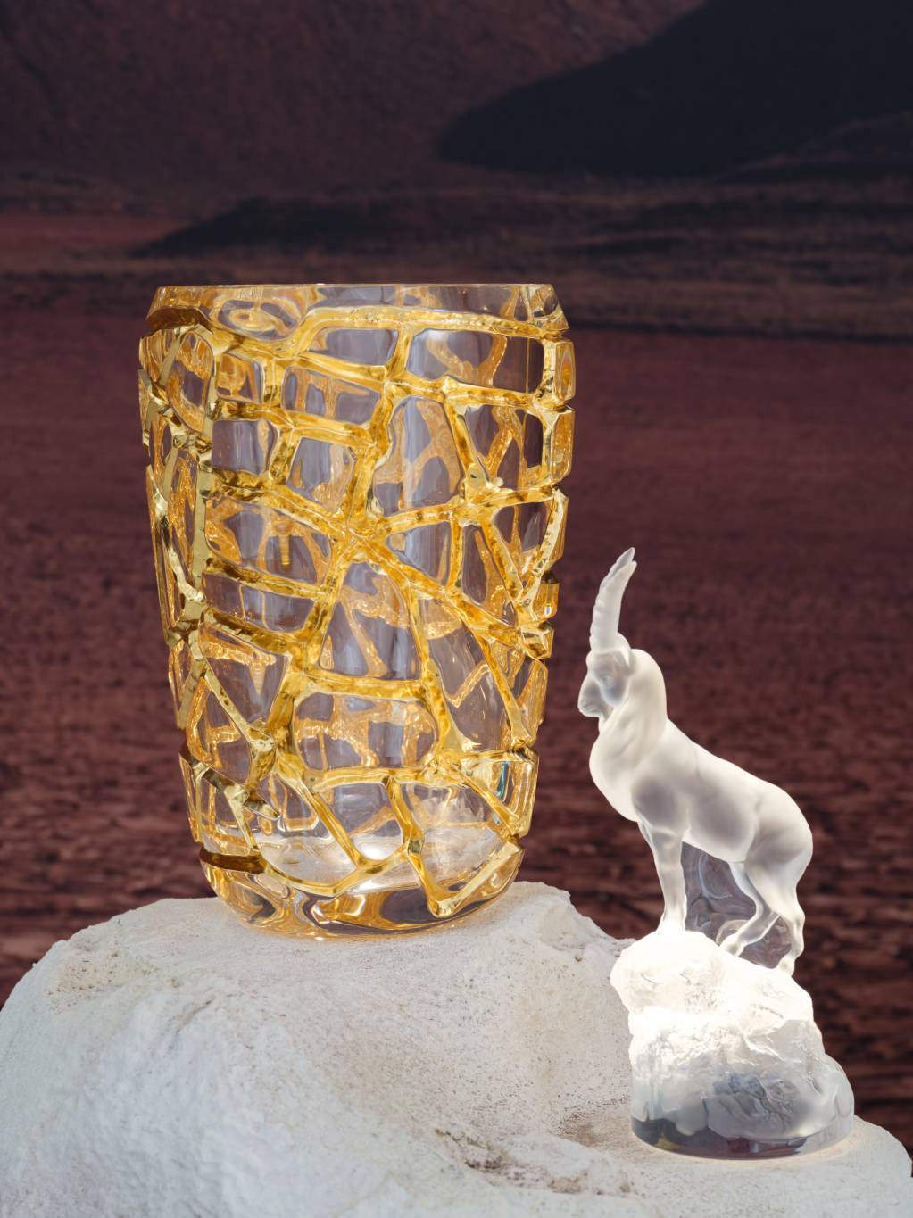 Each piece, from sumptuous vases in crystal and gold leaf to exquisite bowls, decanters, candles, to decorative objects such as baby elephants and ibexes, reflects the rich textures and earthy tones inspired by minerals and natural formations. The collection’s play of light and texture makes every item a striking statement of refined luxury.
