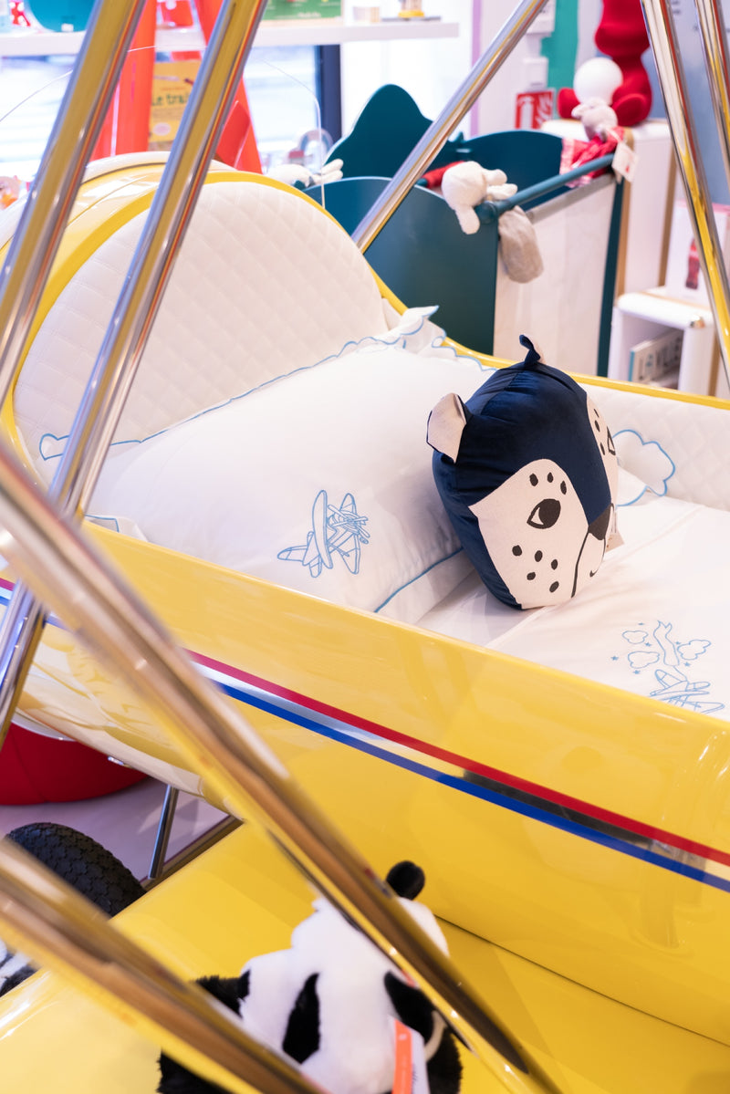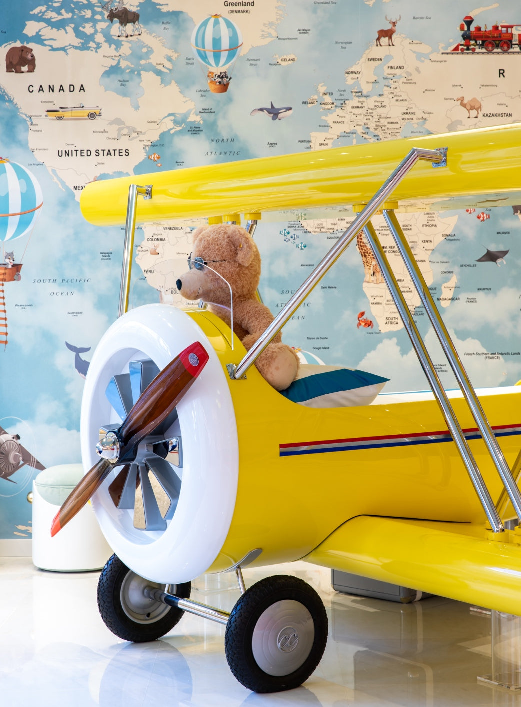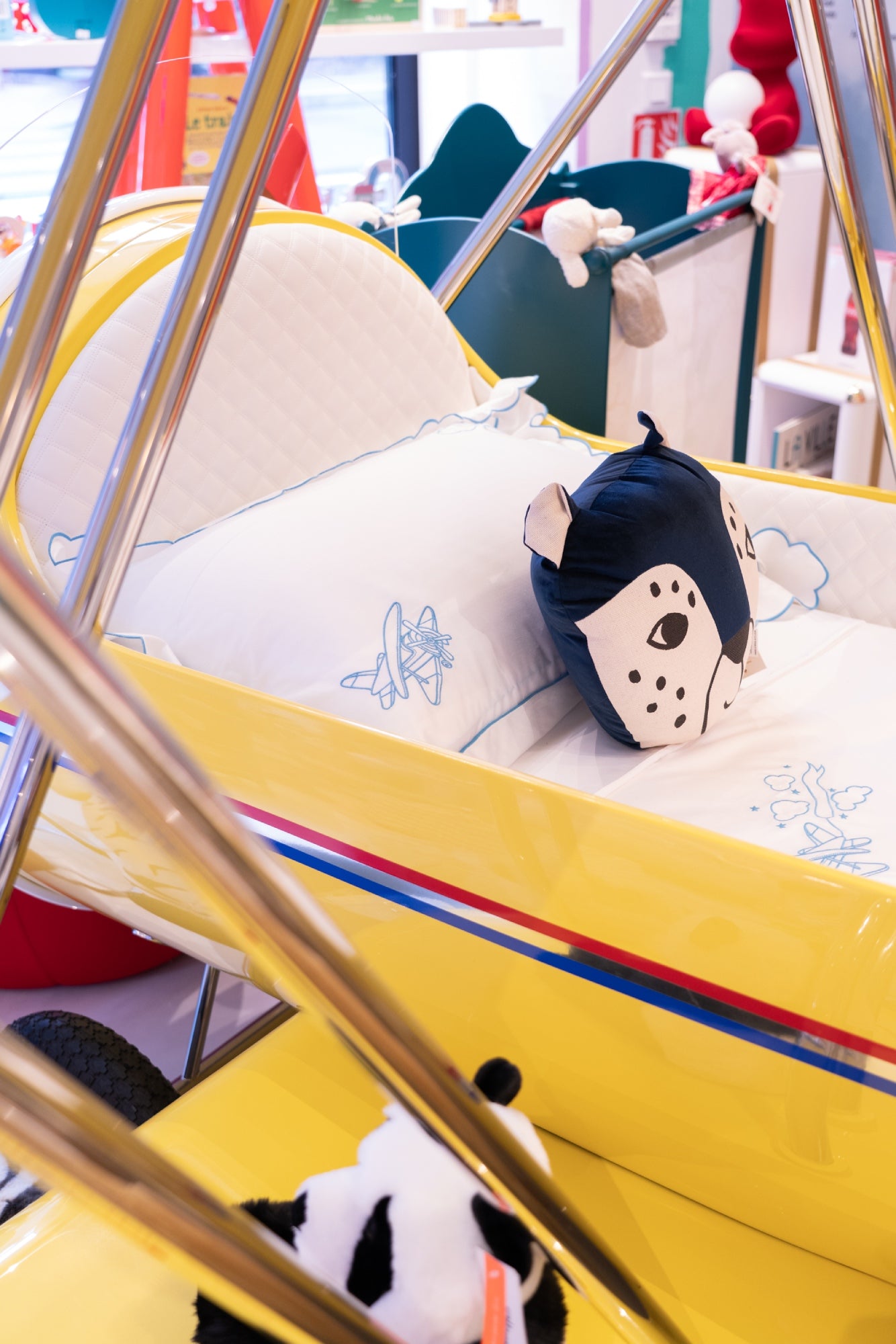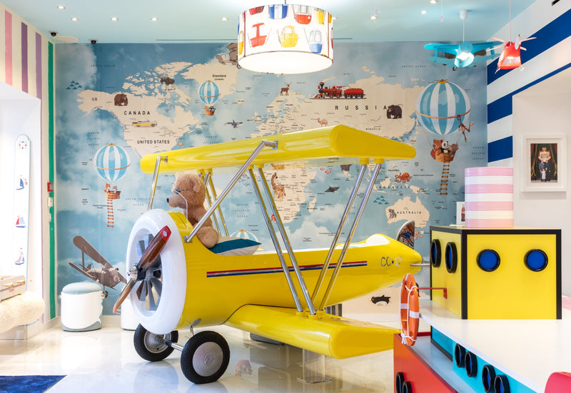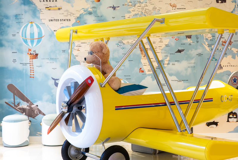 The centerpiece of this bedroom is the stunning Plane bed by Circu. With its aircraft inspired design and attention to detail, this bed will transport your child to a world of adventure every night. And with matching embroidered bed linen and map wallpaper, your child will be surrounded by a playful yet educational atmosphere.