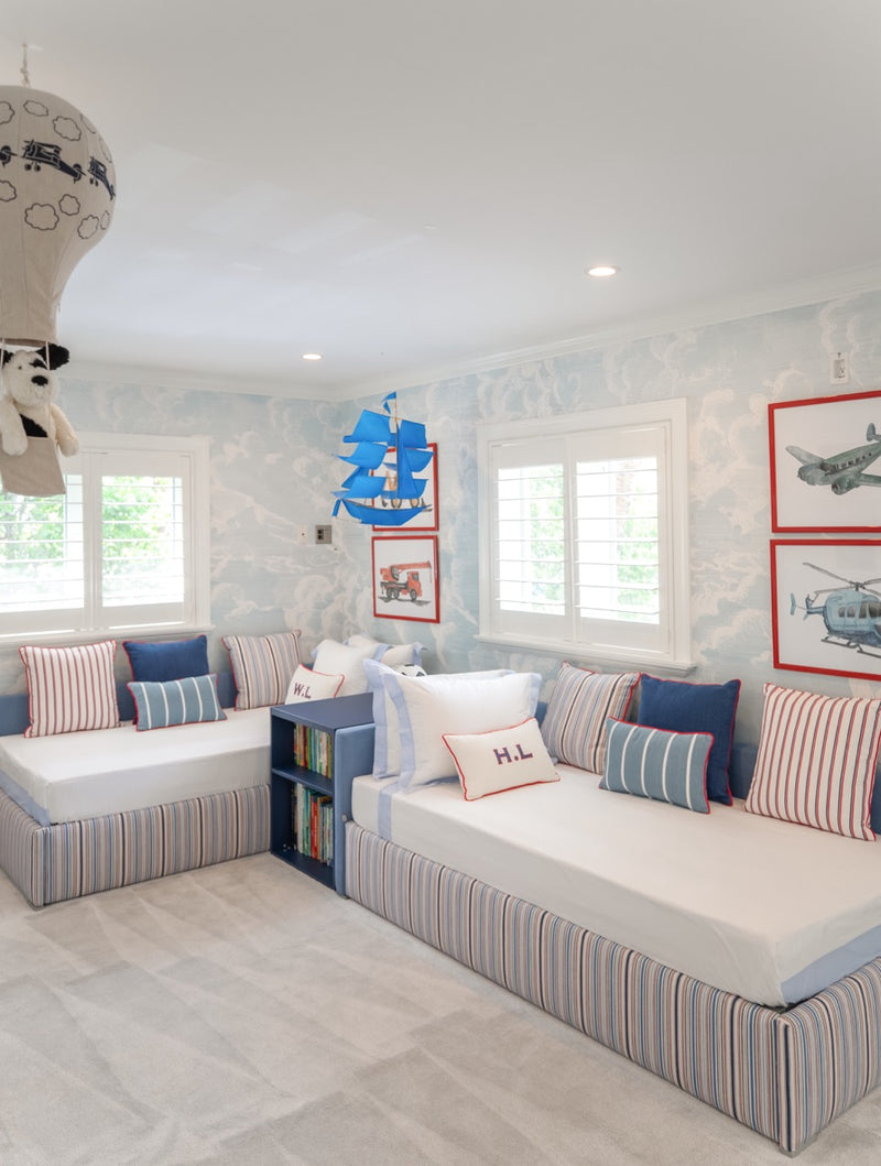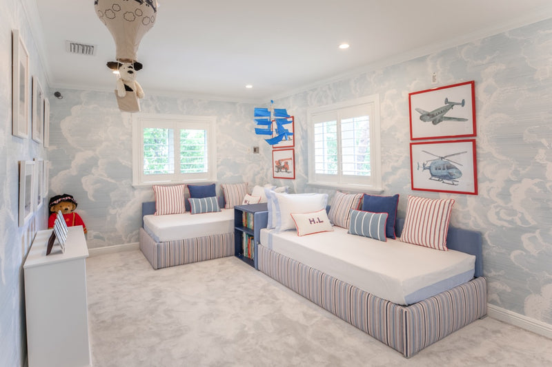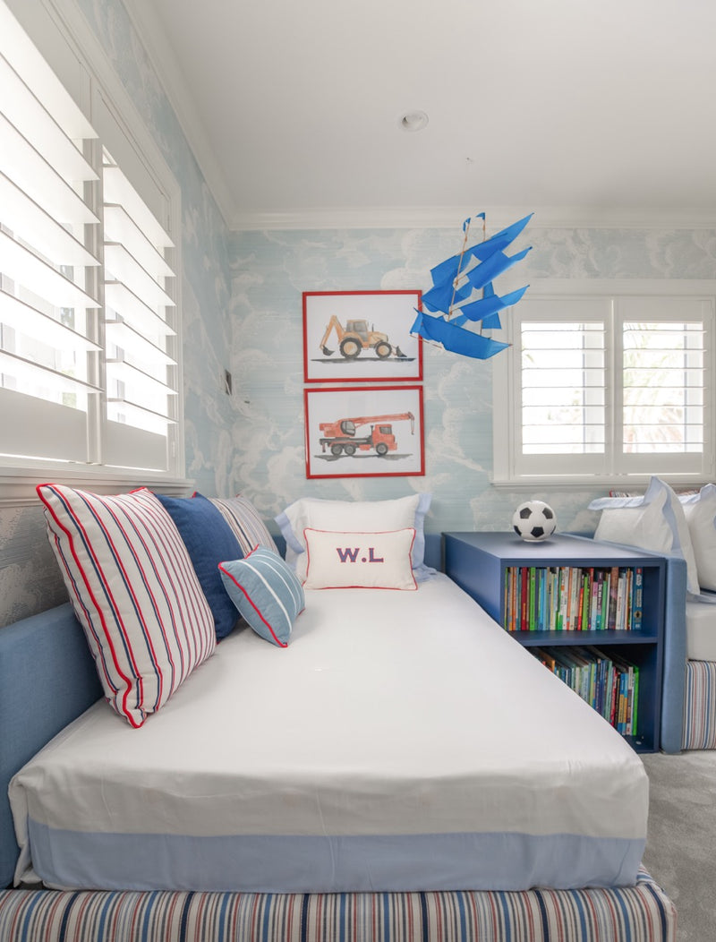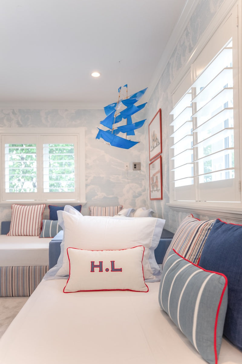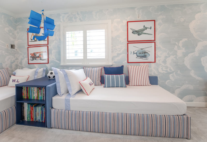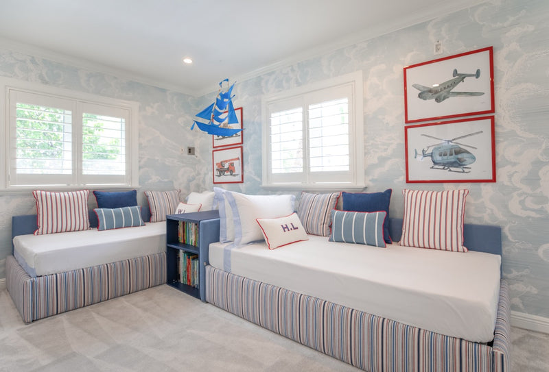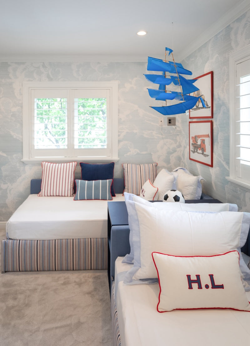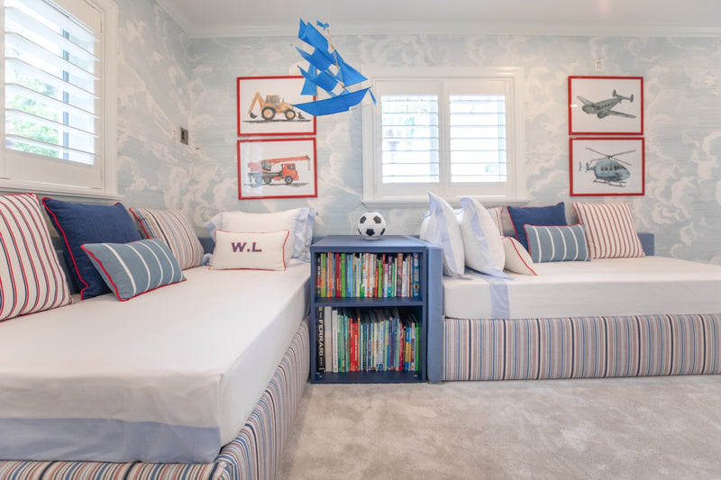 We then designed custom beds and had fun mixing and matching solid colors and stripes of different sizes for the cushions. We maintained an “All-American” look with tones of blue, red, and white, while making the space functional and spacious with an L-shaped layout for the beds.