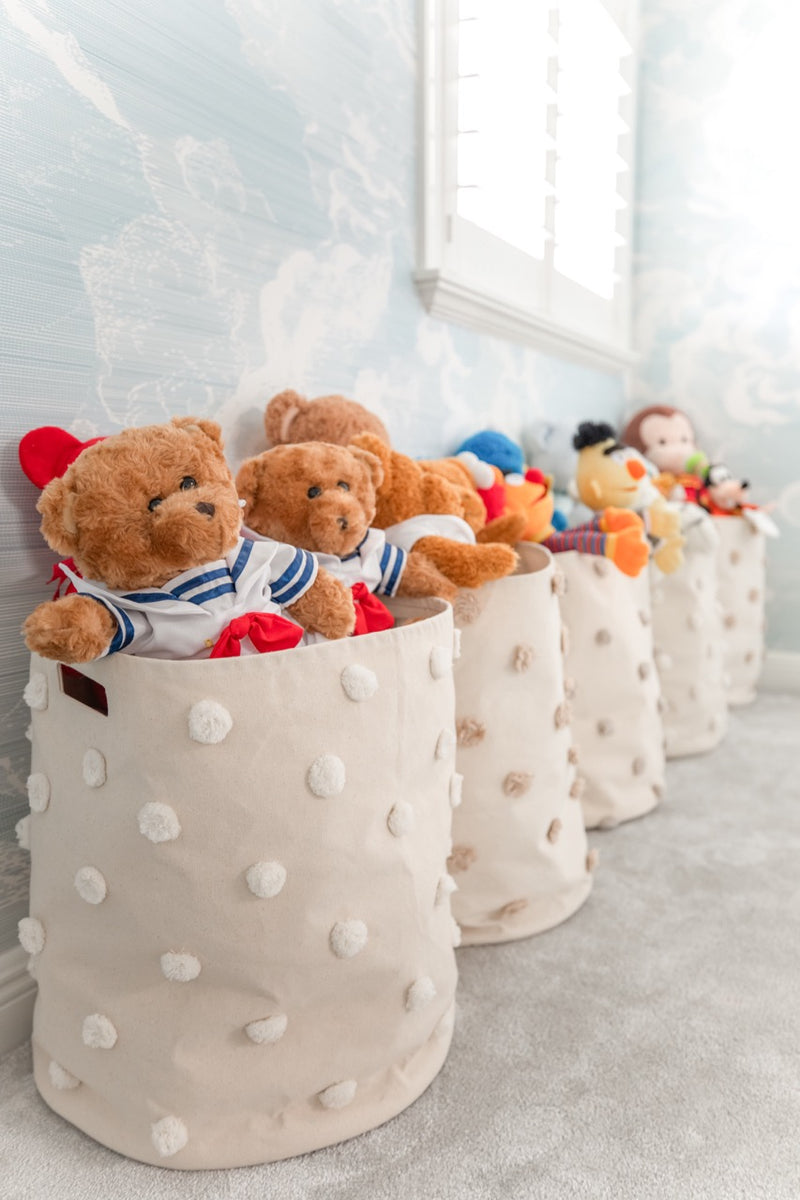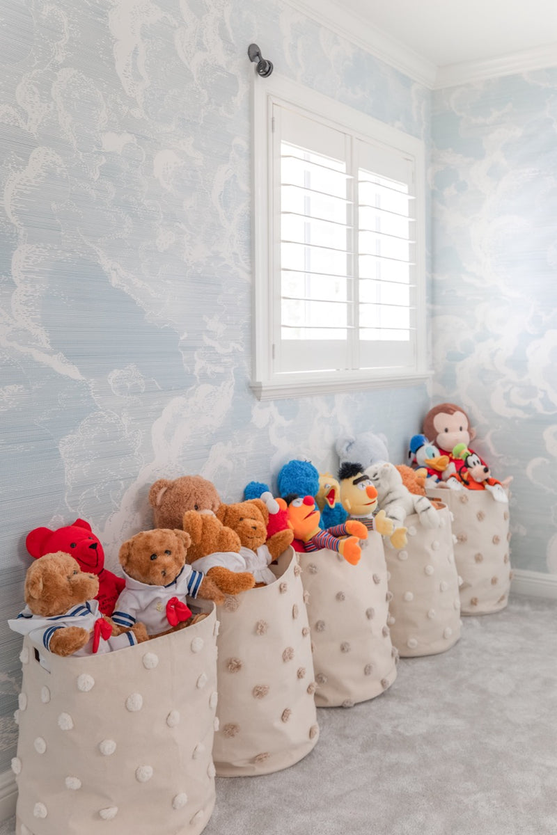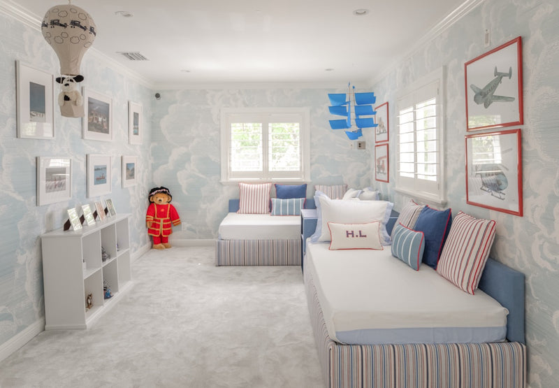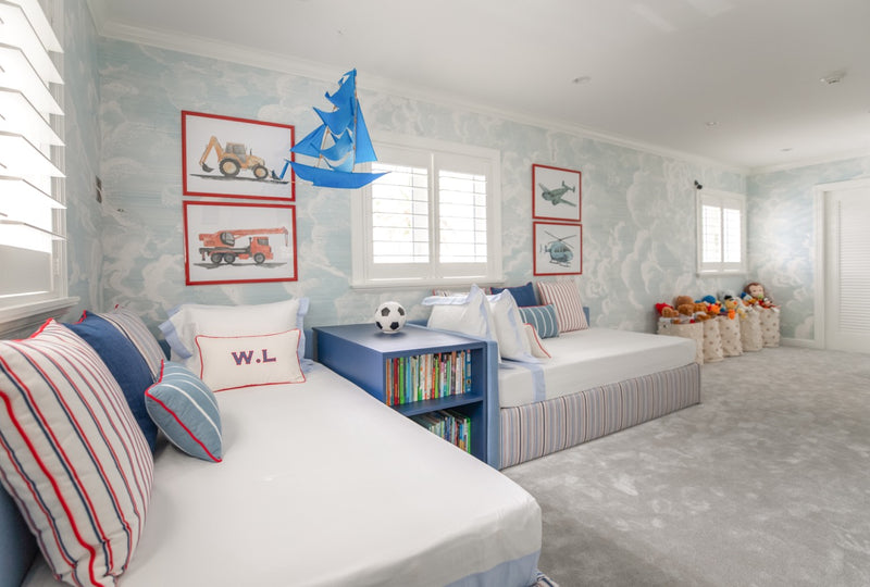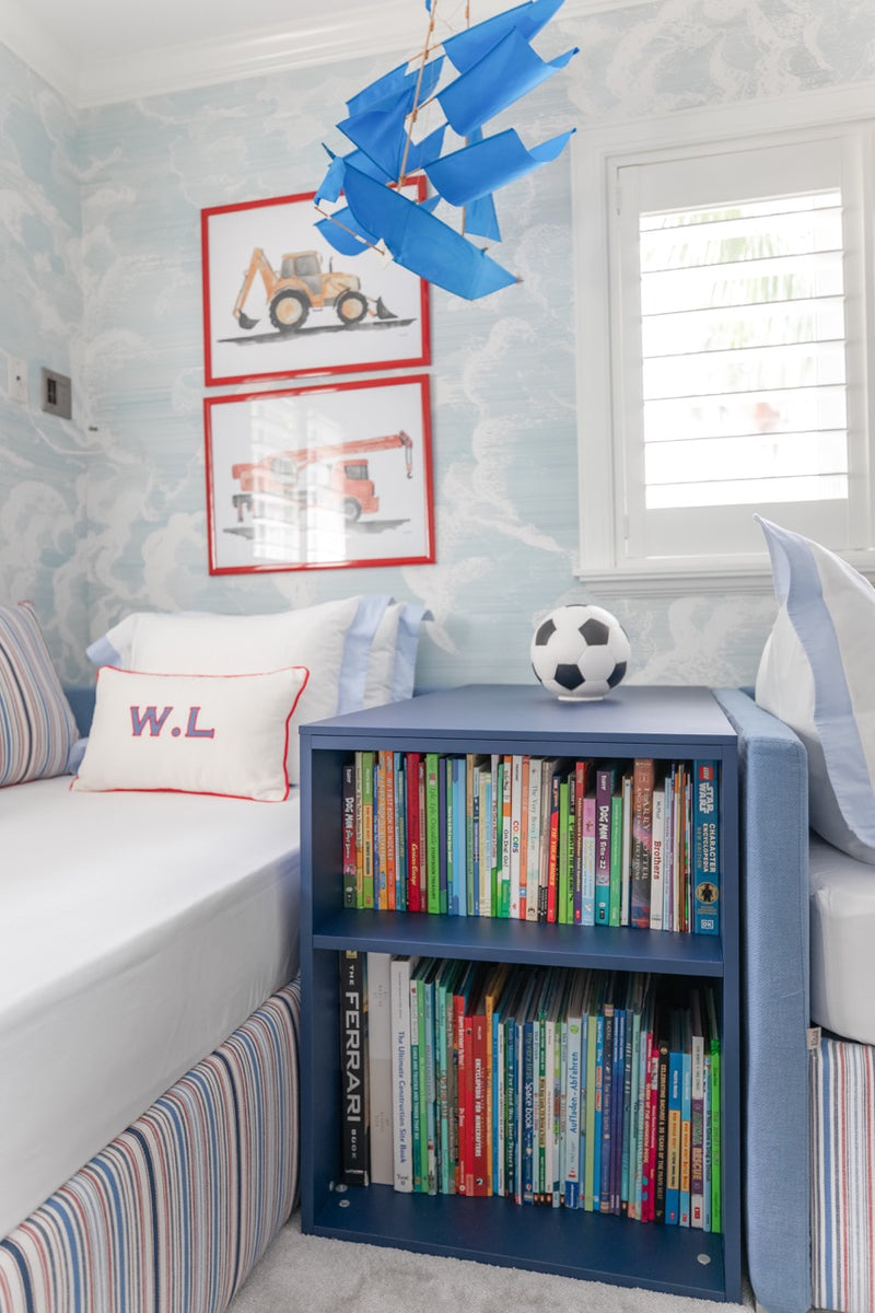 For extra storage, we placed a customized nightstand to display the boys' books and a long storage unit for their various toys. To add a personal touch, we designed our signature cushions featuring their initials and allowed the brothers to choose their favorite modes of transport.