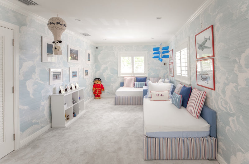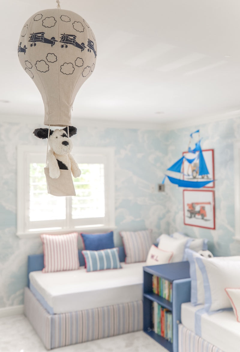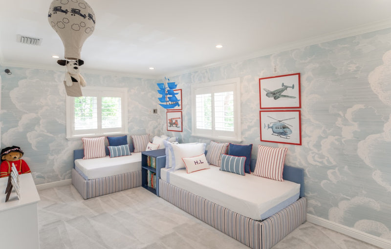 For this twin boys' bedroom, we decided, as usual, to start with the wallpaper, choosing a cloud design to create a magical atmosphere.