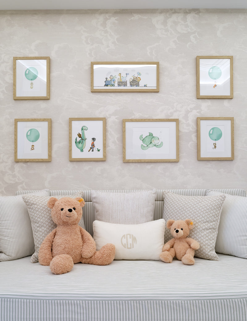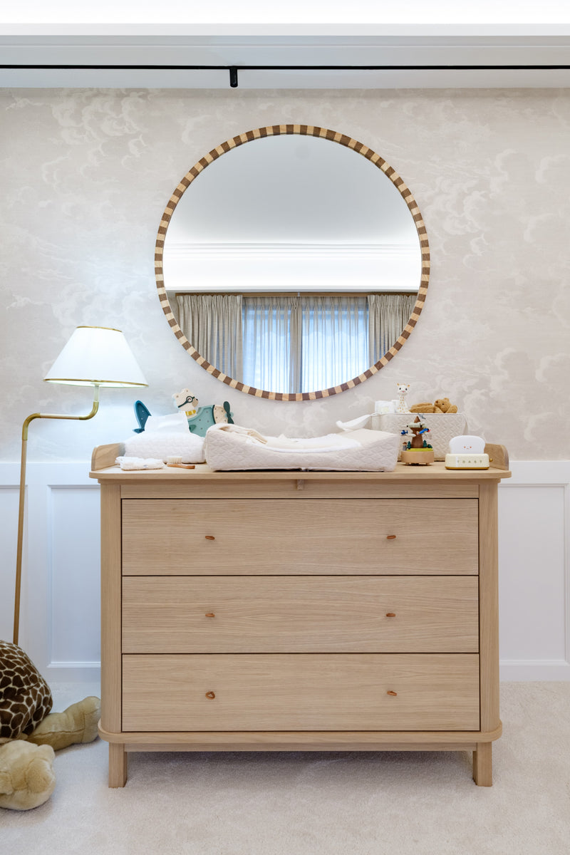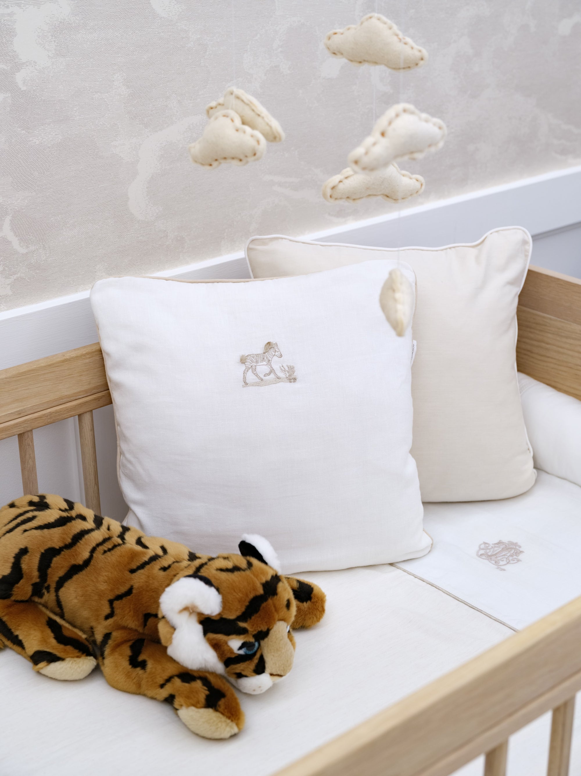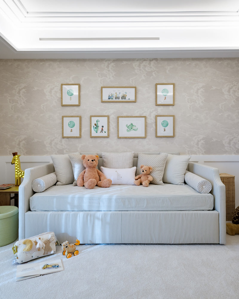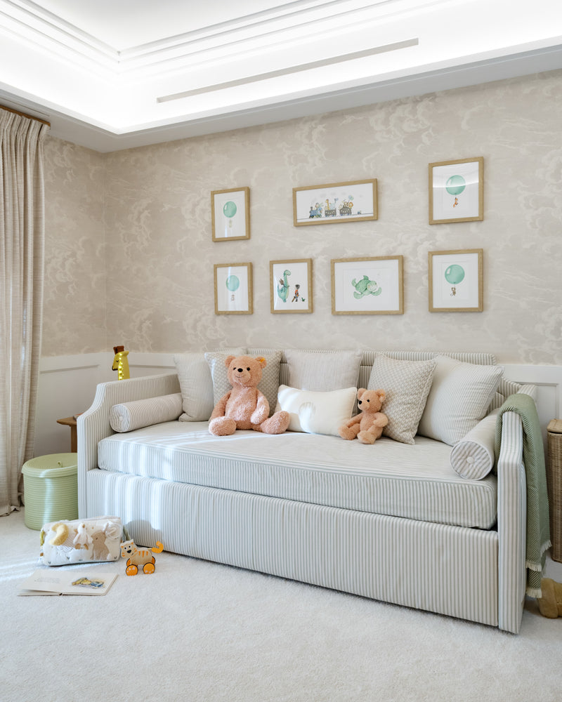 Animals in the Sky, this nursery was envisioned as a calm, gender-neutral haven. Soft tones, airy textures, and natural materials create an atmosphere that feels like drifting through a quiet sky. Light oak furniture by Oliver Furniture introduces warmth and Scandinavian refinement, anchoring the room with award-winning craftsmanship. A custom daybed in a subtle green stripe adds a tailored note, layered with textured cushions and delicate embroidery of the baby’s initials for a personal touch.