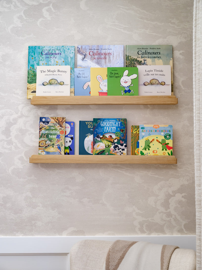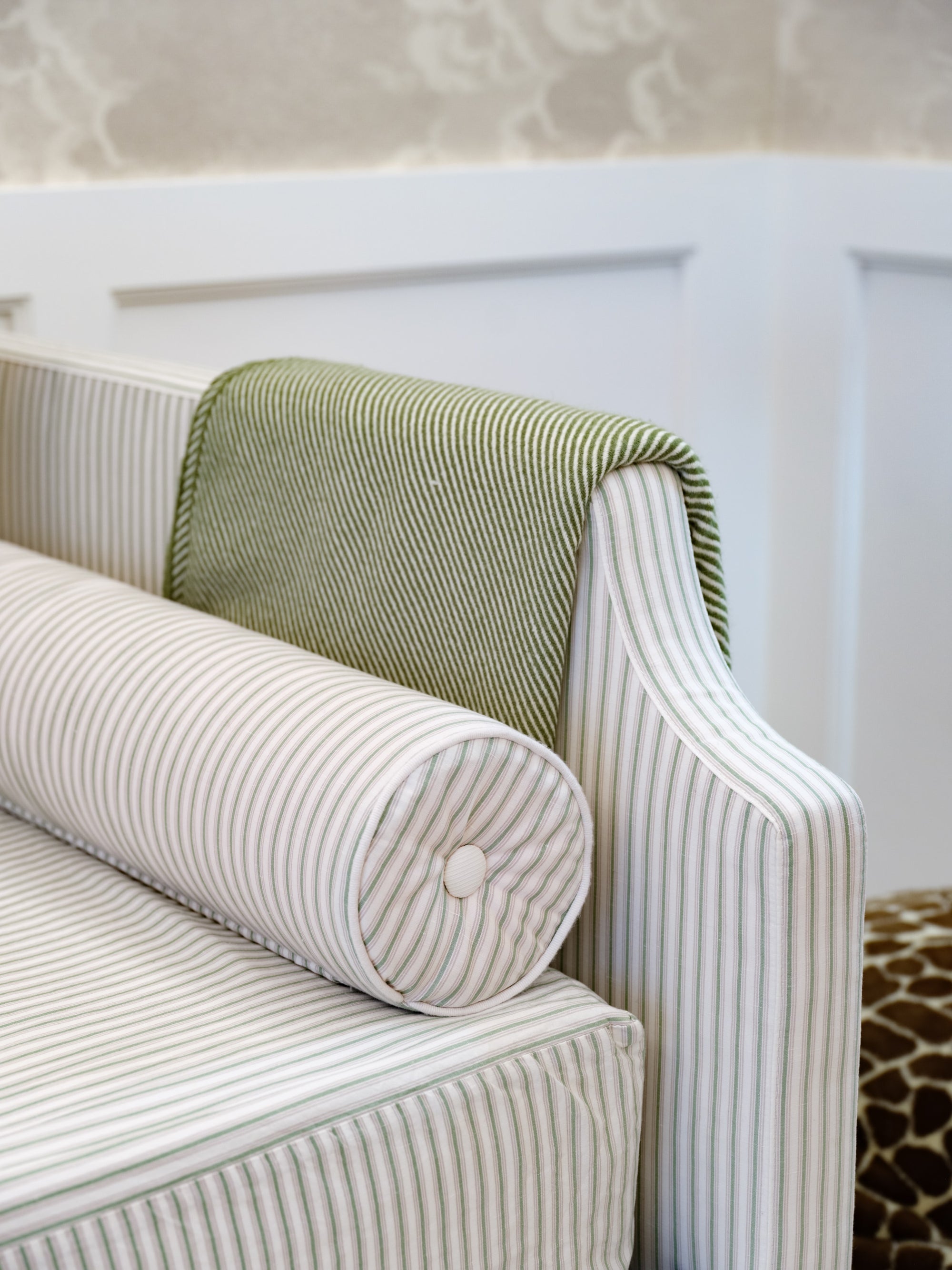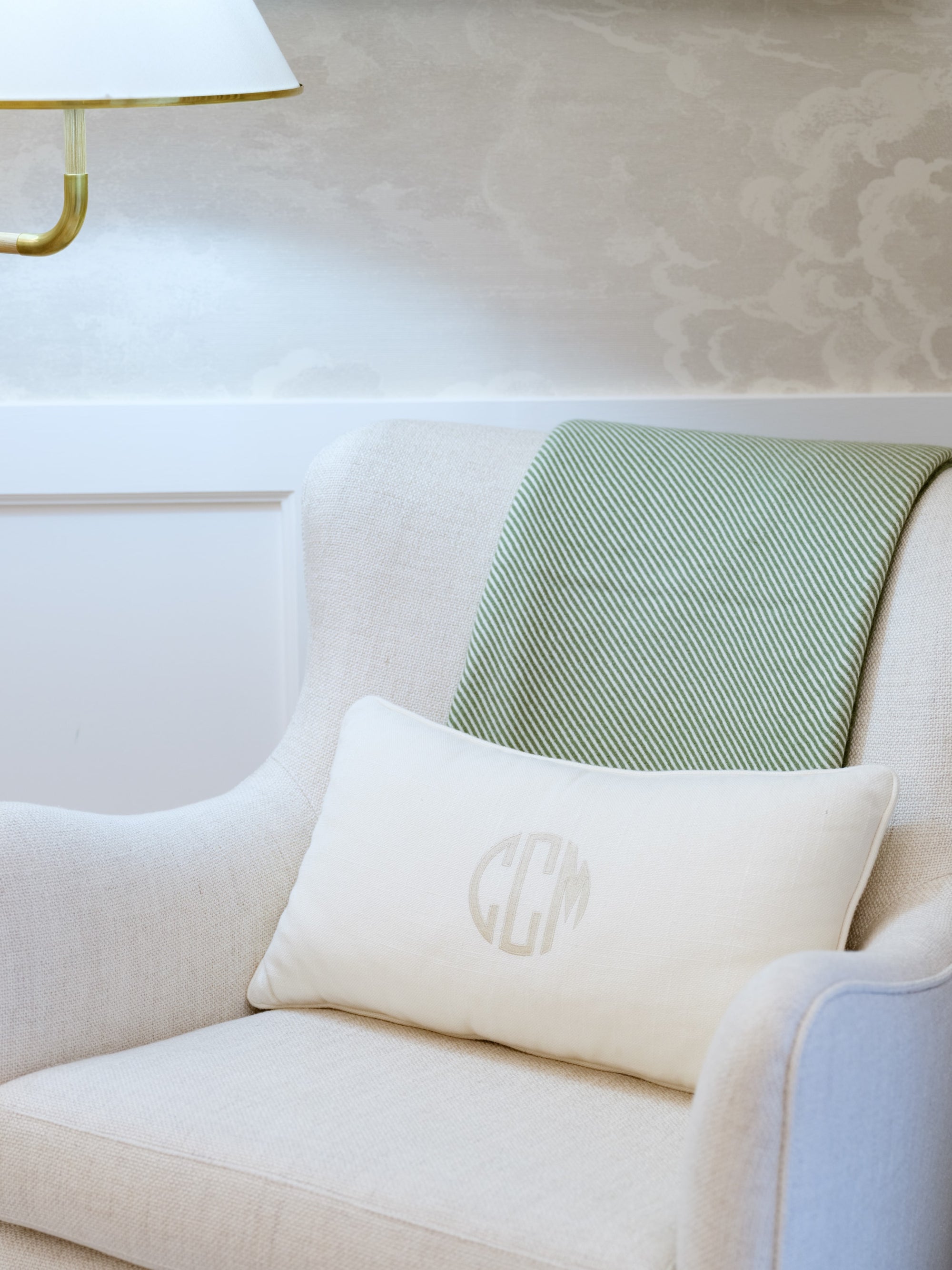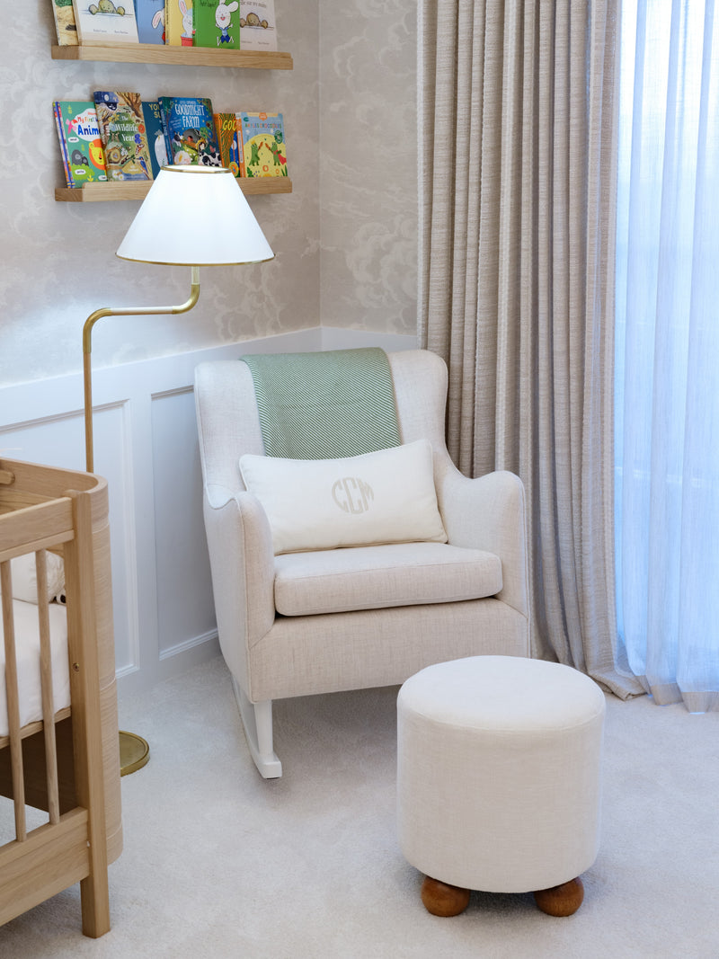 Animals in the Sky, this nursery was envisioned as a calm, gender-neutral haven. Soft tones, airy textures, and natural materials create an atmosphere that feels like drifting through a quiet sky. Light oak furniture by Oliver Furniture introduces warmth and Scandinavian refinement, anchoring the room with award-winning craftsmanship. A custom daybed in a subtle green stripe adds a tailored note, layered with textured cushions and delicate embroidery of the baby’s initials for a personal touch.