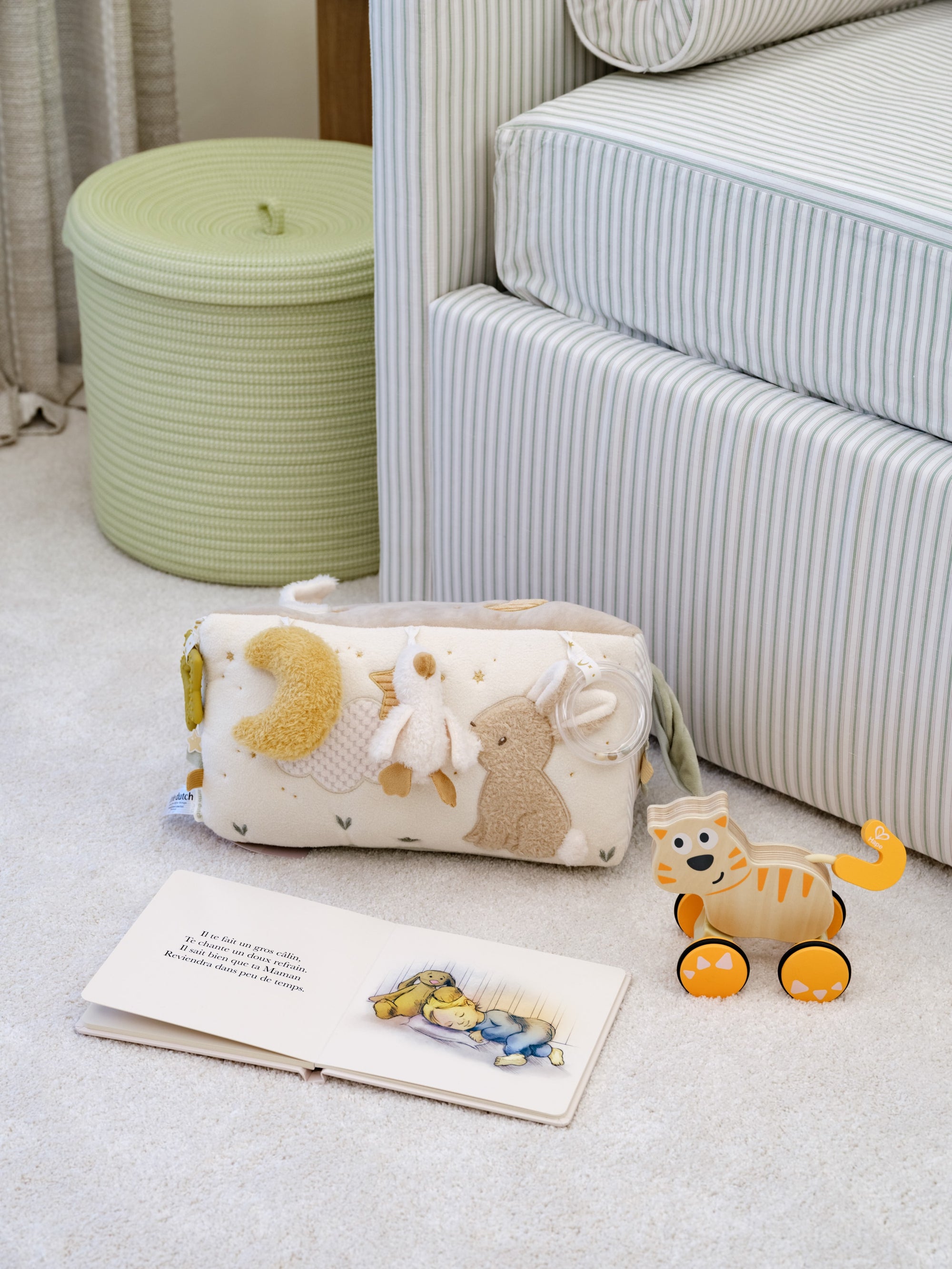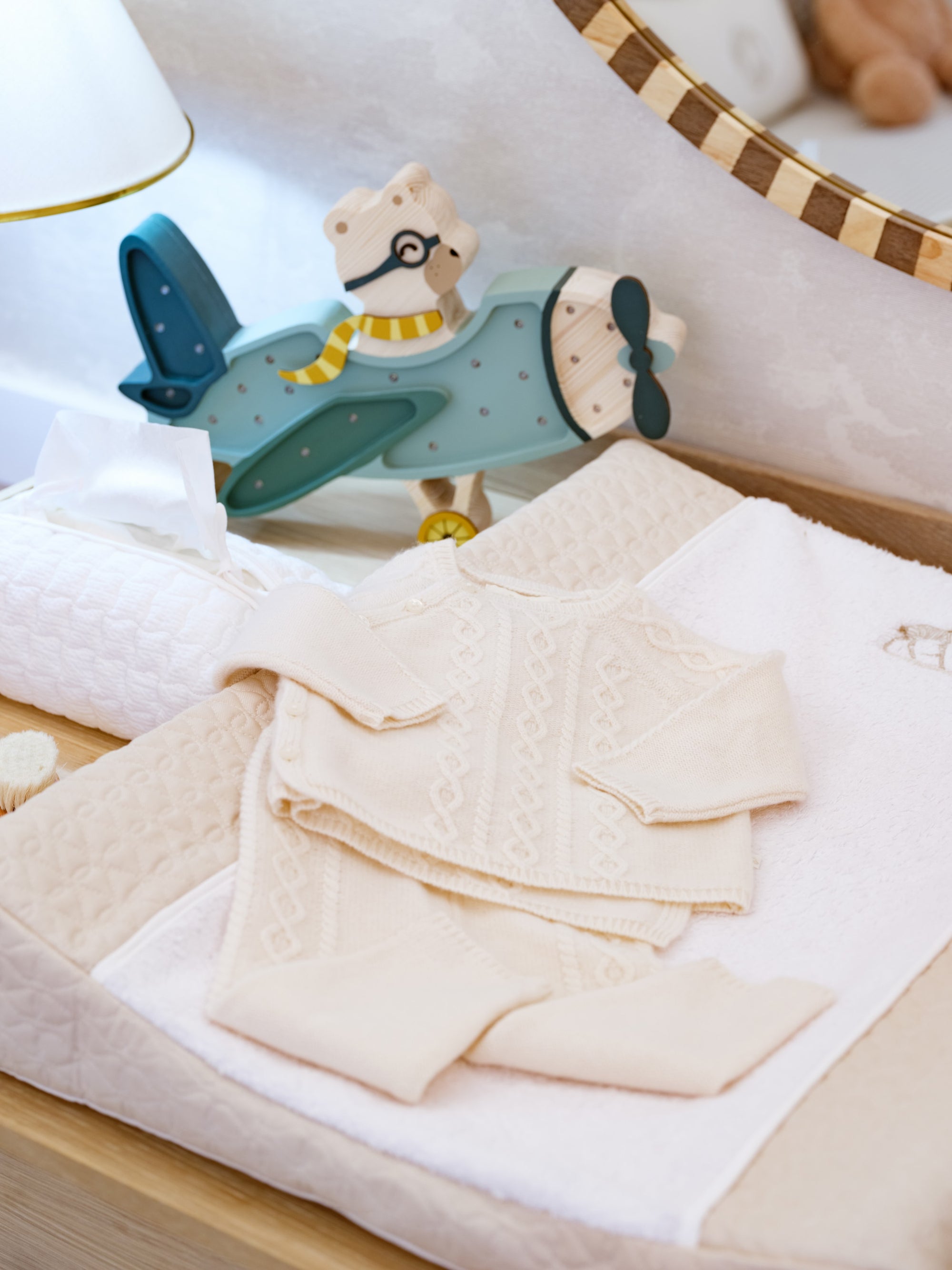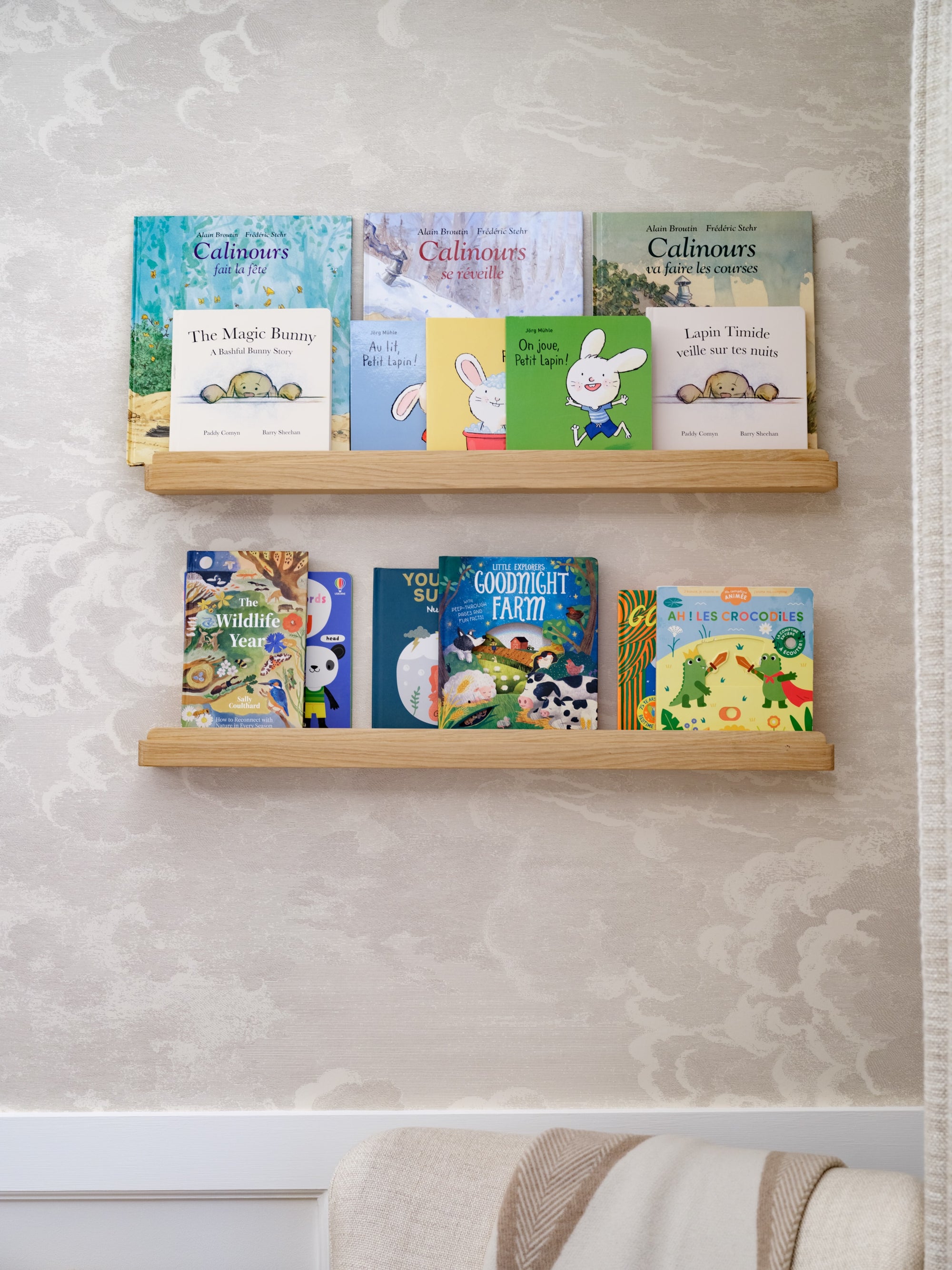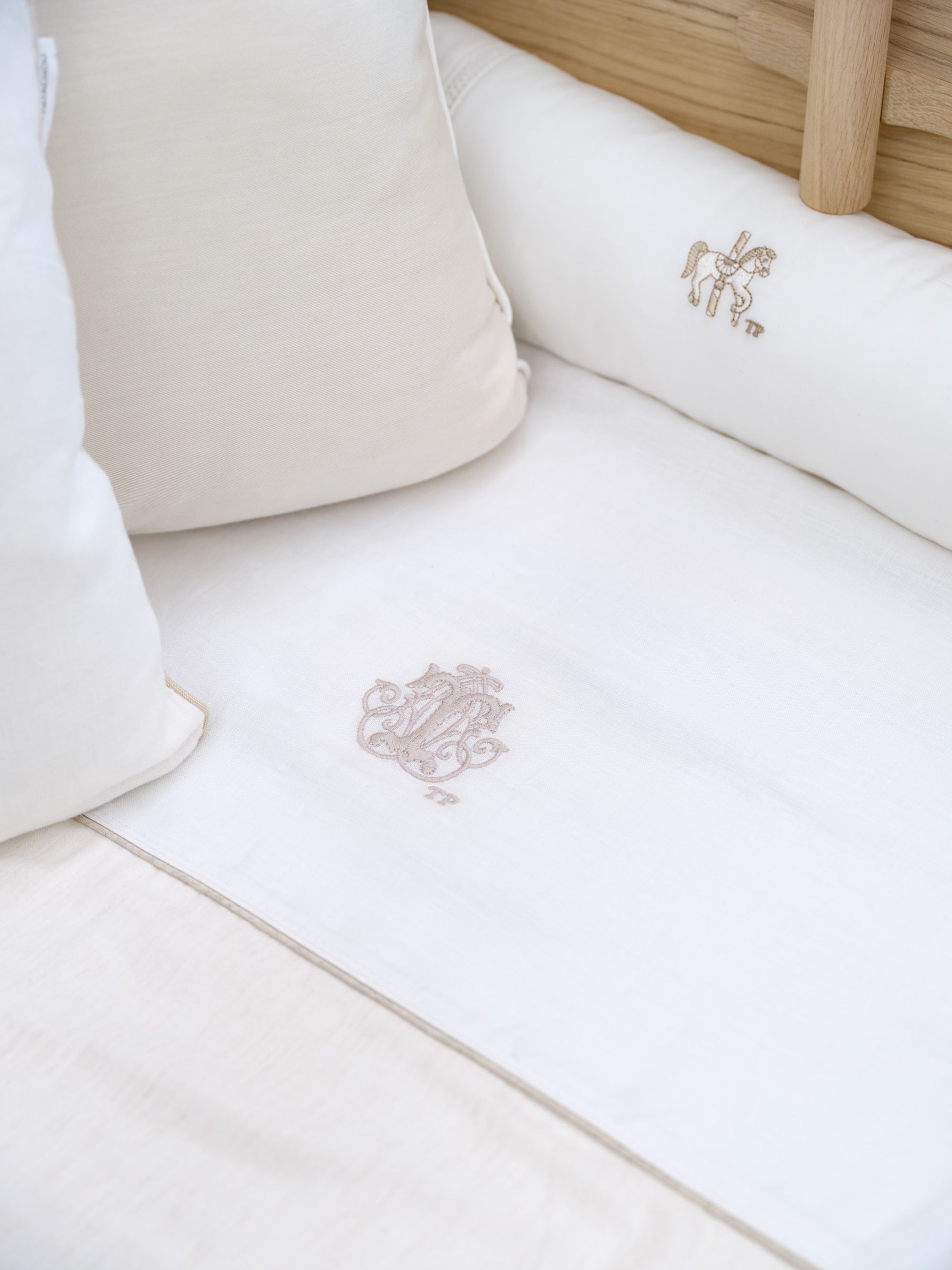 Animals in the Sky, this nursery was envisioned as a calm, gender-neutral haven. Soft tones, airy textures, and natural materials create an atmosphere that feels like drifting through a quiet sky. Light oak furniture by Oliver Furniture introduces warmth and Scandinavian refinement, anchoring the room with award-winning craftsmanship. A custom daybed in a subtle green stripe adds a tailored note, layered with textured cushions and delicate embroidery of the baby’s initials for a personal touch.