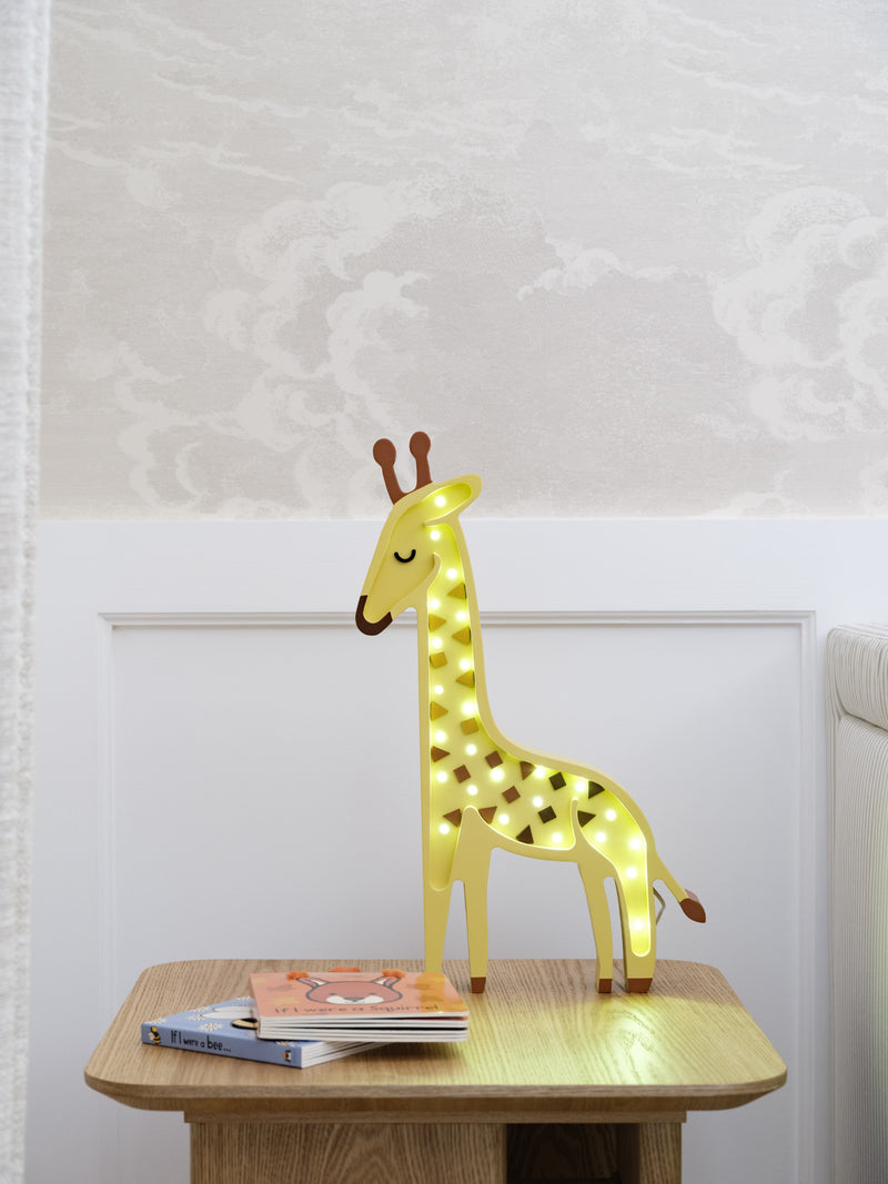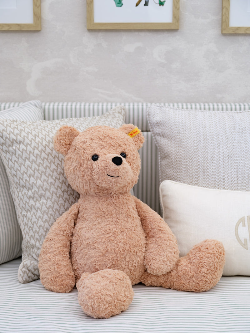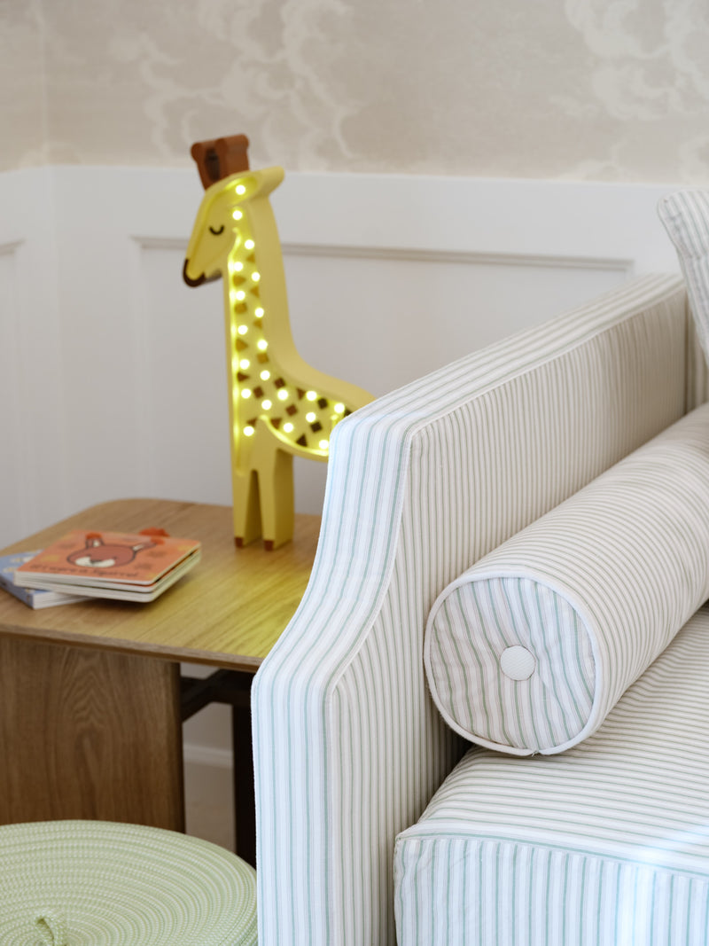 Playful animal illustrations, a charming giraffe lamp, and Steiff bears bring character without overwhelming the serenity. A cosy nursing corner with a comfortable chair and a fun ottoman on rounded feet encourages slow moments and storytelling.