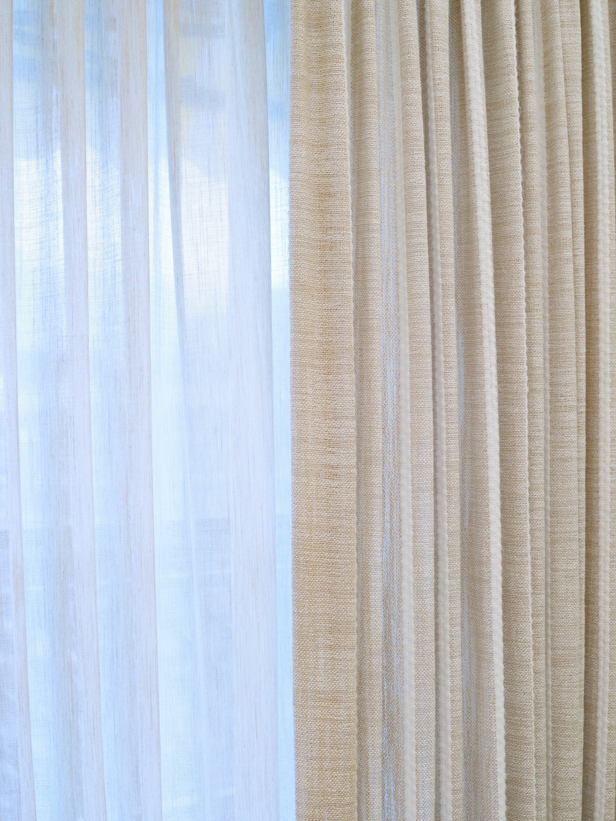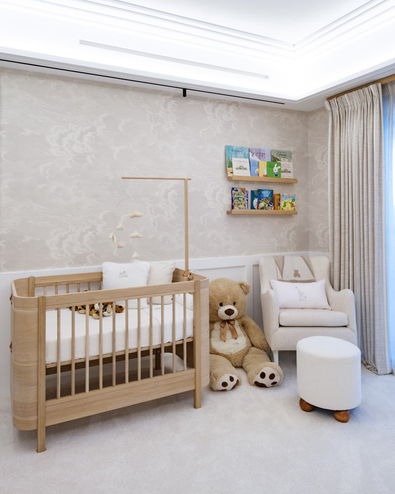 A plush wall-to-wall ivory carpet and sand-toned cloud wallpaper are elevated by crisp white panelling, giving the room a fresh, modern balance. Larsen wool curtains paired with Nobilis sheers soften the natural light, completing a space shaped for comfort and imagination—a small world where dreams begin to take flight.