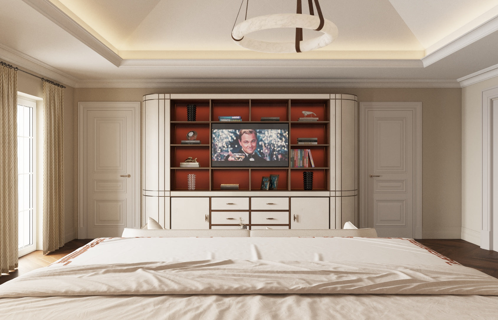 To create a seating space, we placed a classic Giorgetti sofa and canaletto table over a sumptuous graphic carpet. The matching TV Unit and desk allow plenty of storage space for the client. While we used ivory tones as a base, we used terracotta hues and a touch of black to add some contrast and make this elegant suite more vibrant.