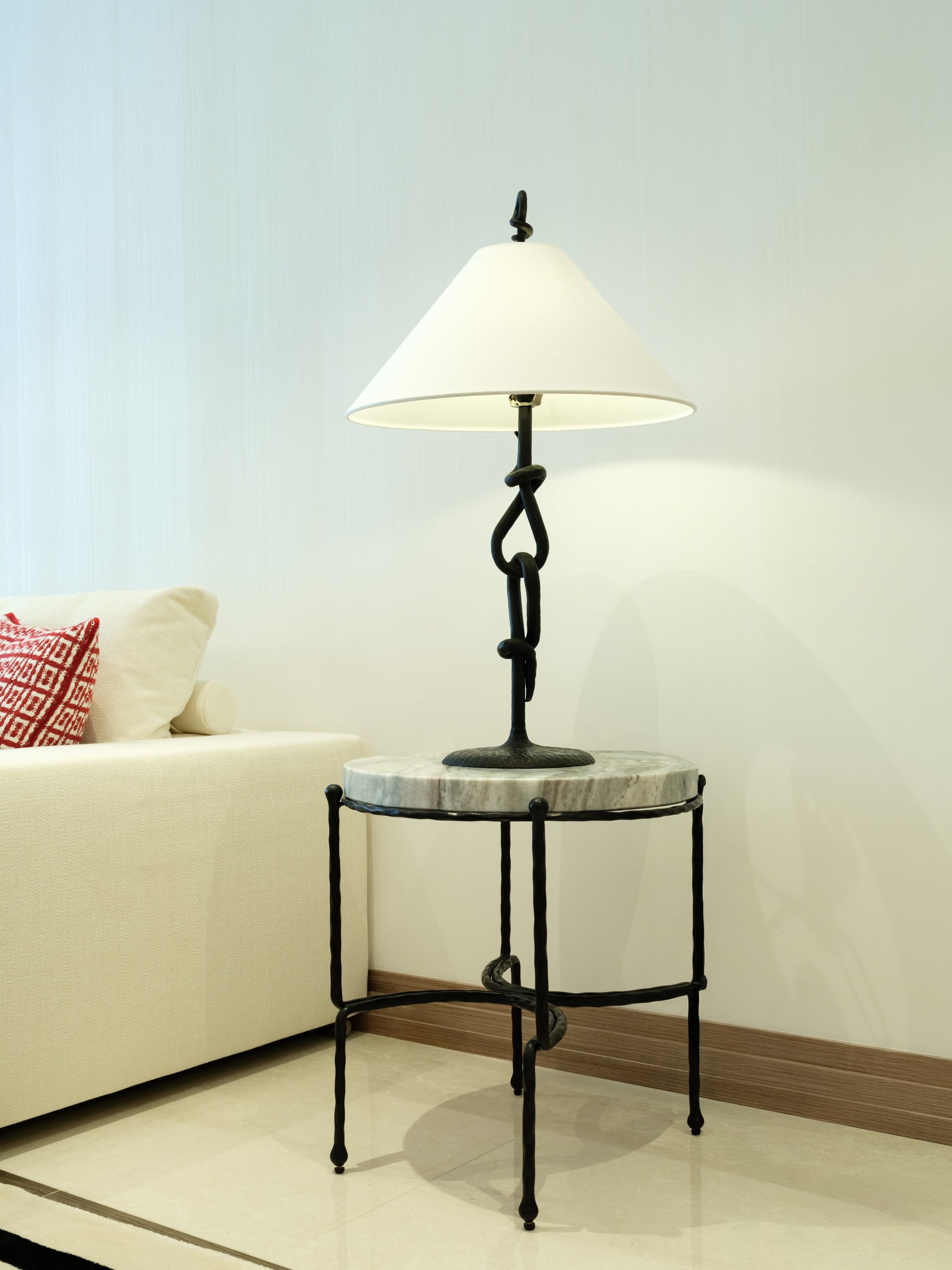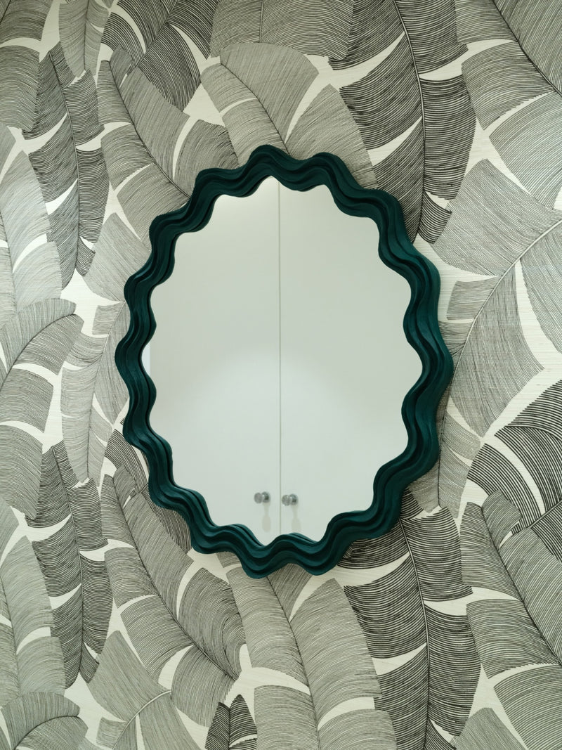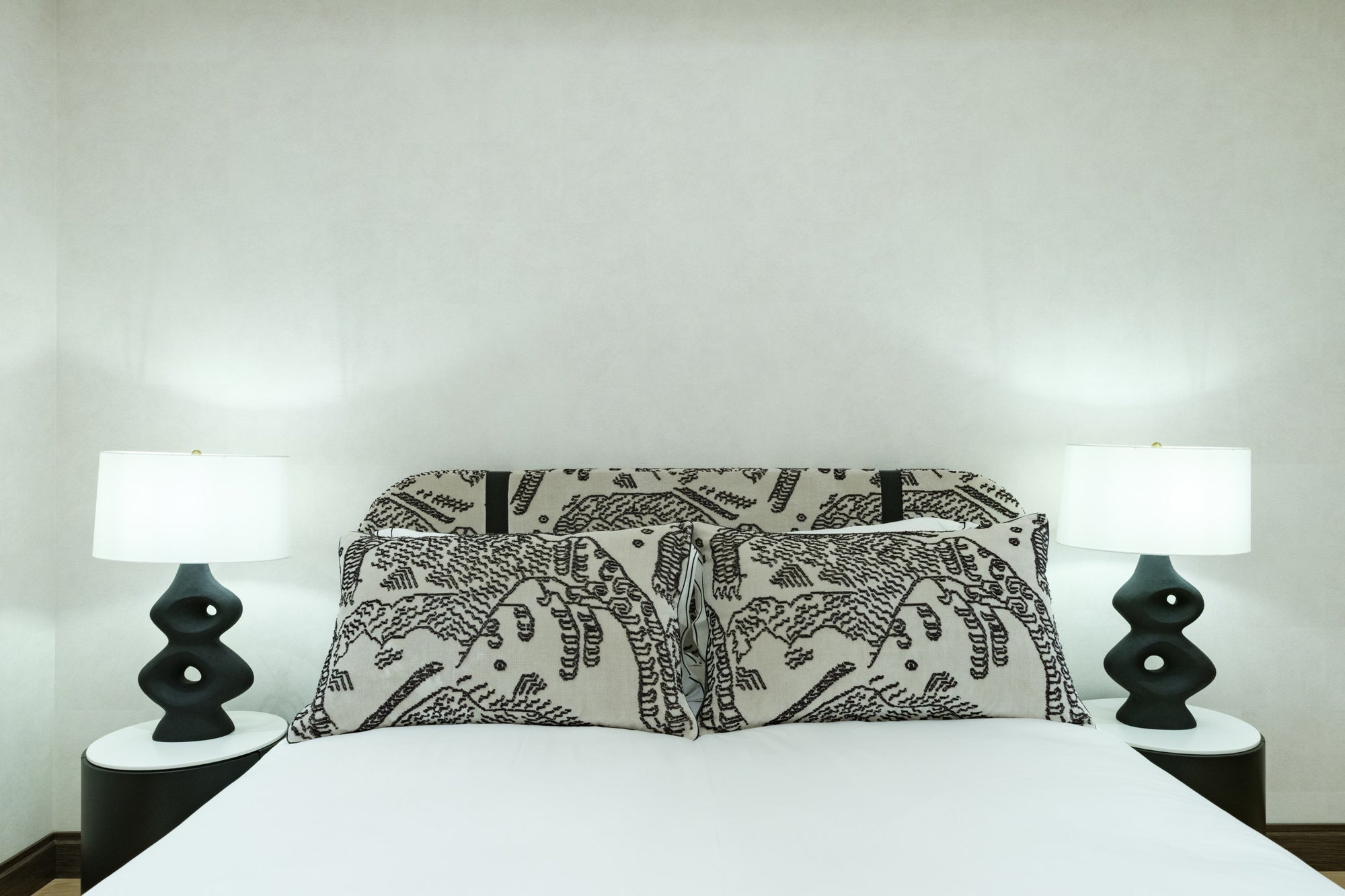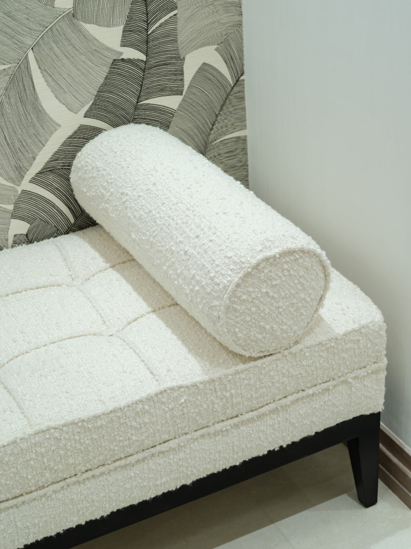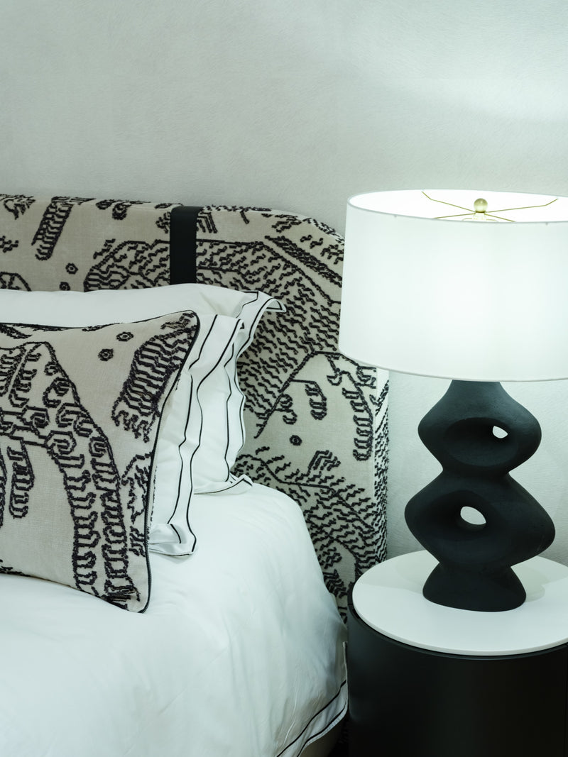 In the guest bedroom, a playful tiger motif fabric from Dedar served as the starting point, inspiring a bold yet balanced mix of textures and tones.