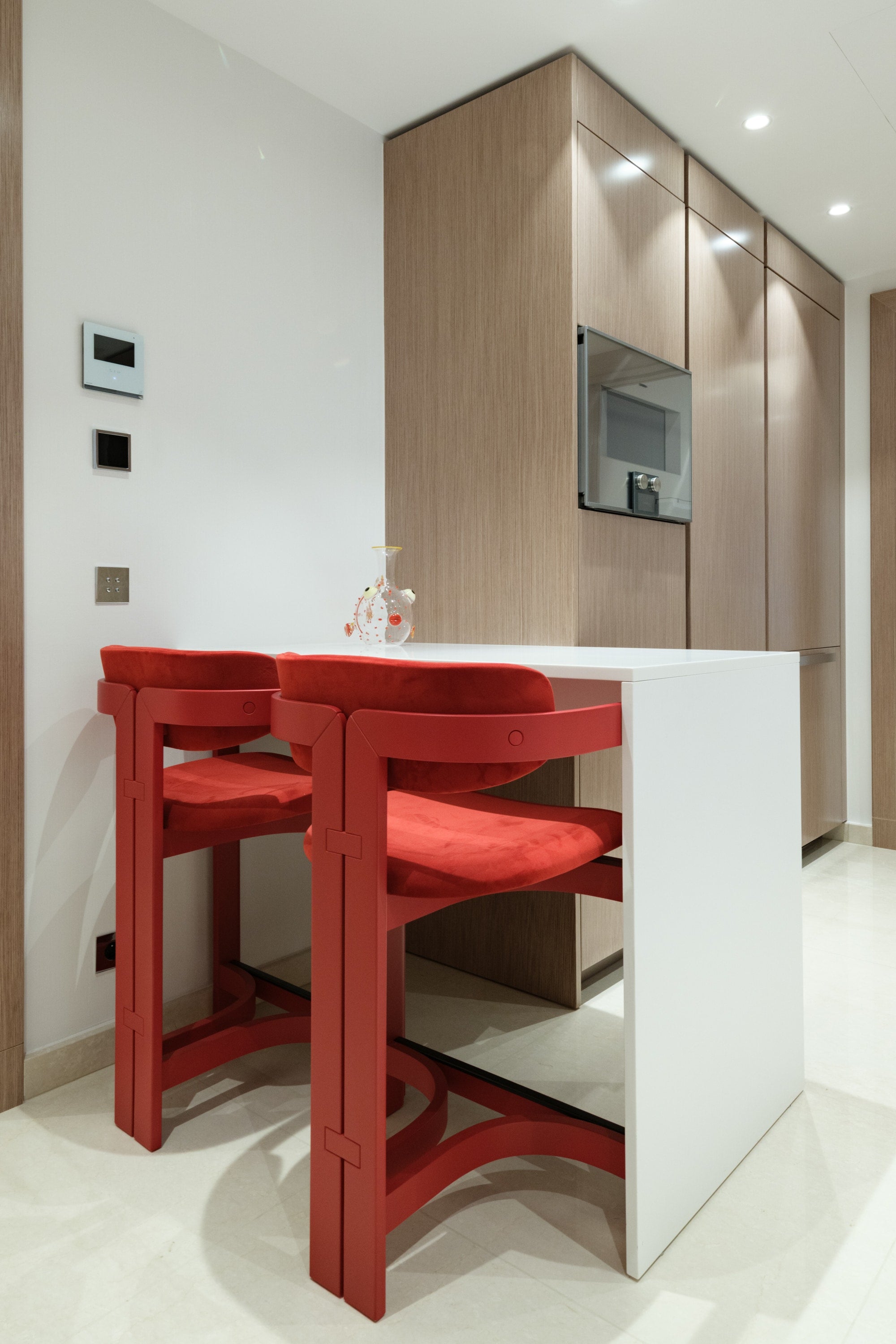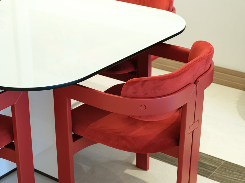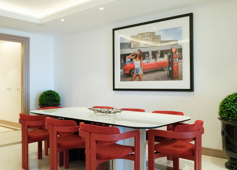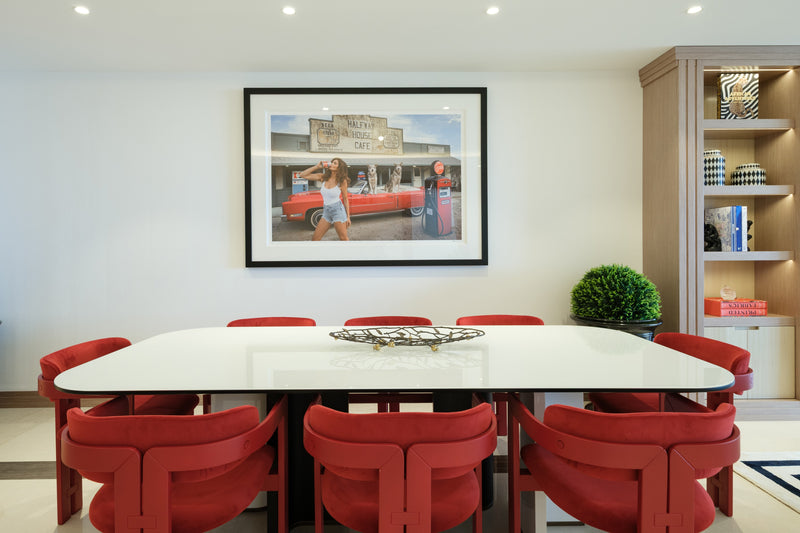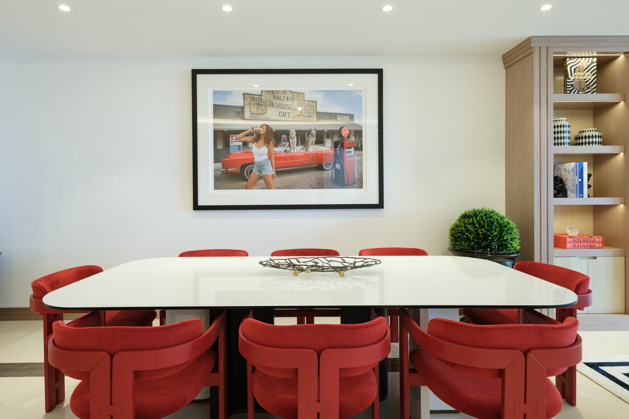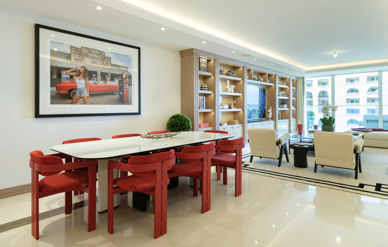 Vibrant red lacquered chairs surround a sculptural dining table, paired with a striking photographic artwork that sets a lively, contemporary tone. Blue and red cushions on the sofa echo the dining area’s palette and the artworks, adding rhythm and energy to the room without overwhelming its calm foundation.