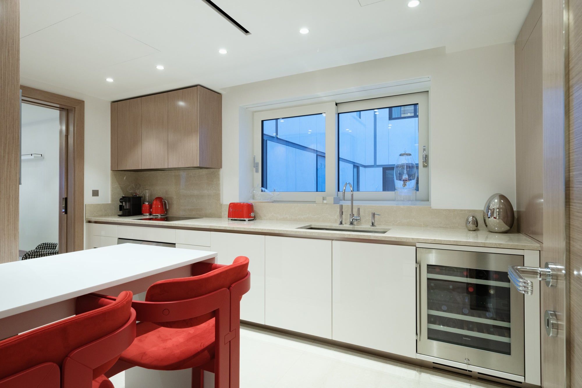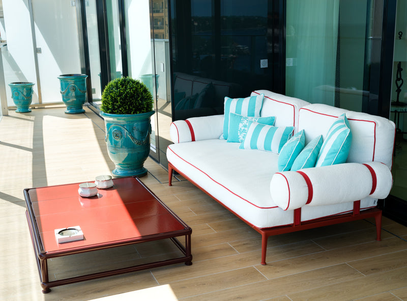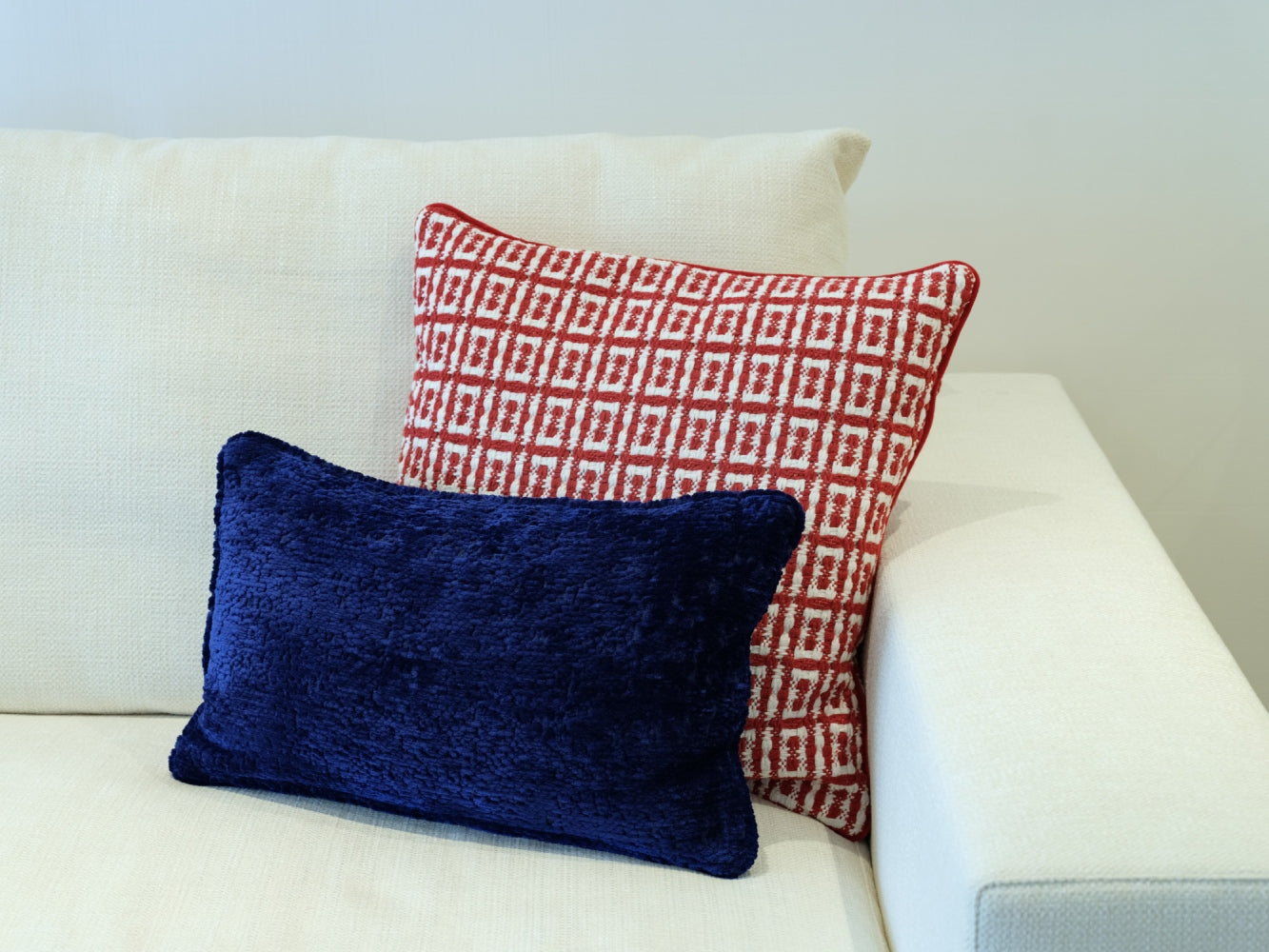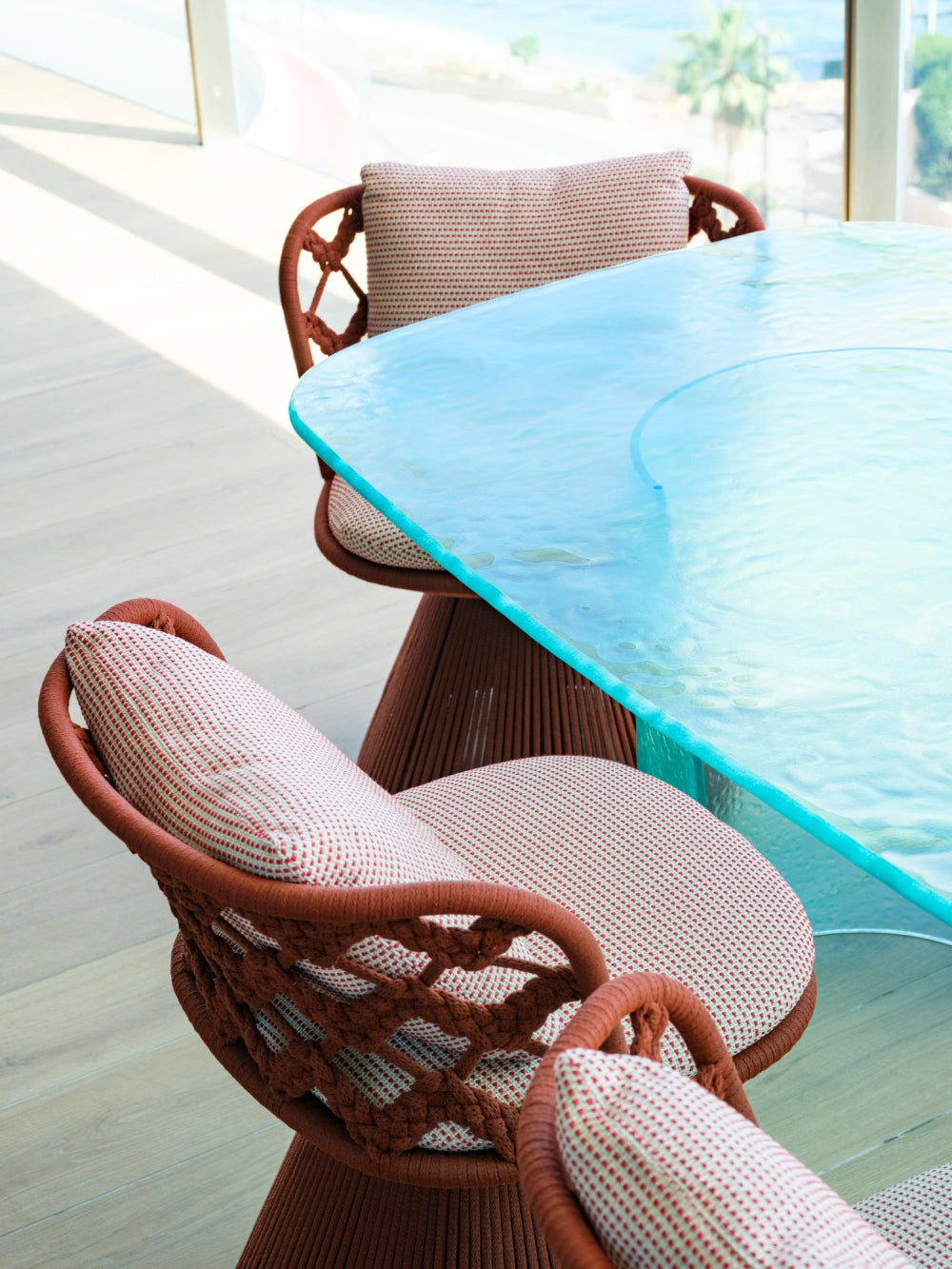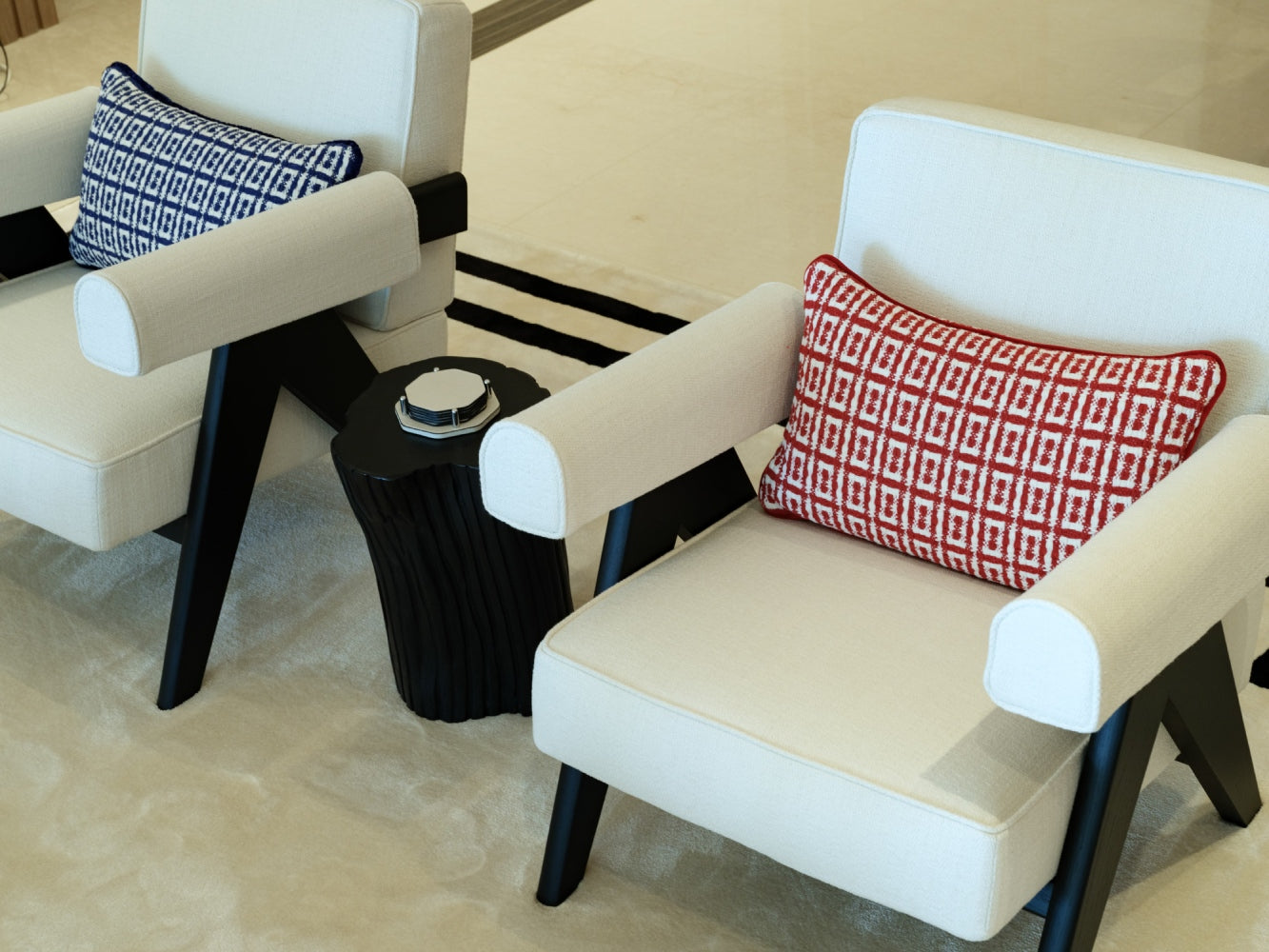 Vibrant red lacquered chairs surround a sculptural dining table, paired with a striking photographic artwork that sets a lively, contemporary tone. Blue and red cushions on the sofa echo the dining area’s palette and the artworks, adding rhythm and energy to the room without overwhelming its calm foundation.