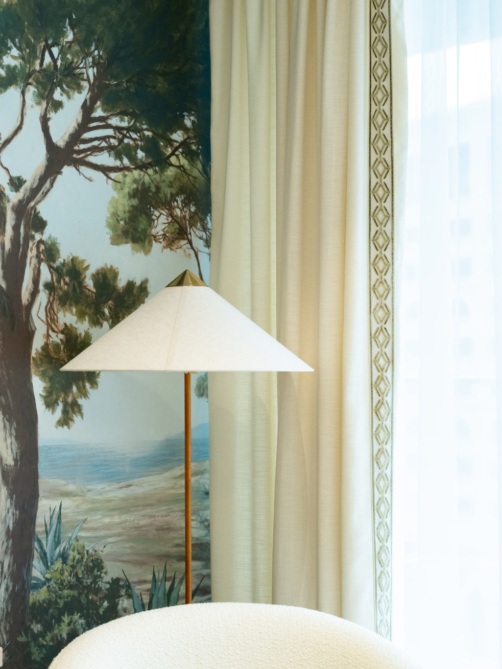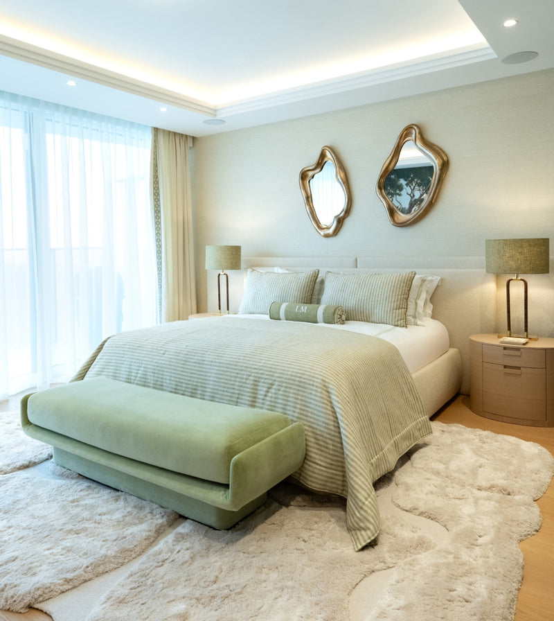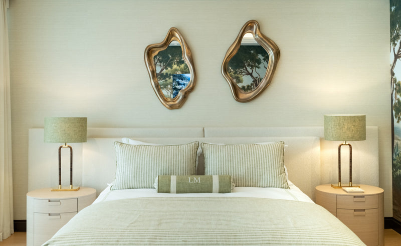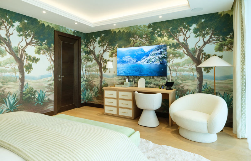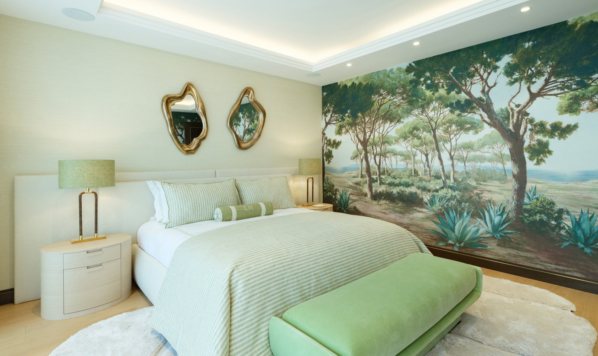 The natural-themed bedroom features a sumptuous Pierre Frey vegetal mural, wrapping the walls in soft greens and hand-painted depth. A custom linen bed set anchors the space with quiet luxury, complemented by a made-to-measure light oak desk that blends seamlessly into the panoramic landscape.