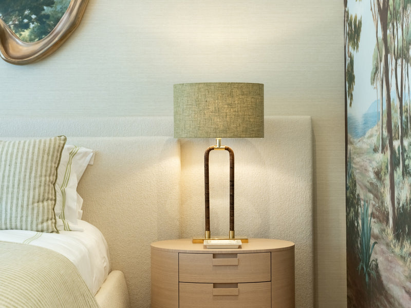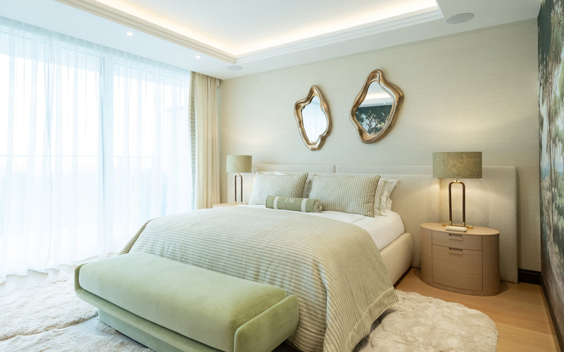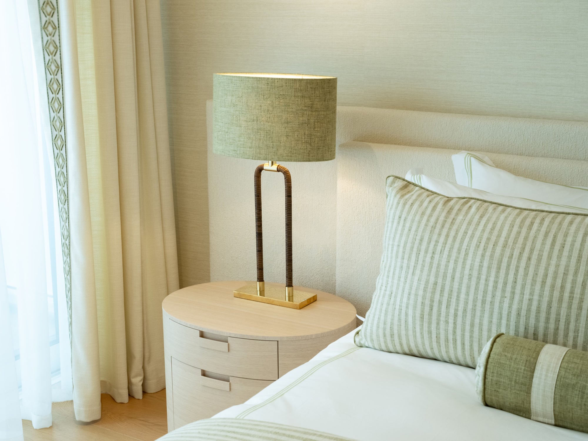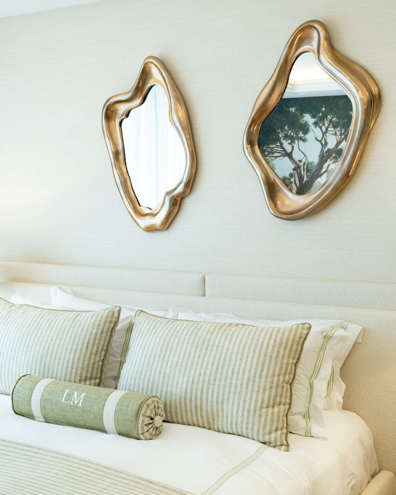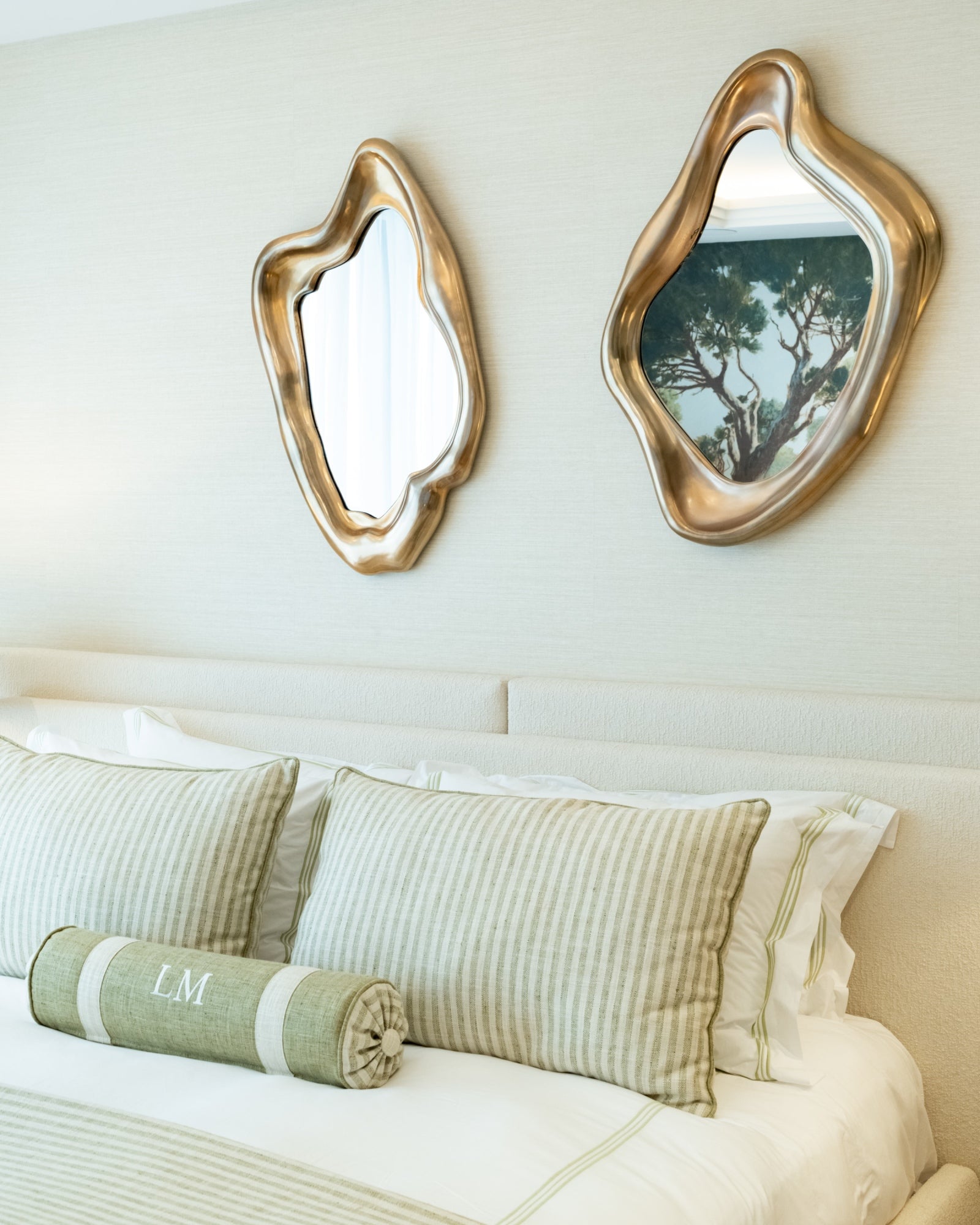 The natural-themed bedroom features a sumptuous Pierre Frey vegetal mural, wrapping the walls in soft greens and hand-painted depth. A custom linen bed set anchors the space with quiet luxury, complemented by a made-to-measure light oak desk that blends seamlessly into the panoramic landscape.