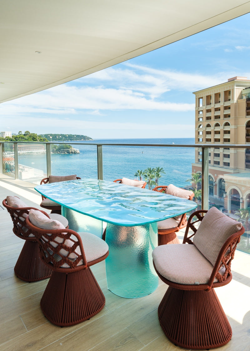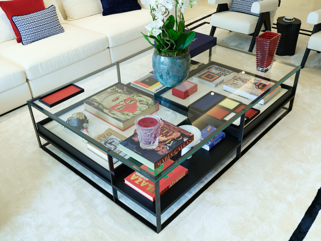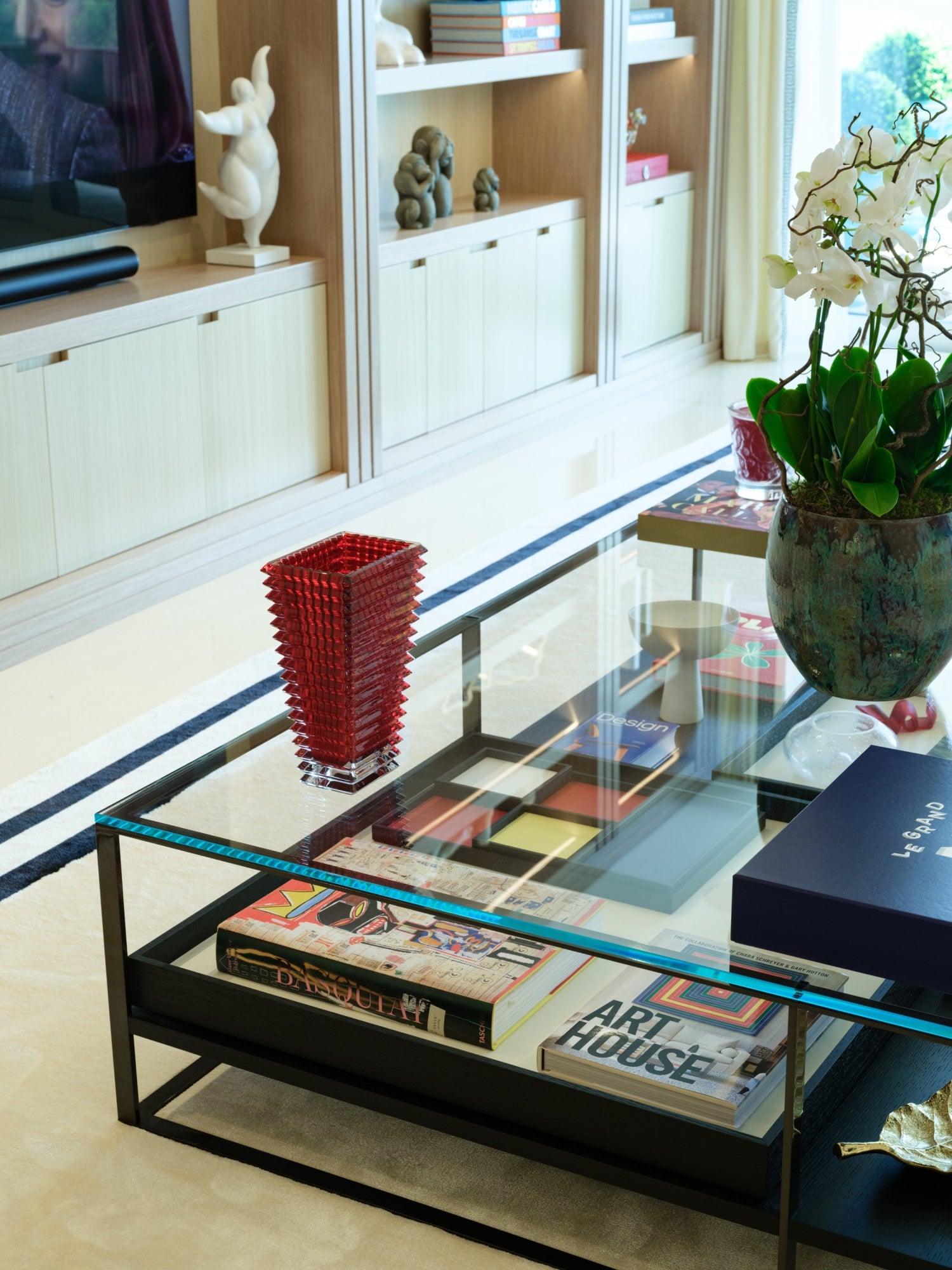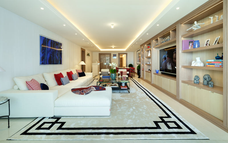 For this beautiful apartment in Monaco, we crafted an elegant yet spirited atmosphere, blending refined design with bold, unexpected touches. The main living space revolves around a giant L-shaped white linen sofa, inviting long conversations and relaxed gatherings. Behind it, a custom boiserie bar adds architectural presence, while a museum-like coffee table with a glass top displays treasured objects as if in a private gallery.