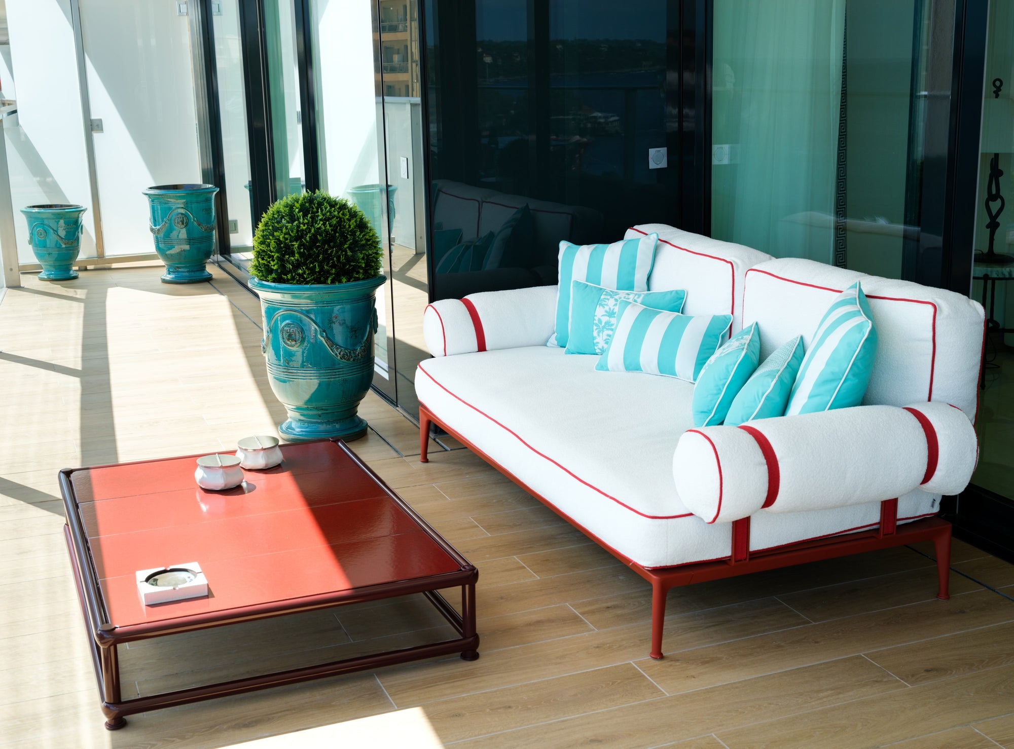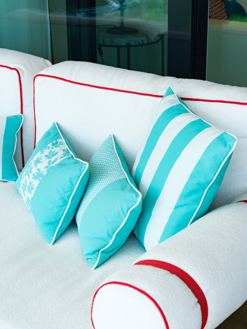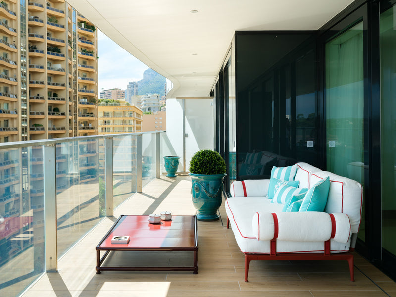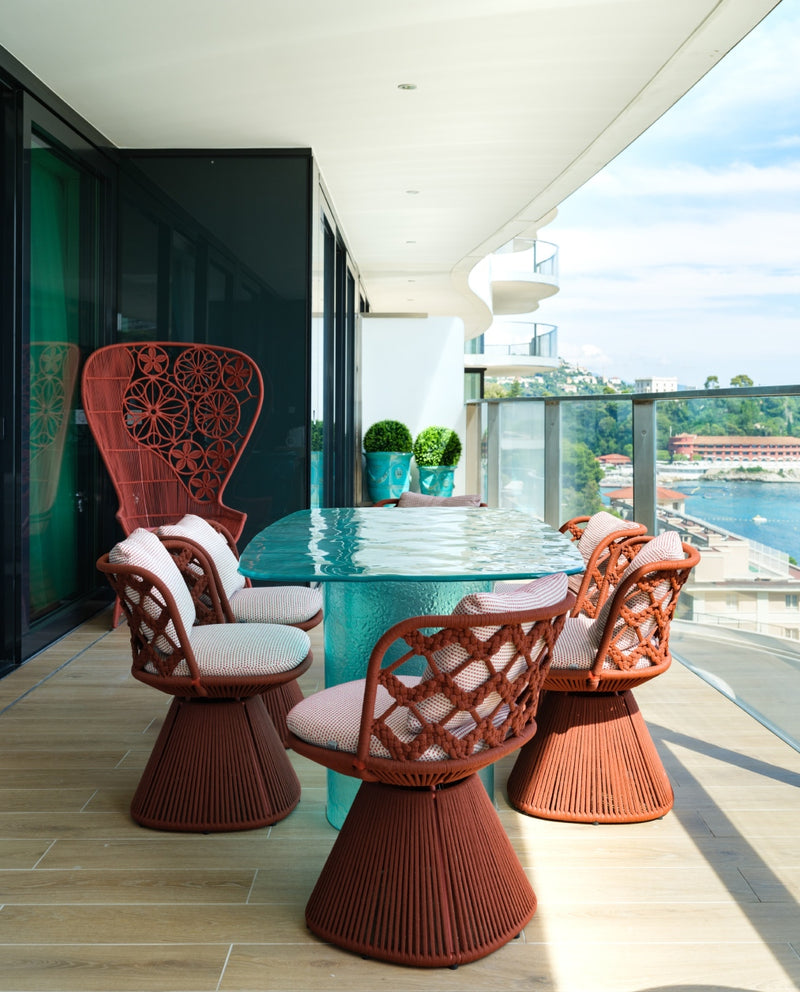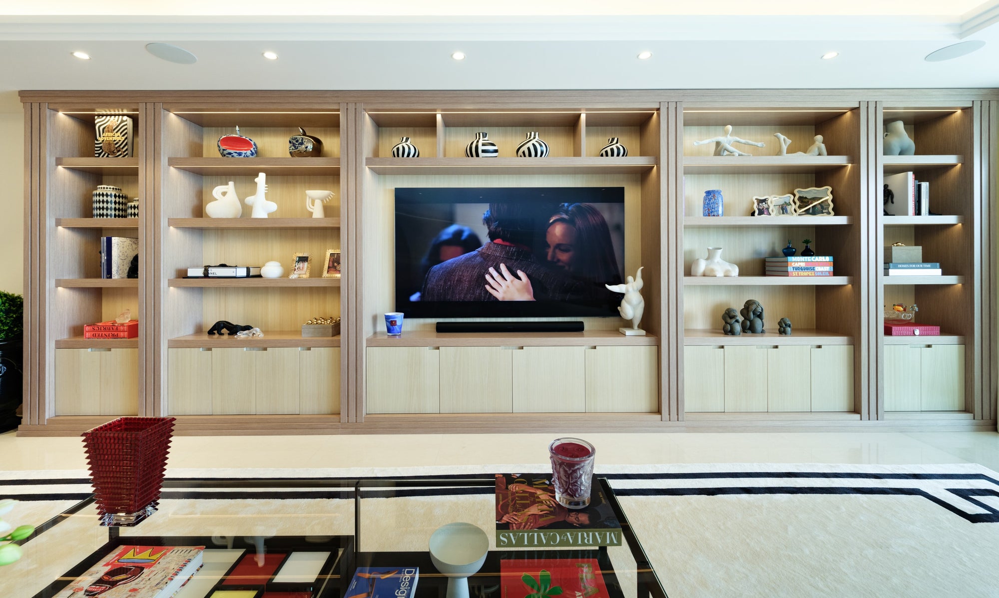 For this beautiful apartment in Monaco, we crafted an elegant yet spirited atmosphere, blending refined design with bold, unexpected touches. The main living space revolves around a giant L-shaped white linen sofa, inviting long conversations and relaxed gatherings. Behind it, a custom boiserie bar adds architectural presence, while a museum-like coffee table with a glass top displays treasured objects as if in a private gallery.