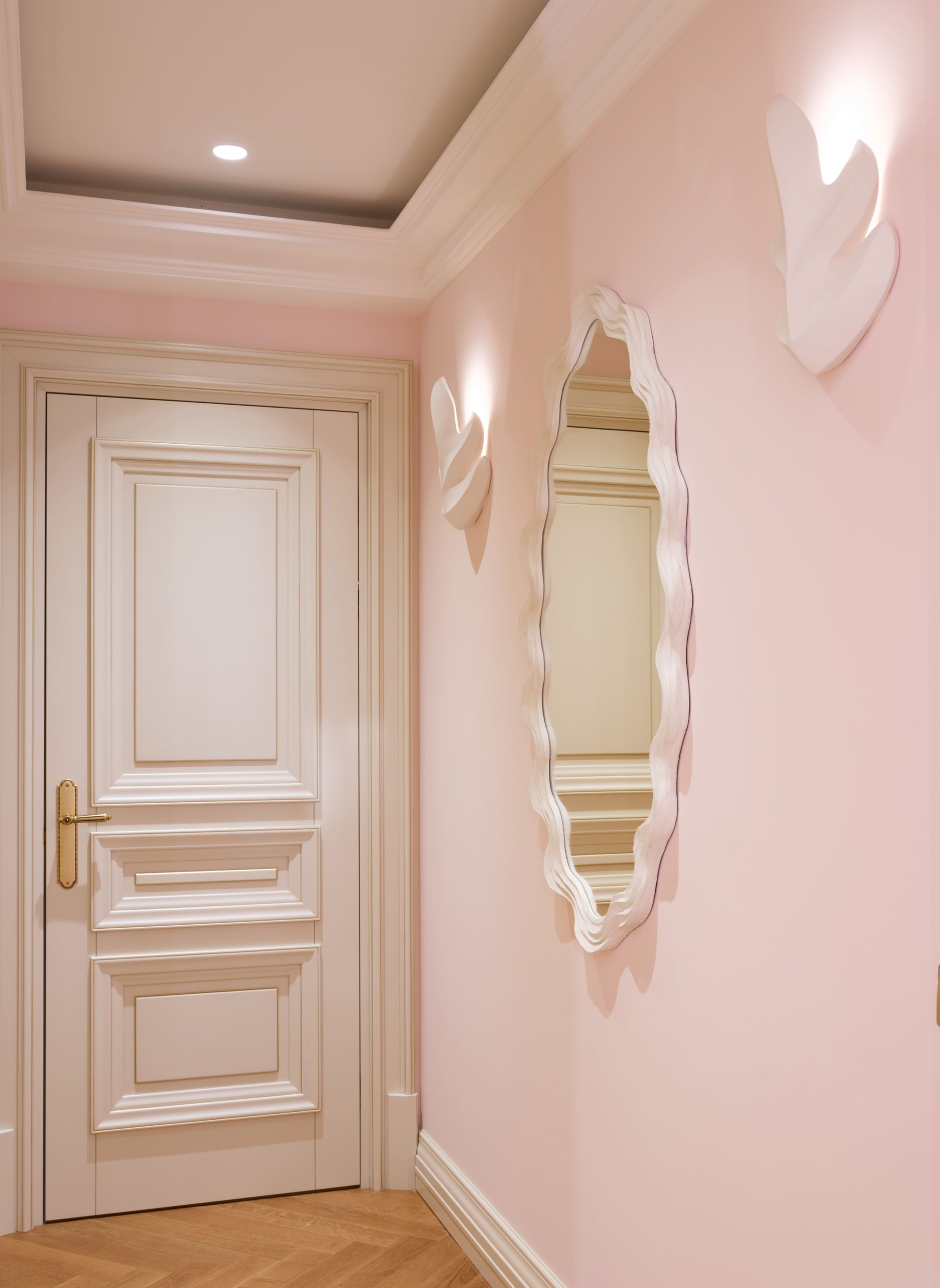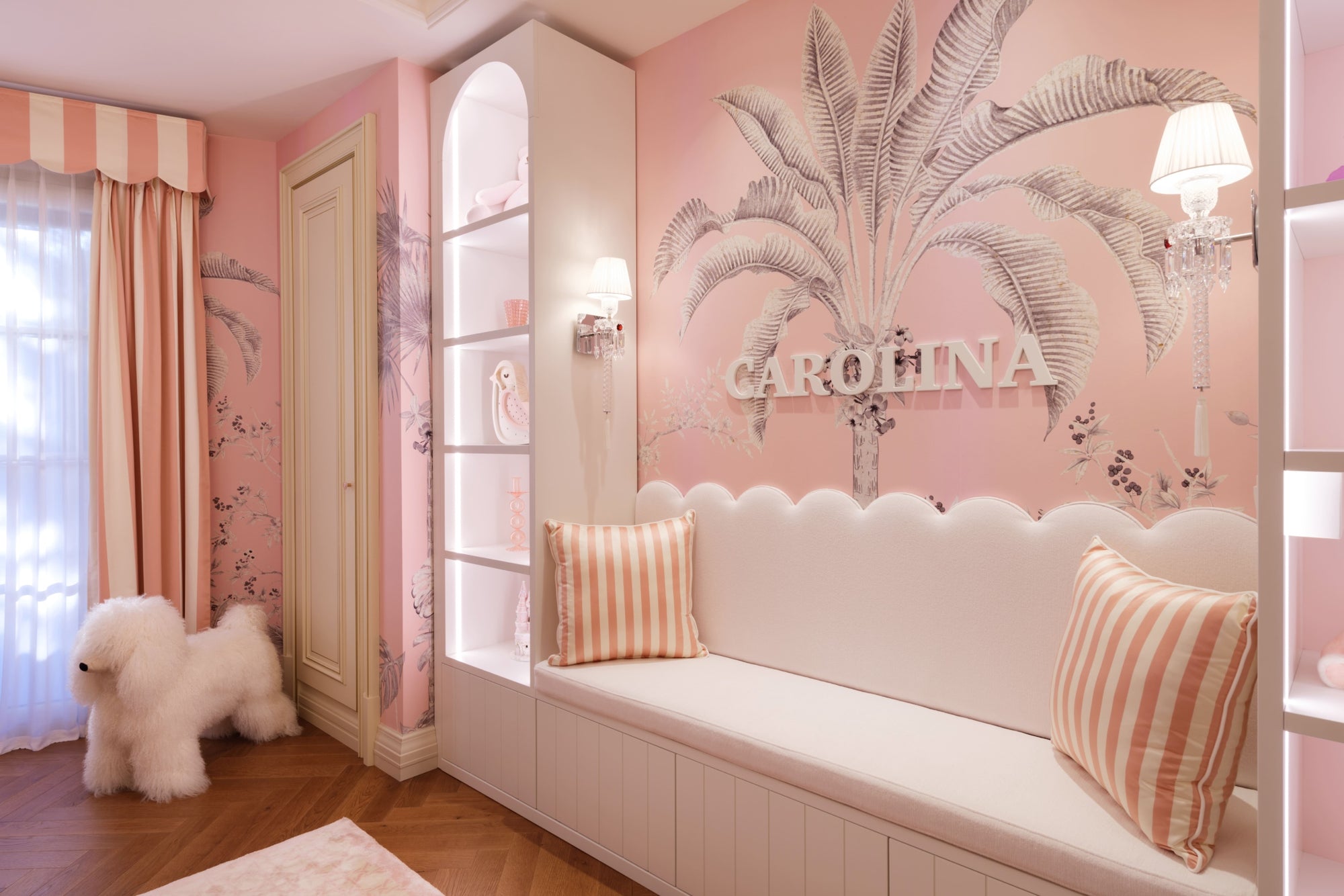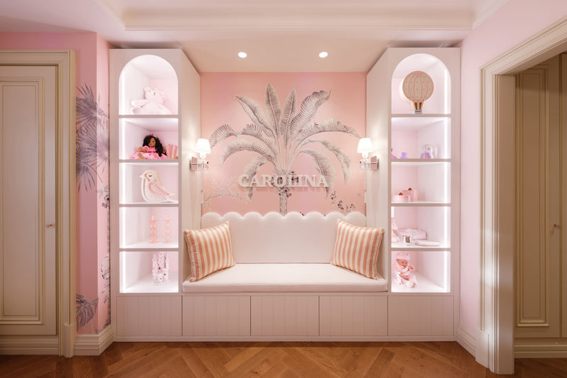 A custom white oak bookcase takes center stage, serving as both a bench and a showcase for the little girl's favorite toys and cherished items. To top it off, a Baccarat touch applique light up the seating area.