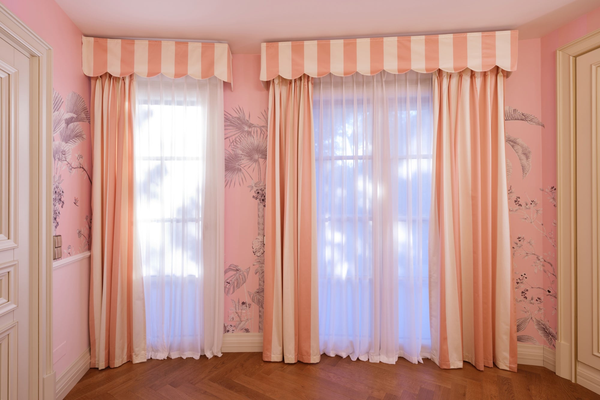 The curtains and curtain boxes feature chic large stripes, complementing a matching lampshade on a floor lamp with delightful smaller stripes. Adding classic touch, the Pinton carpet boasts a Dior-style cannage pattern.