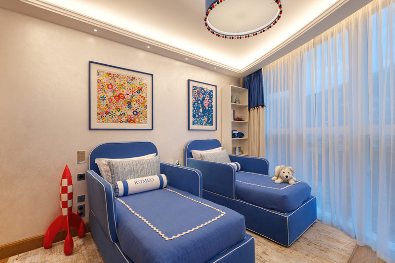 For this twin bedroom, we drew inspiration from the client's collection of Murakami artworks.