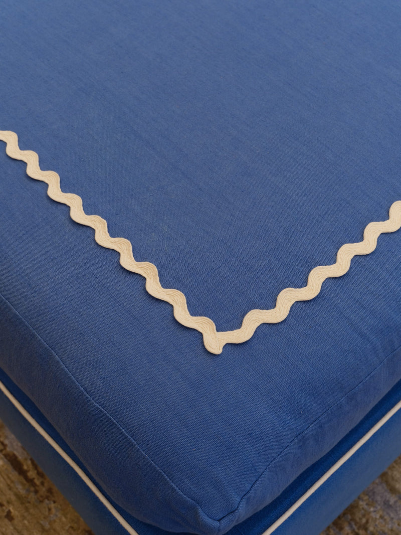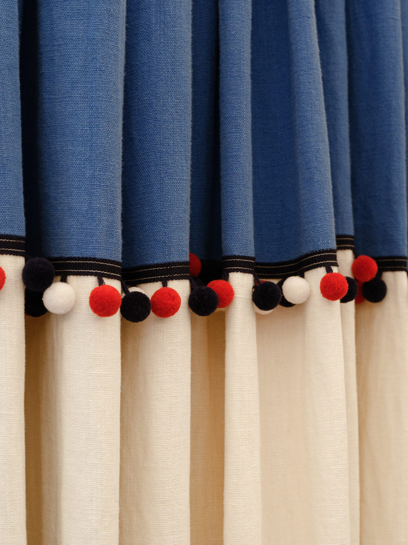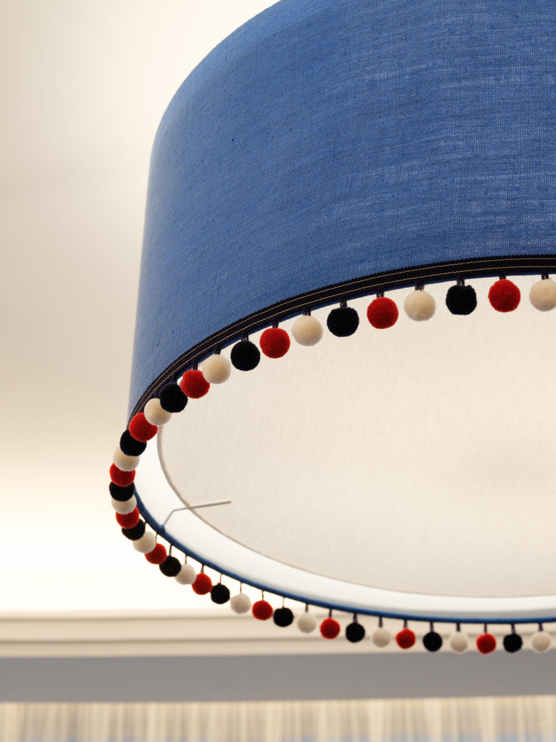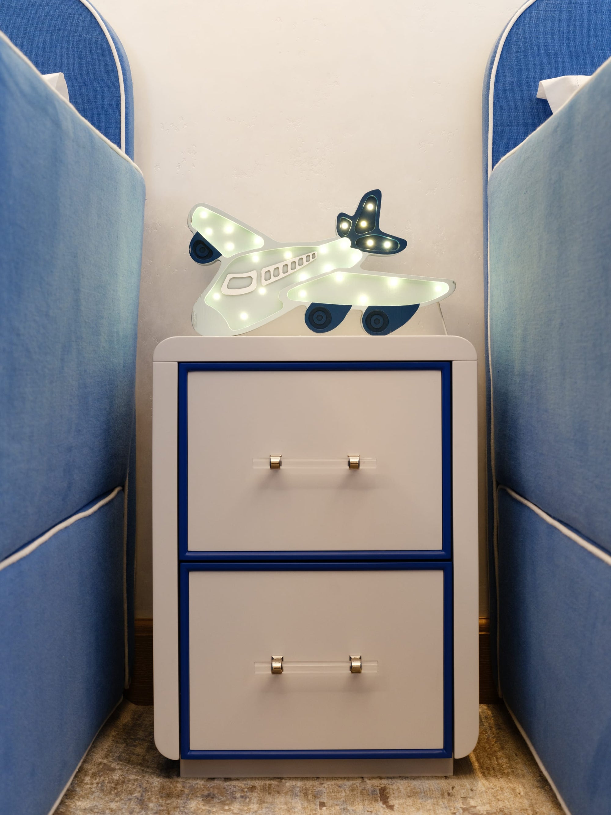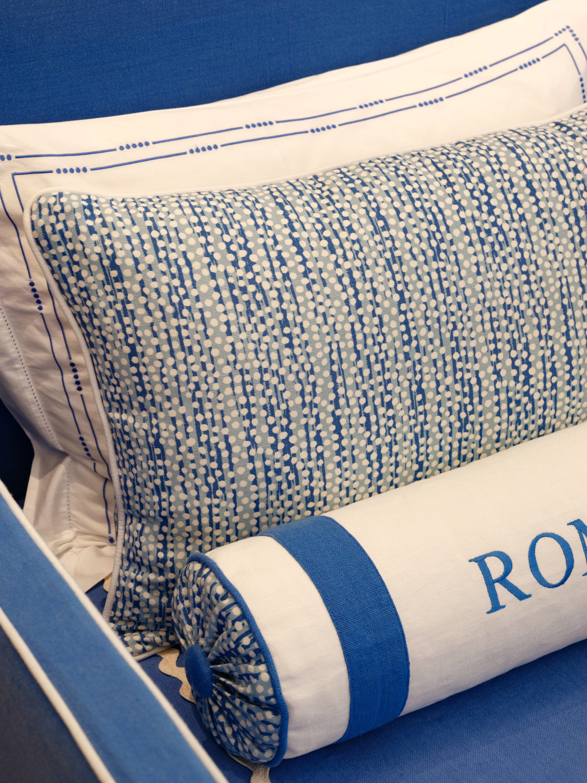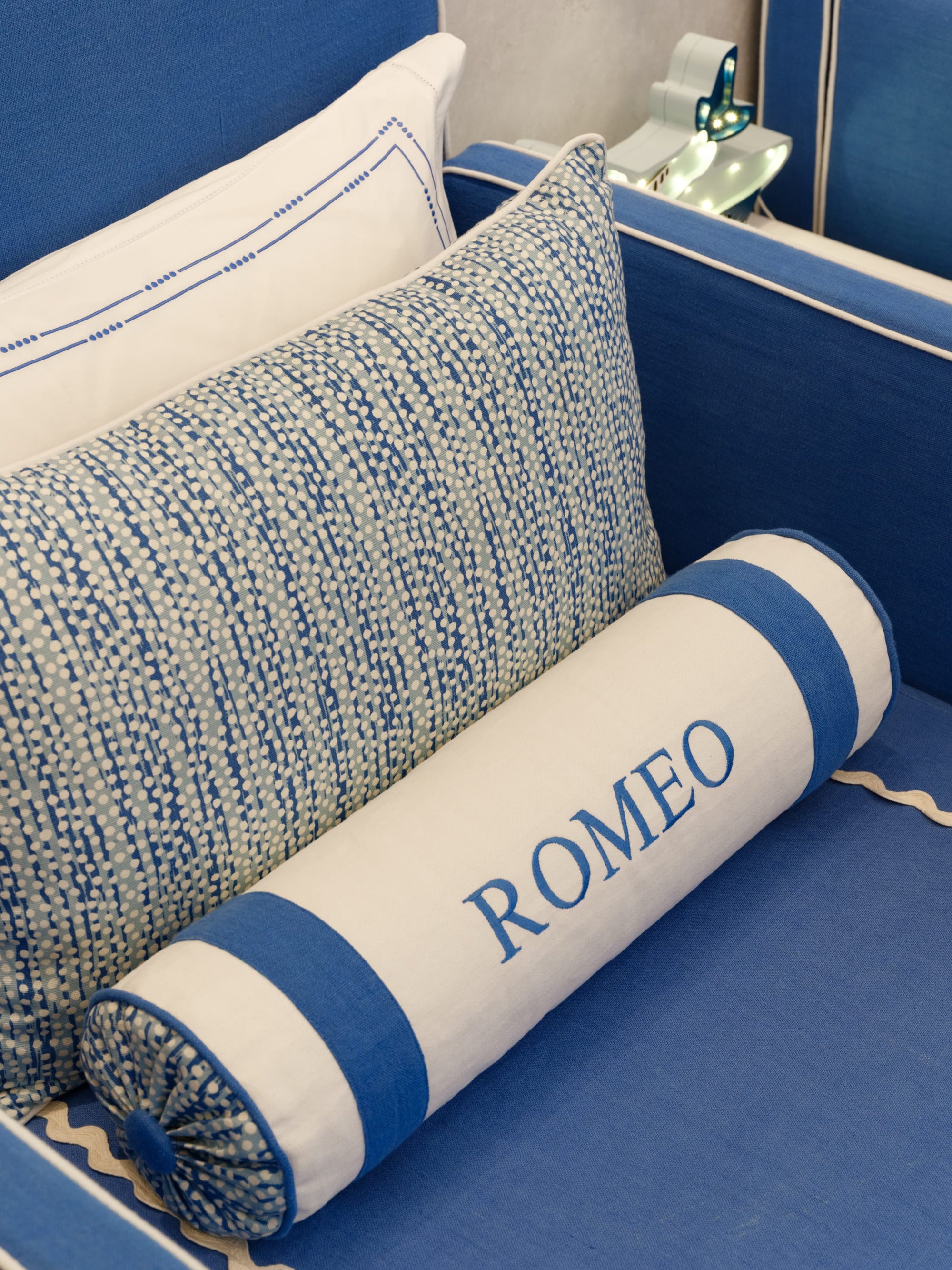 We then designed custom beds with side protections for each child, accompanied by coordinated bed linens and our signature touch: a personalized roll cushion for each bed.