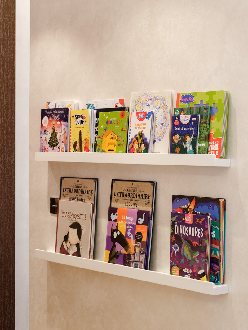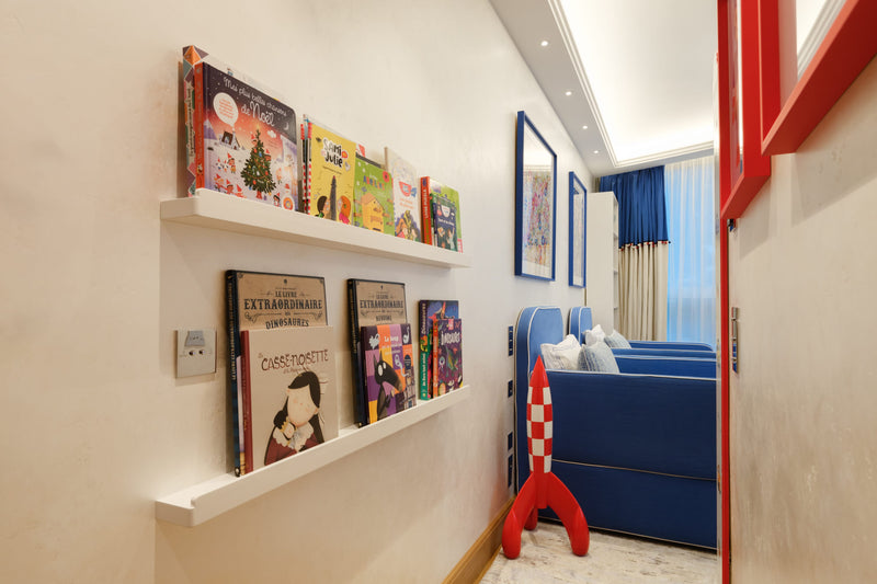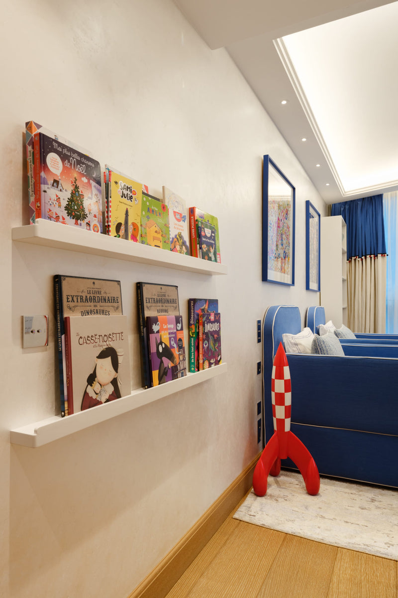 To maximize both storage and study space, our architects crafted a bespoke bookcase with a built-in tray that doubles as a desk, along with closed shelves underneath for additional storage.