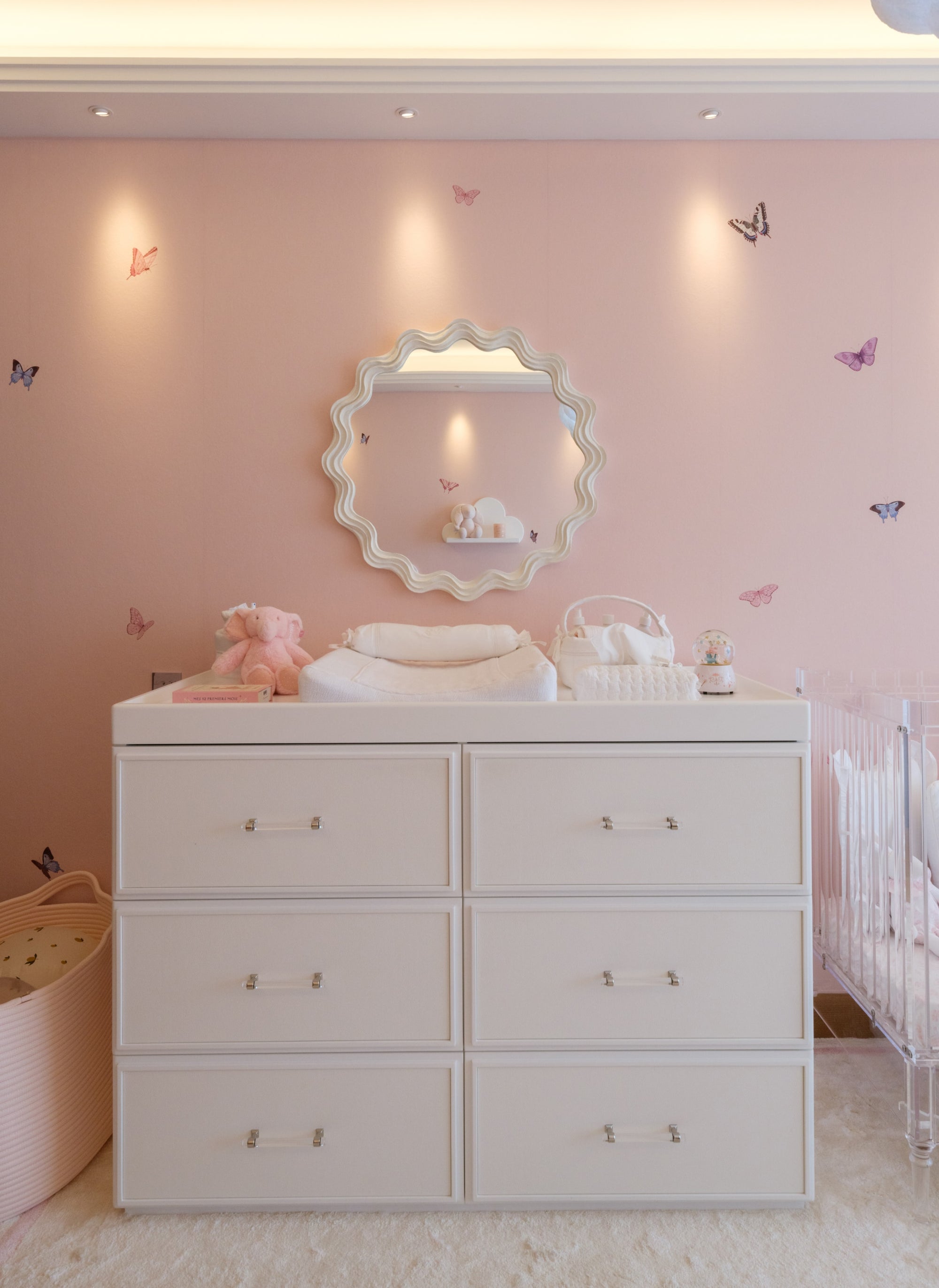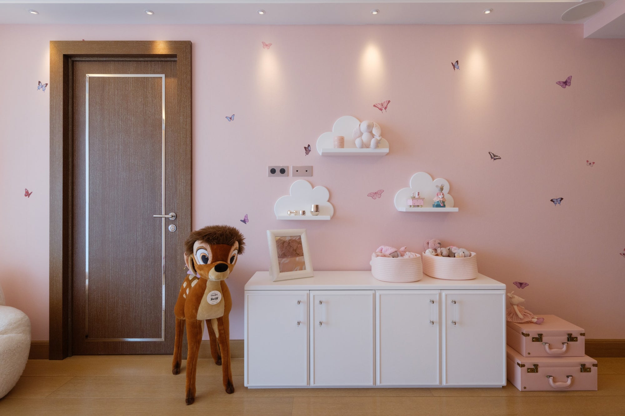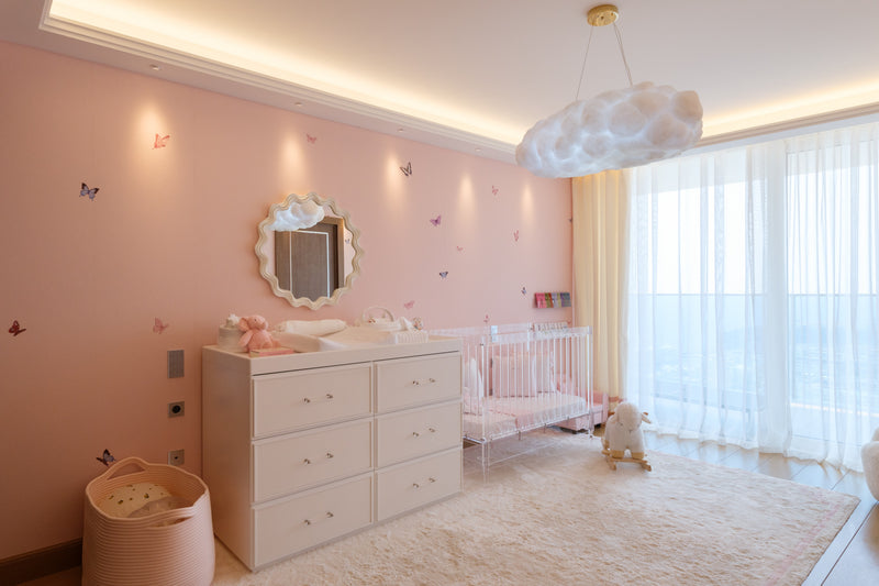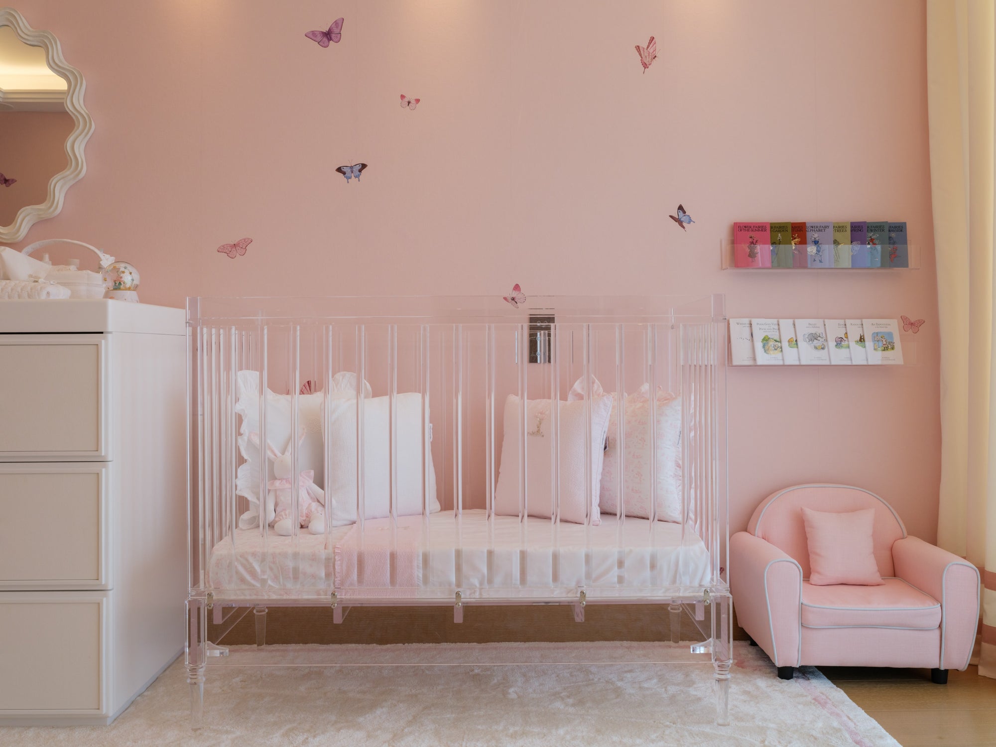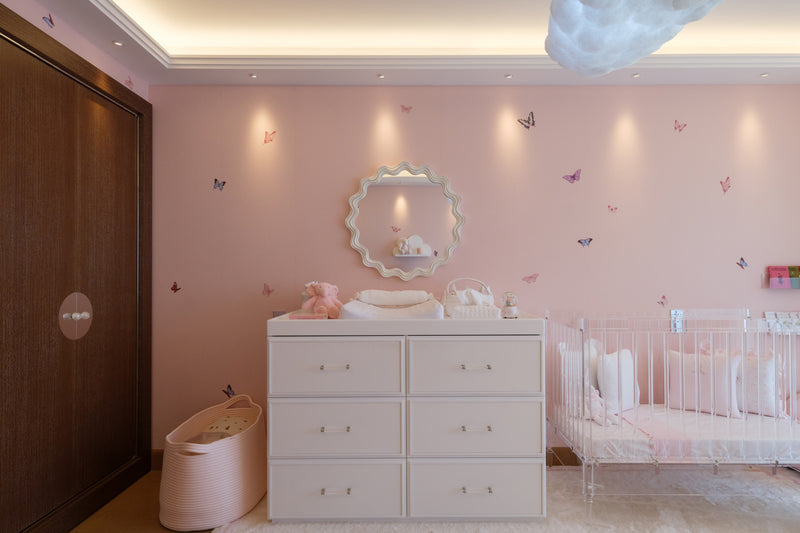 We designed this nursery as a dreamy yet modern space, tailored entirely for our little client. The custom butterfly wallpaper, set against a pale pink background, brings a soft, whimsical charm to the room.