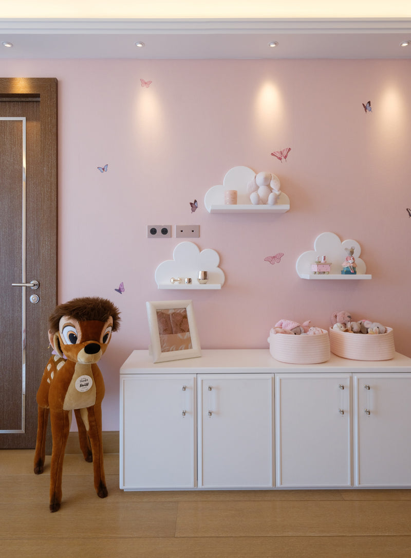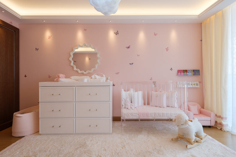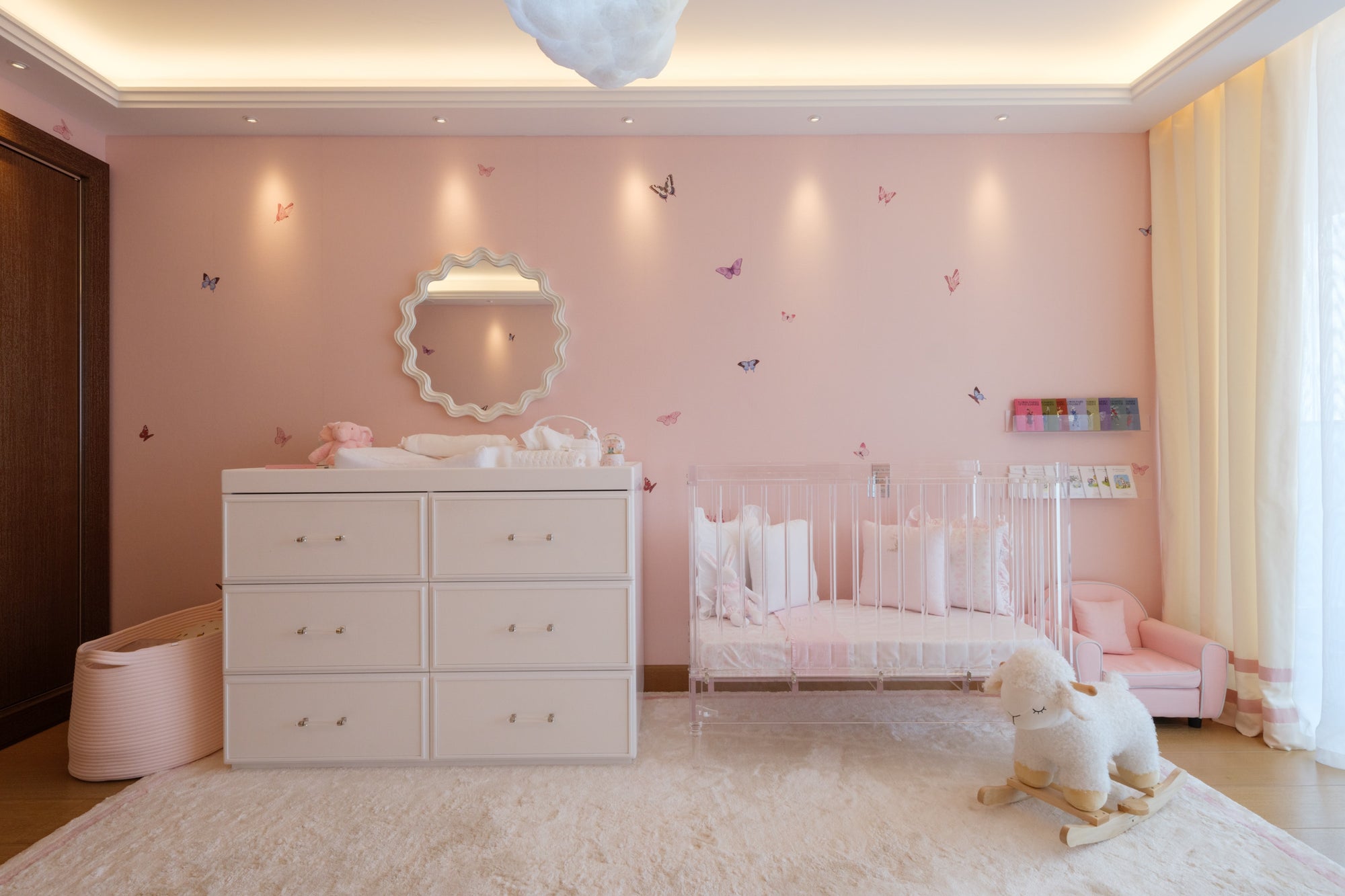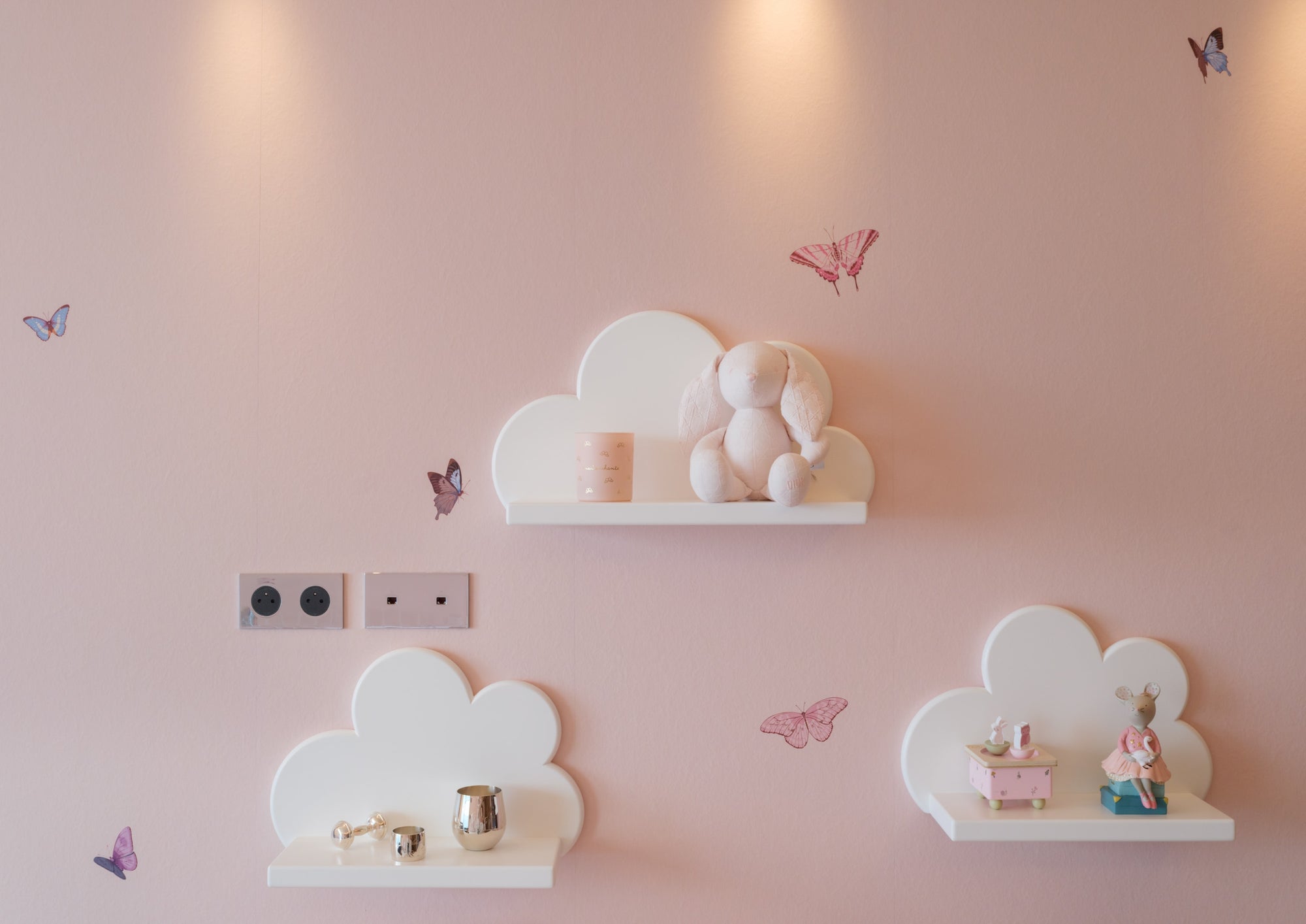 We designed this nursery as a dreamy yet modern space, tailored entirely for our little client. The custom butterfly wallpaper, set against a pale pink background, brings a soft, whimsical charm to the room.