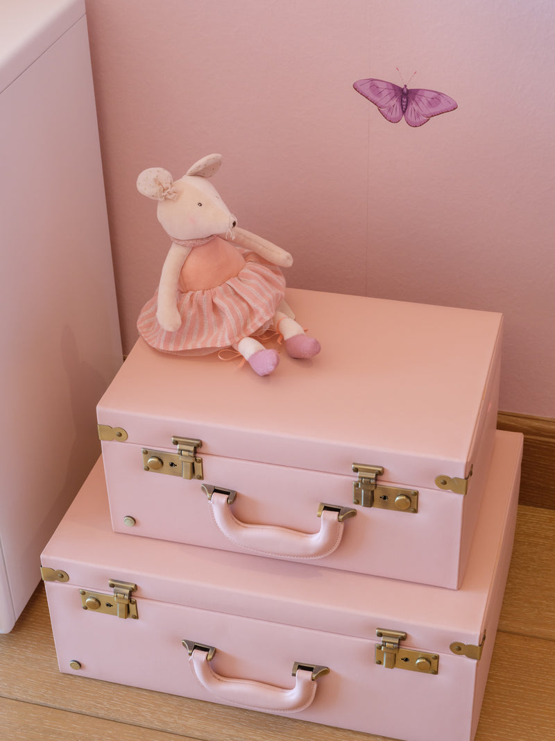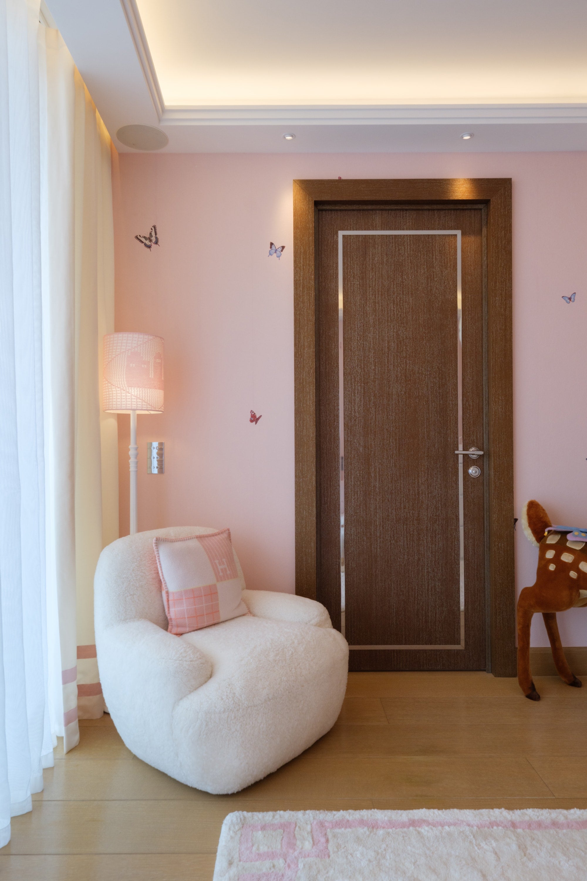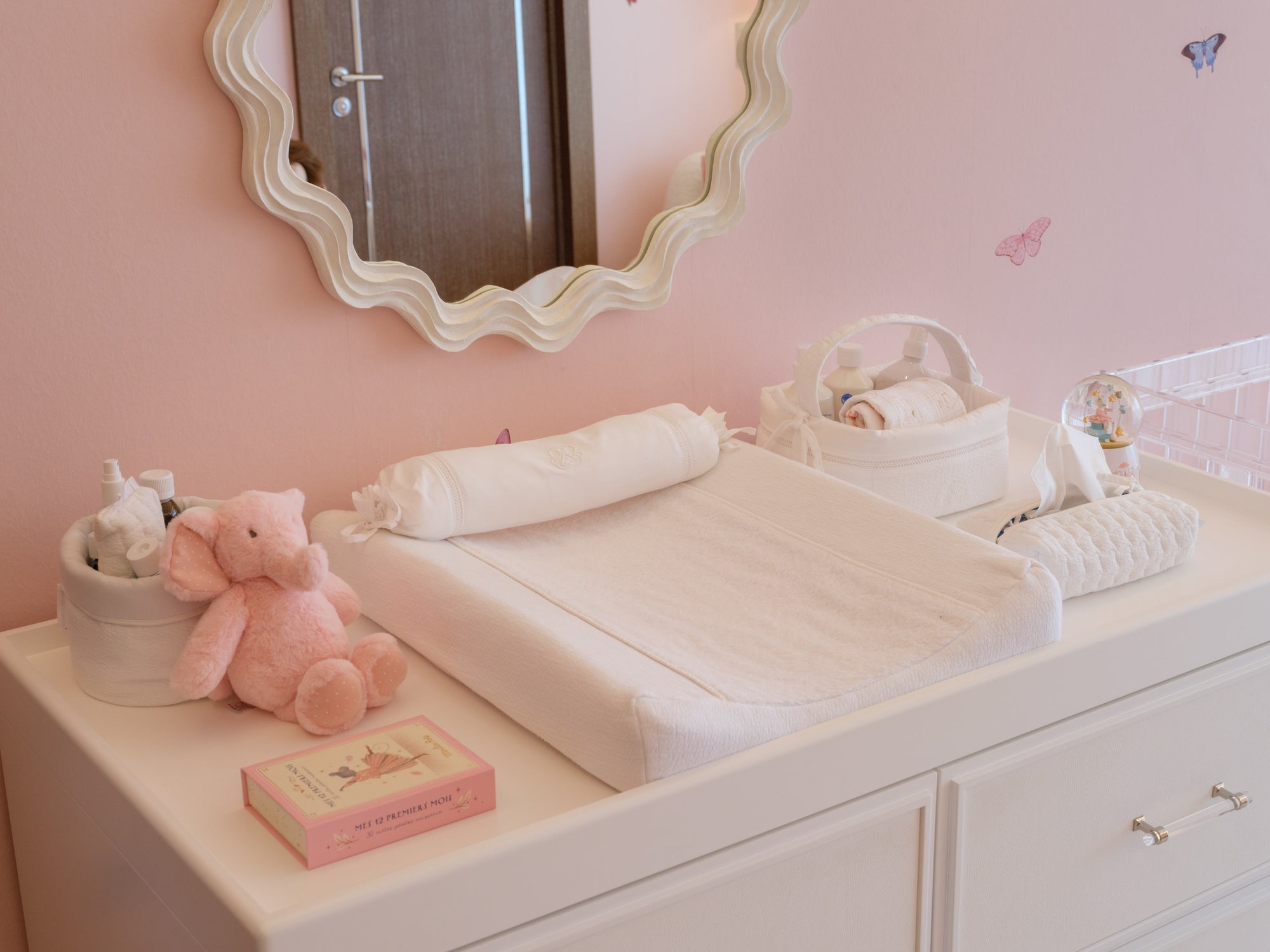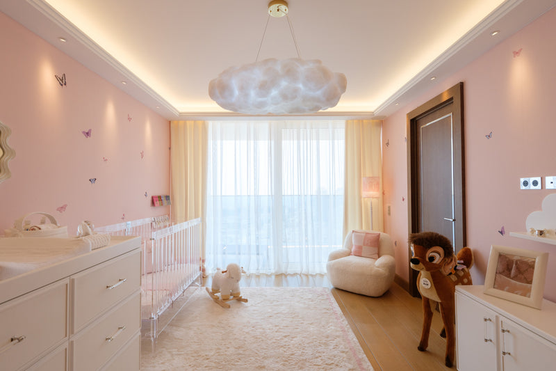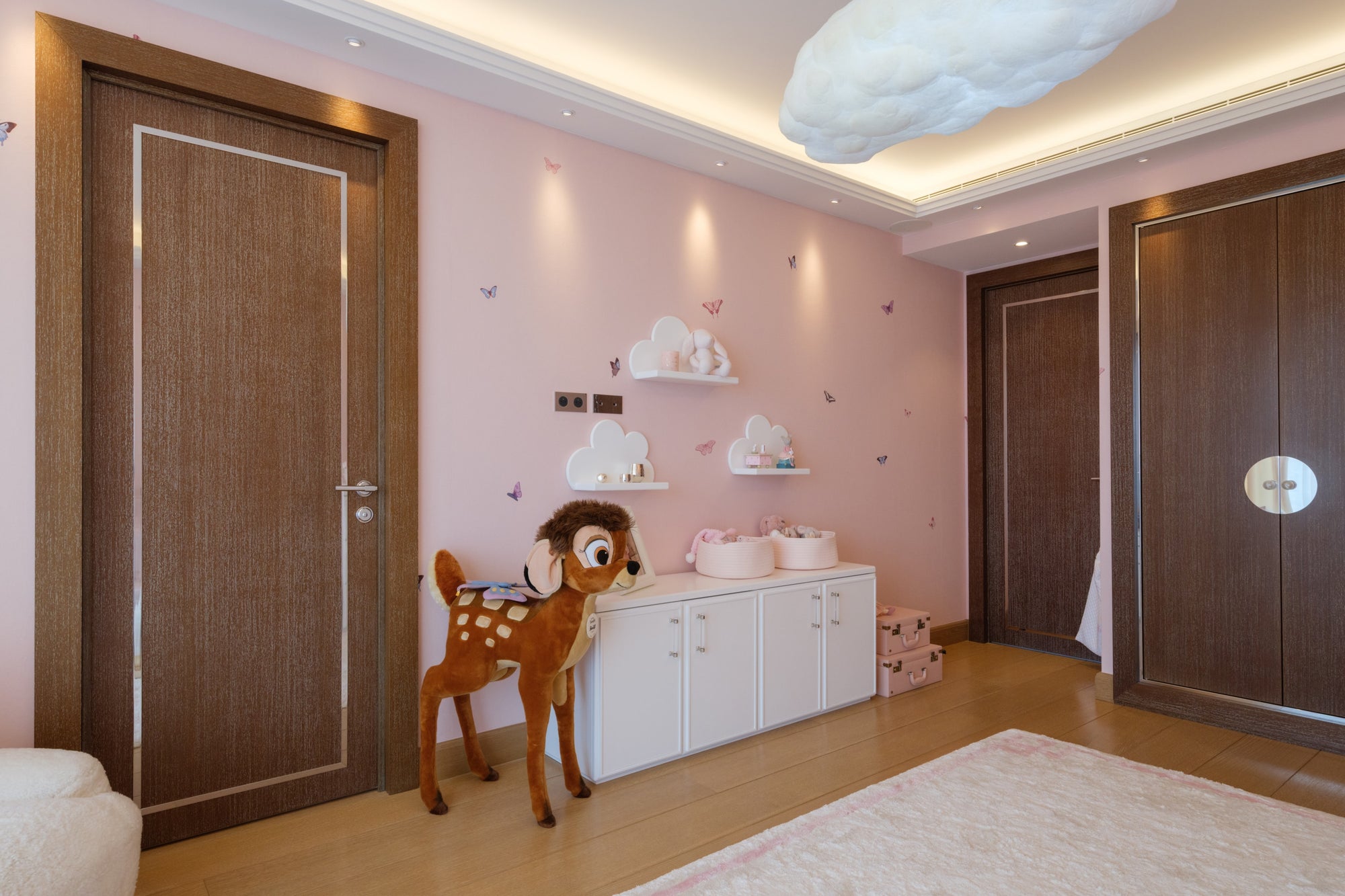 We designed this nursery as a dreamy yet modern space, tailored entirely for our little client. The custom butterfly wallpaper, set against a pale pink background, brings a soft, whimsical charm to the room.