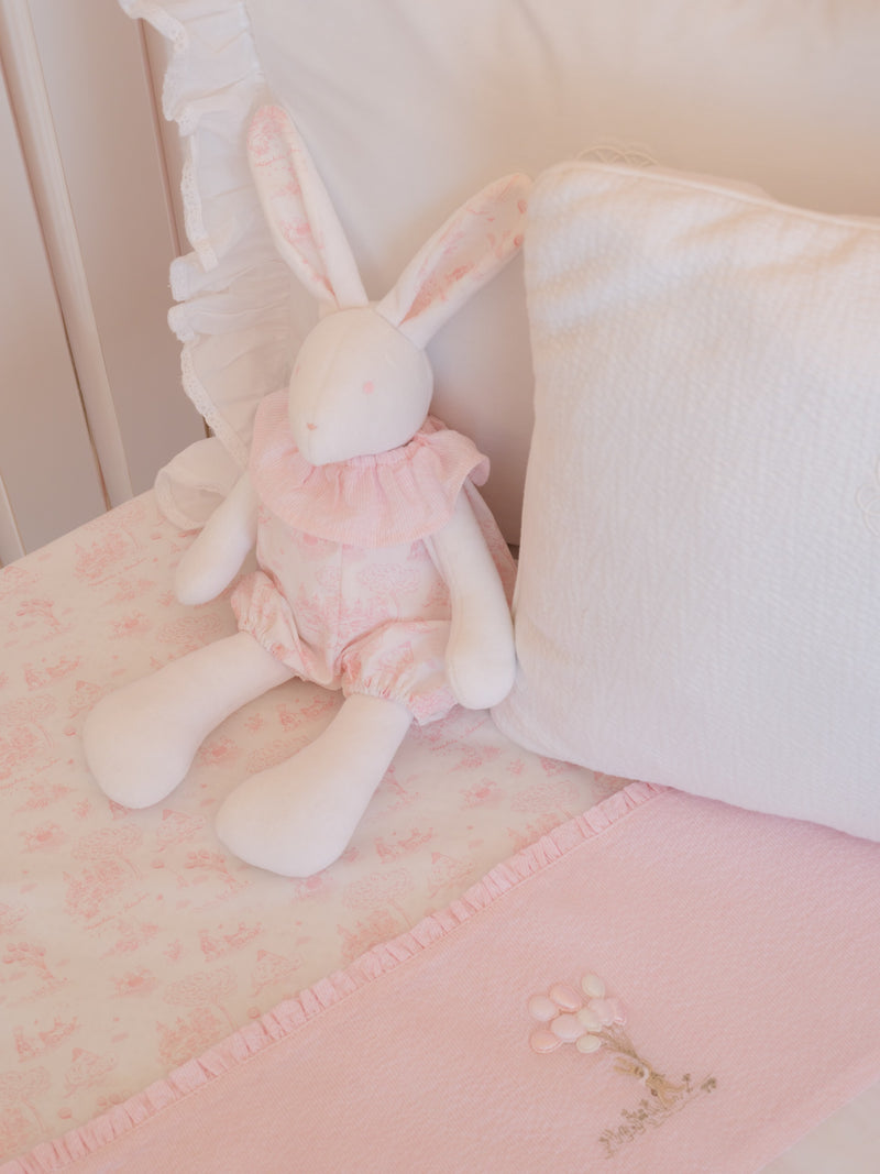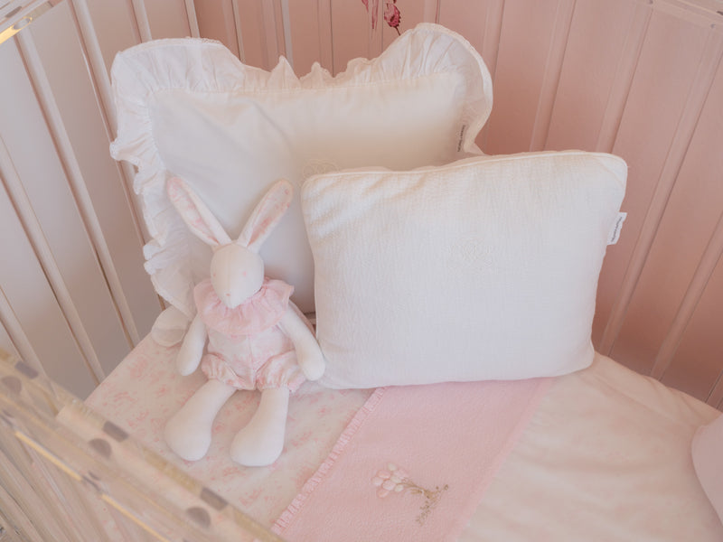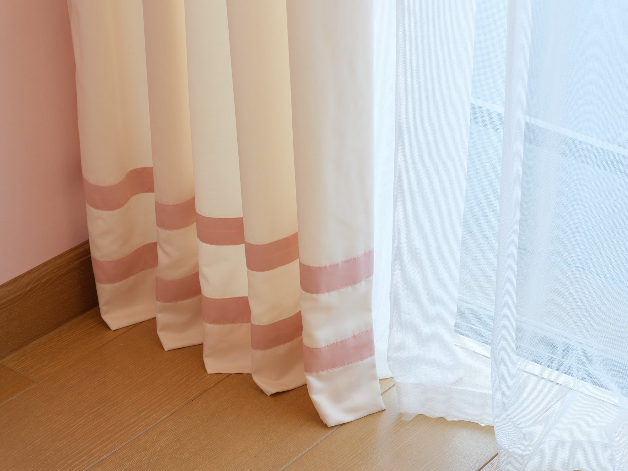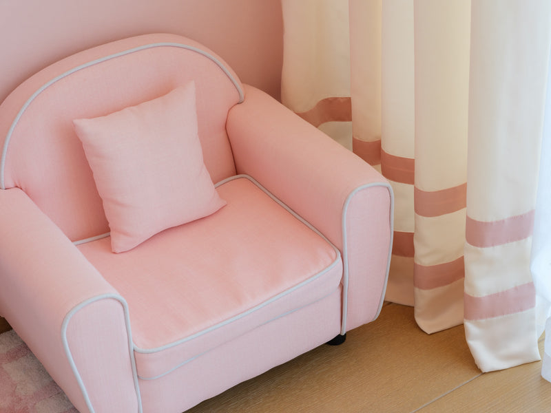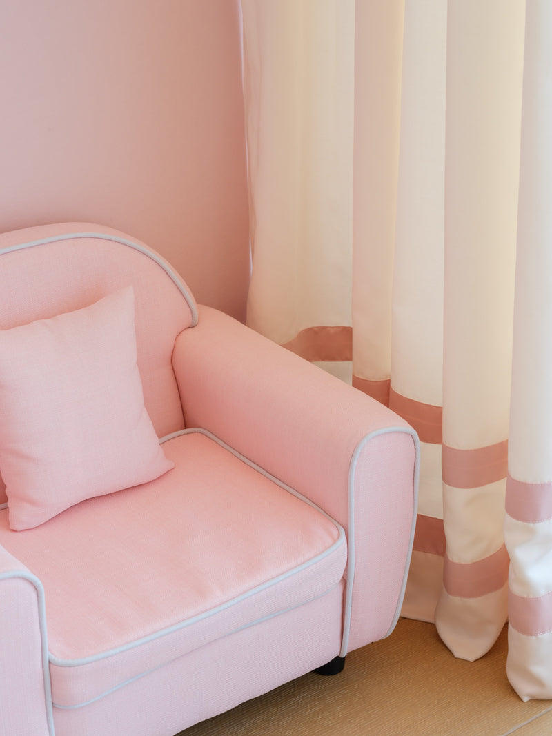 The room is anchored by a made-to-measure ivory tencel rug with a delicate pink Greek key border, adding a sense of calm and softness underfoot. Elegant satin curtains with subtle pink bands complete the space, tying together the palette with grace and warmth.