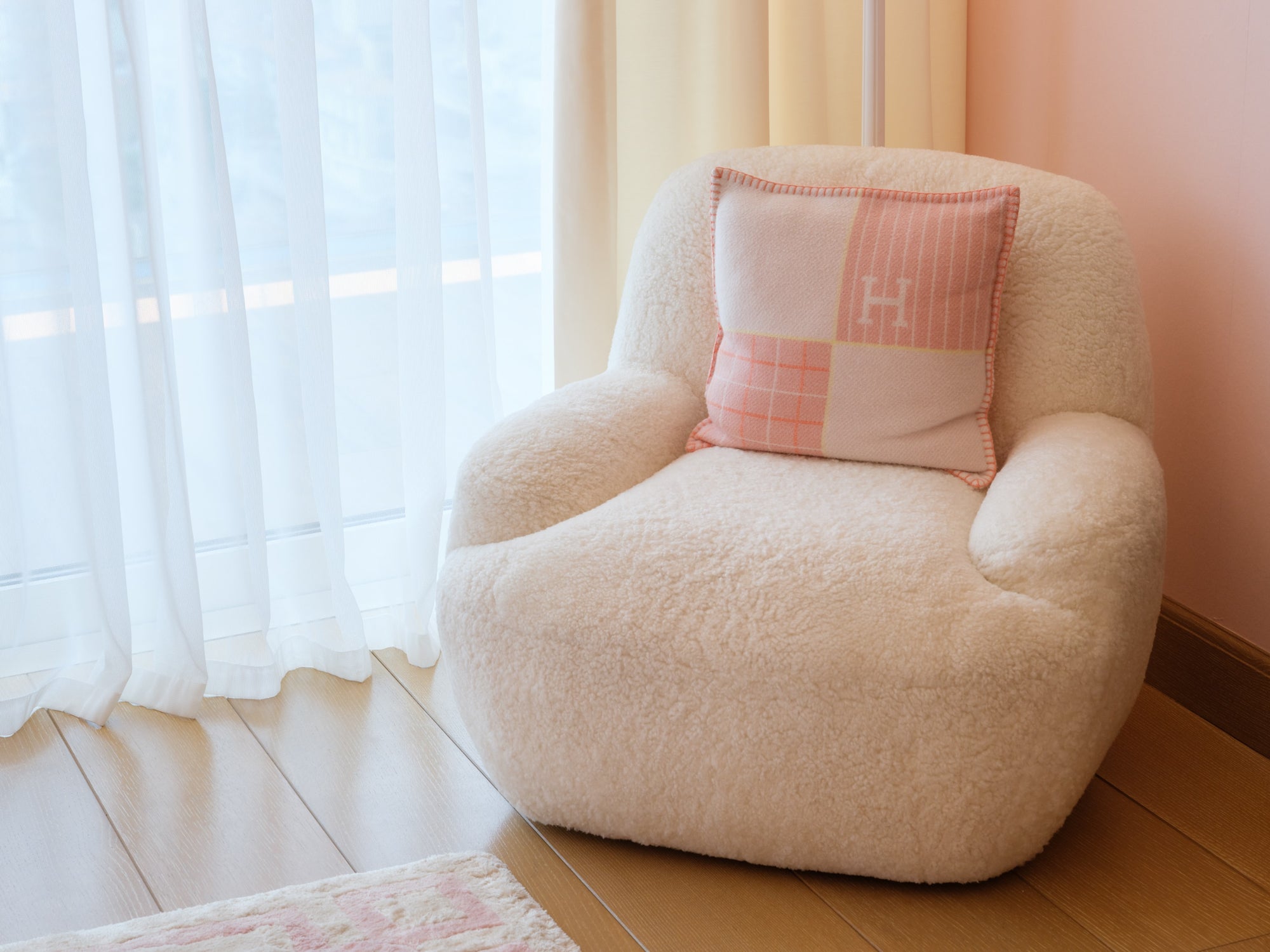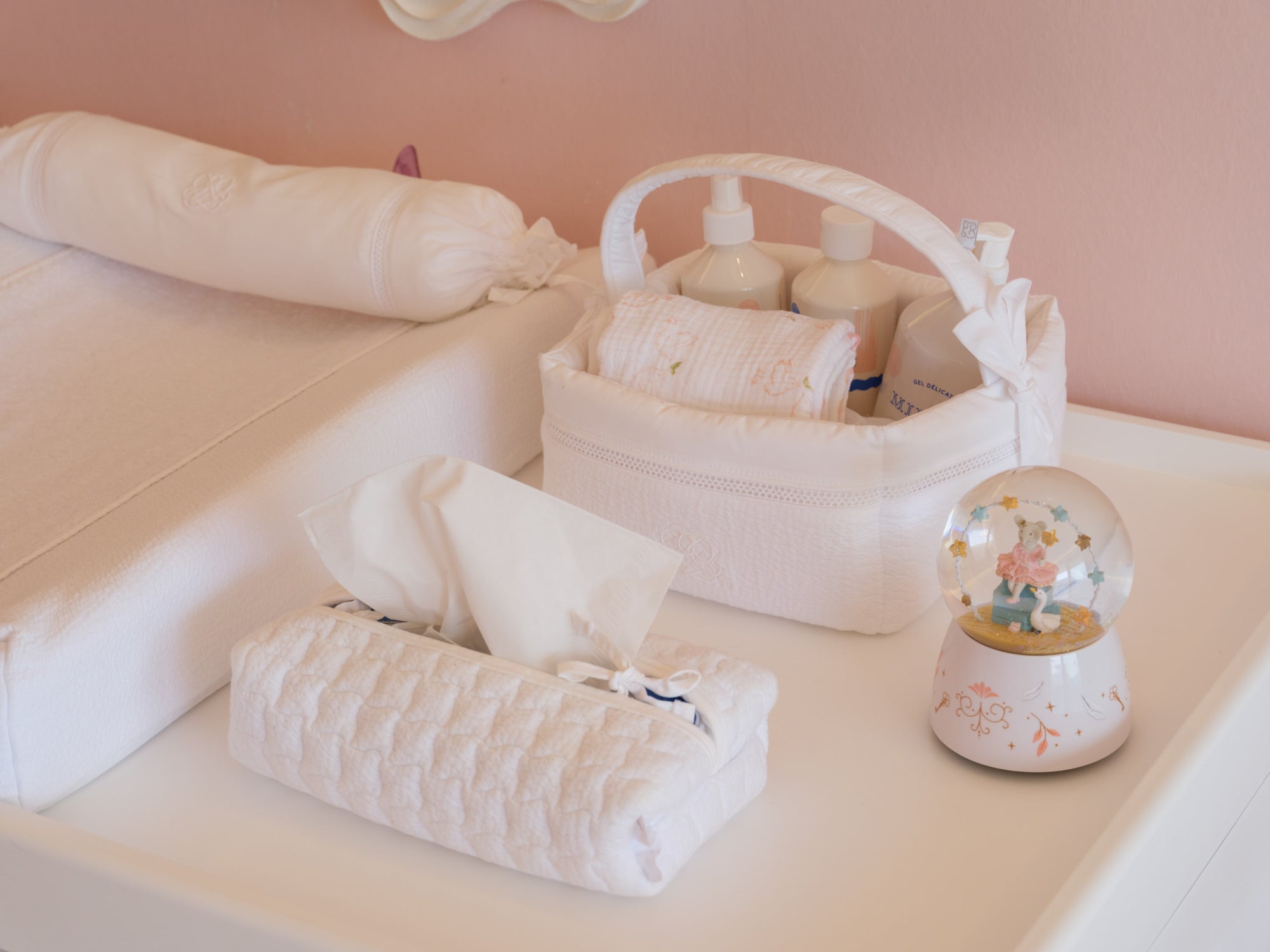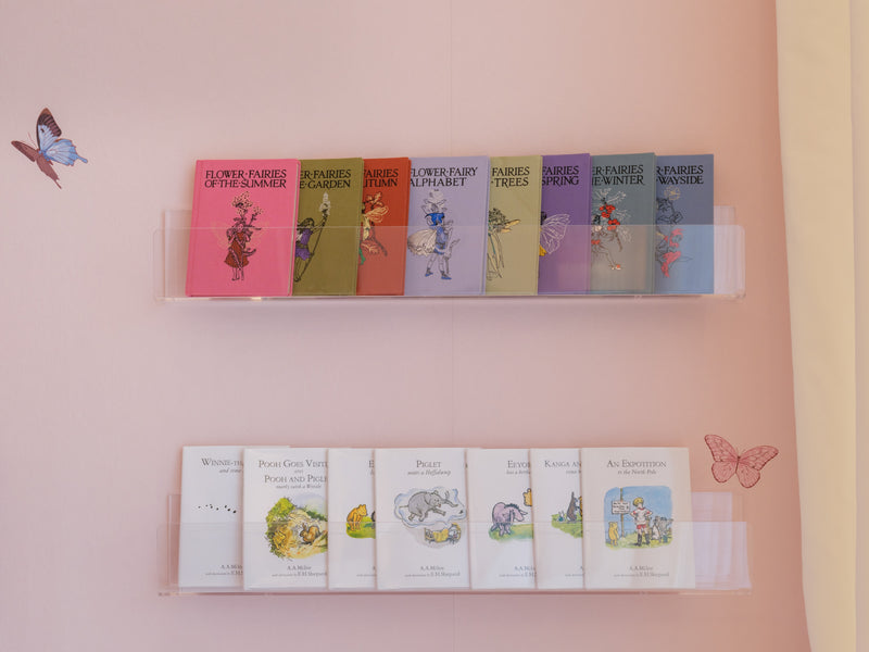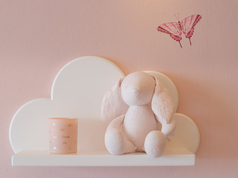 To introduce a contemporary edge, we chose a clear plexiglass crib paired with matching storage units, detailed with white leather and plexiglass handles for a refined finish. A cozy mini armchair and wall-mounted shelves create a welcoming reading corner, while our signature cloud shelves offer the perfect spot to display her favorite accessories.