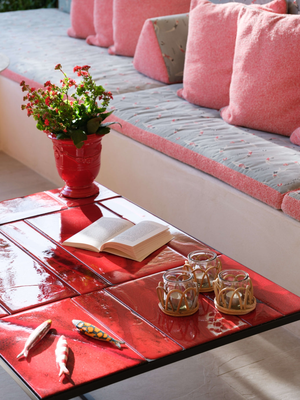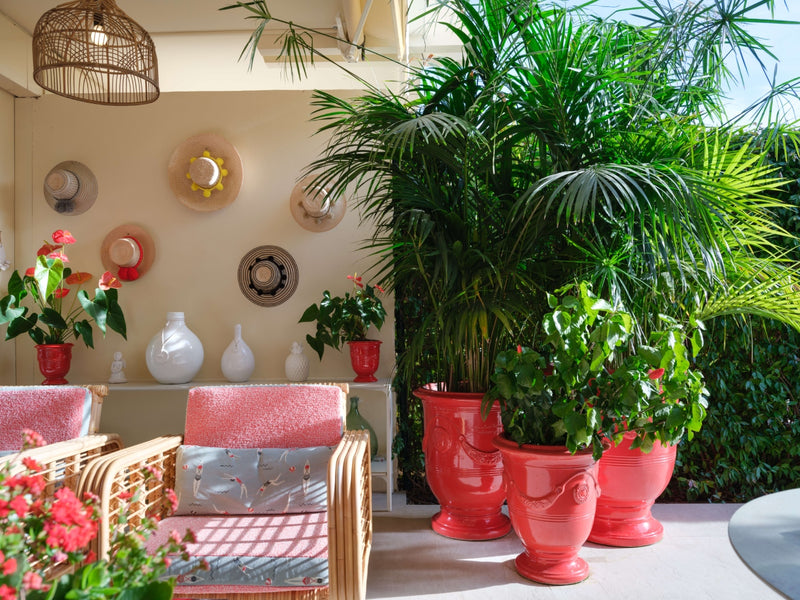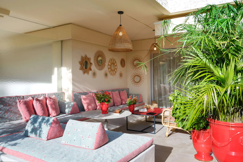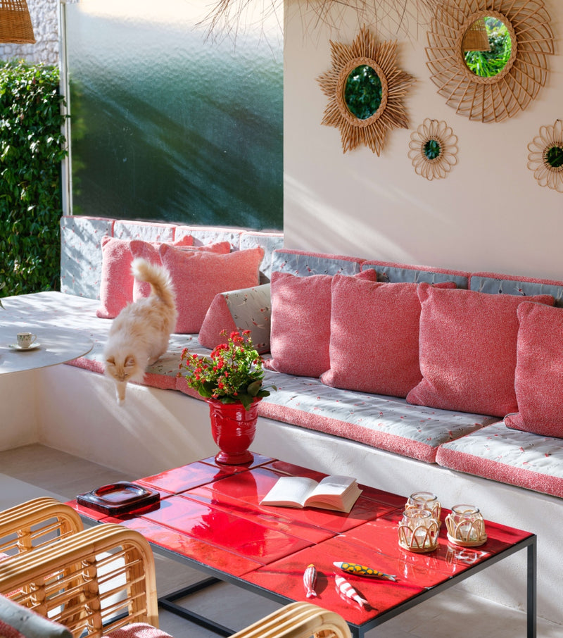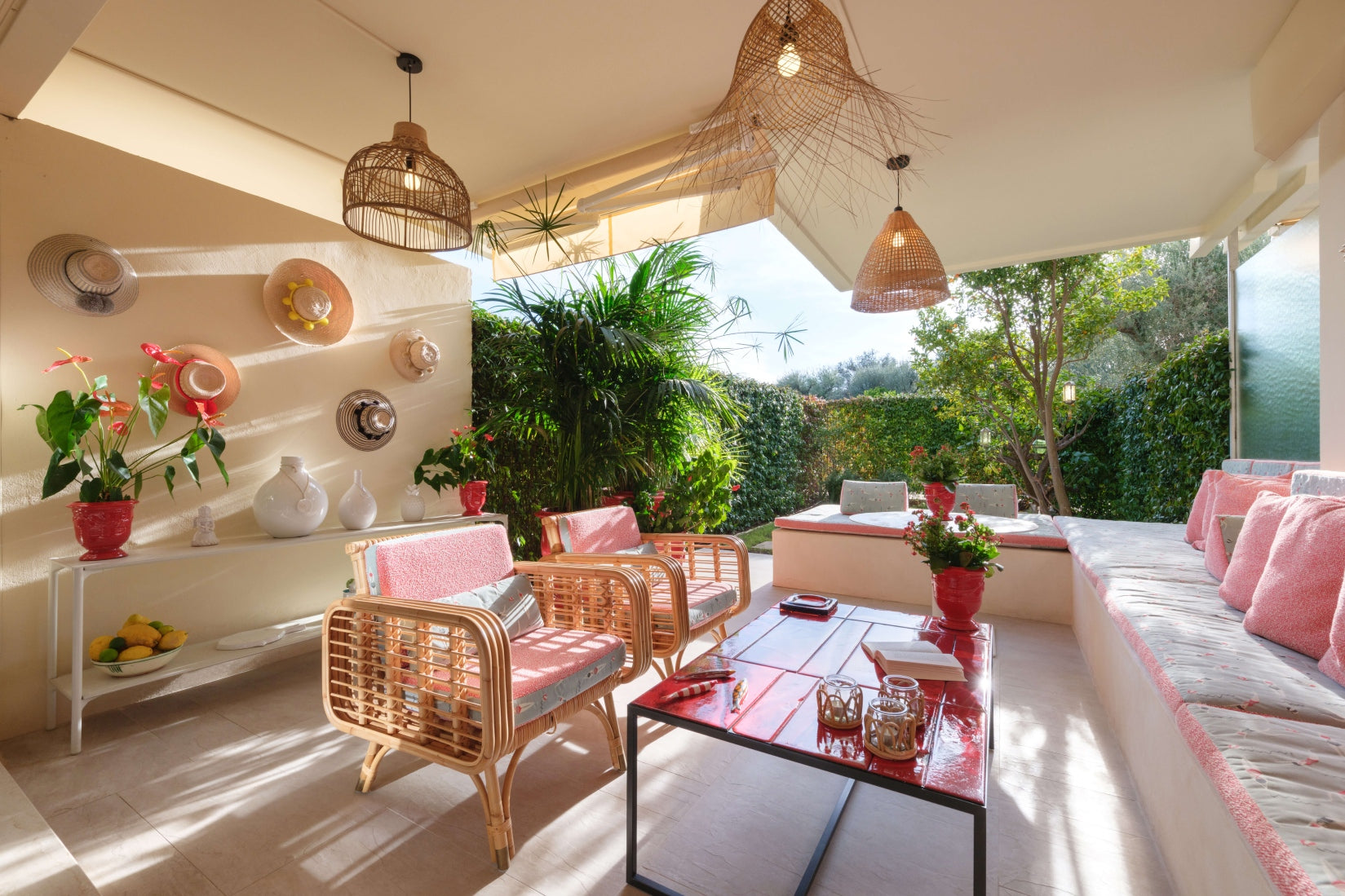 Outside, a magical garden awaits with Riviera fabric, rattan mirrors, and Paola Lenti furniture, set against the backdrop of vibrant red ceramic pots. This piece of heaven is infused with the client's personality, making it a truly unique home.