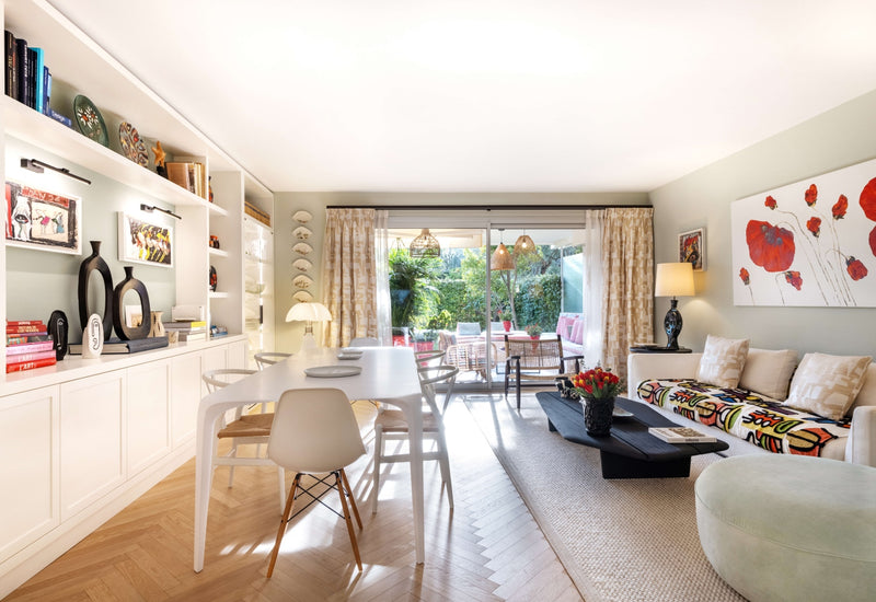 Situated in a beautiful estate in Cap Martin, surrounded by enchanting olive tree gardens, this apartment boasts an eclectic living room with iconic furniture and ethnic touches.