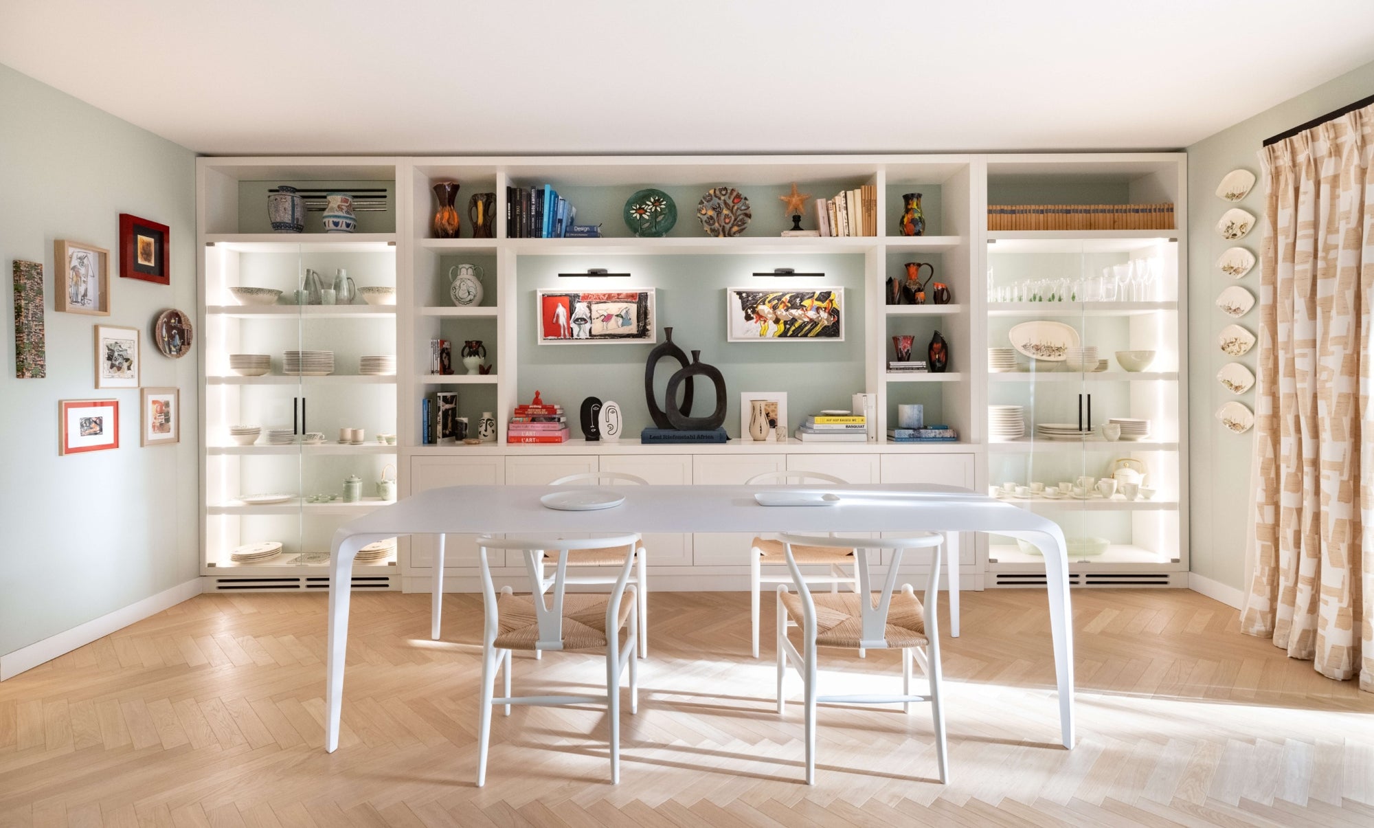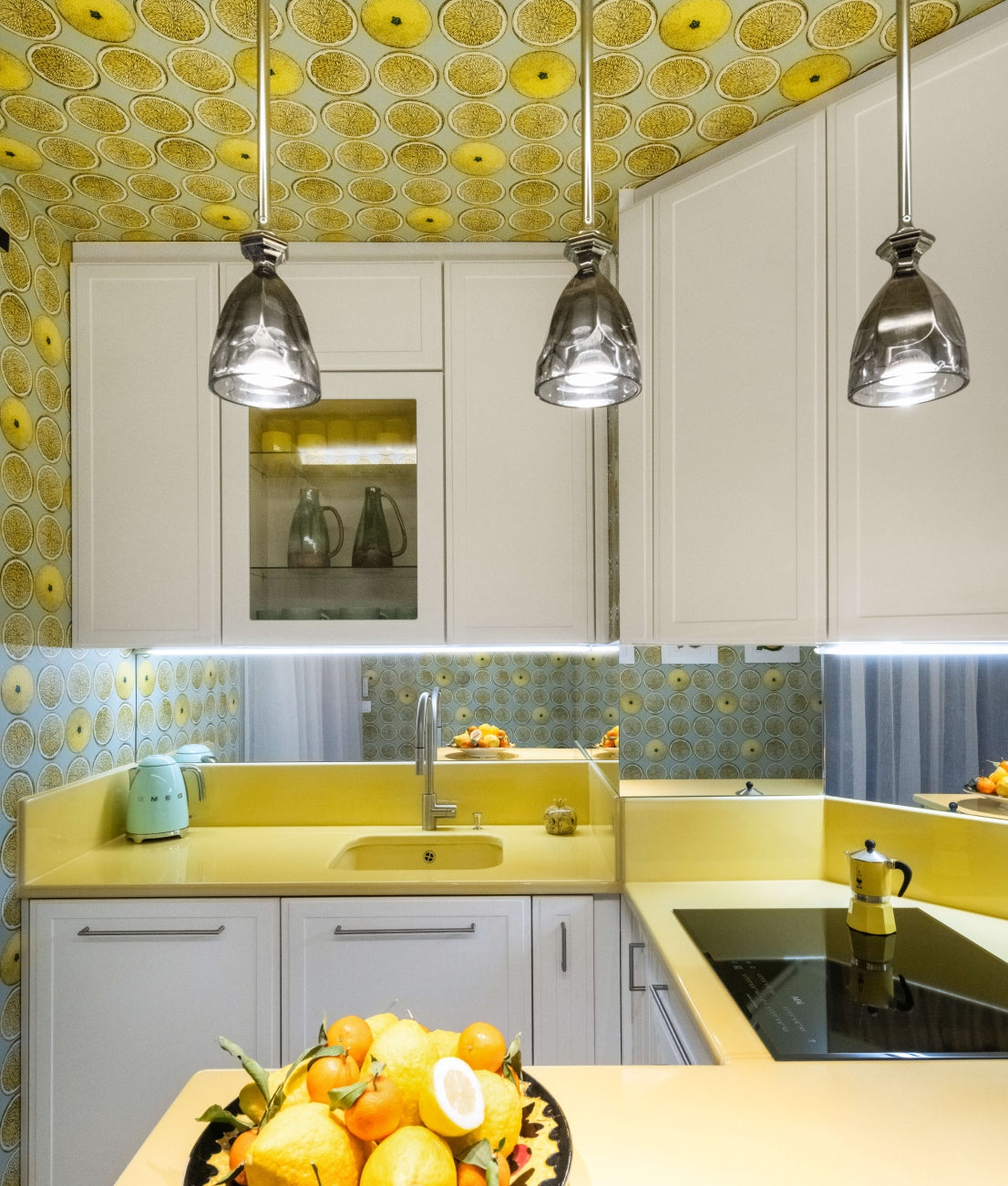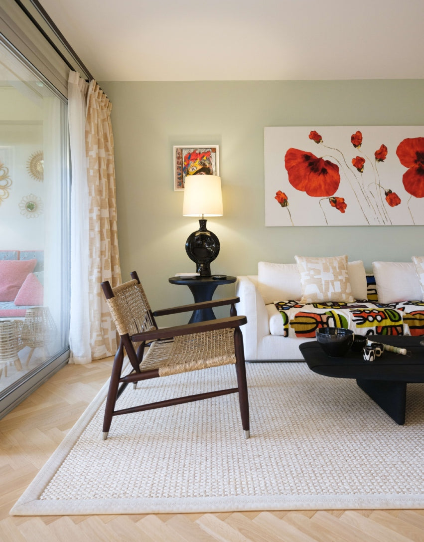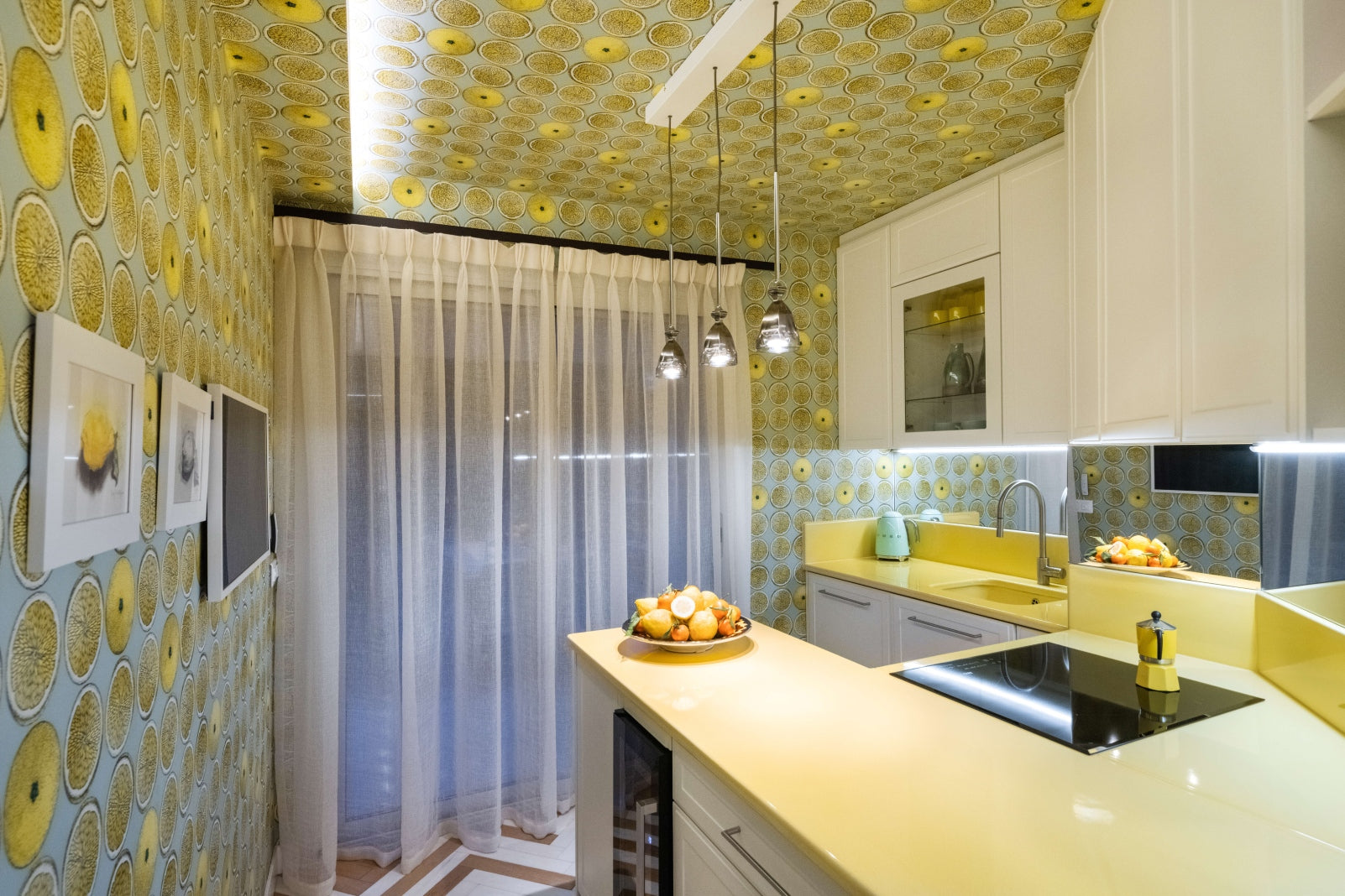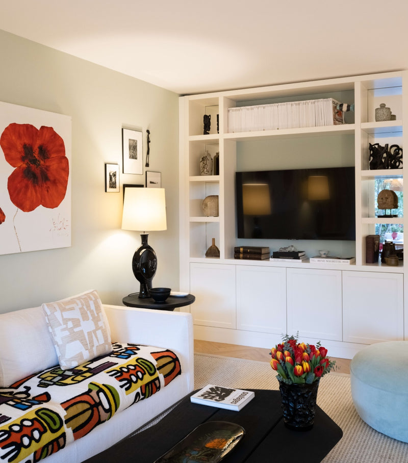 The space is enhanced by the client's own artworks and ceramic pieces from local Vallauris artists. Soft Ceylon wall colors create the perfect backdrop for bolder black and red tones, resulting in a harmonious blend of hues. The kitchen is a playful delight with yellow walls and Fornasetti lemon wallpaper, paying homage to the nearby city of Menton.