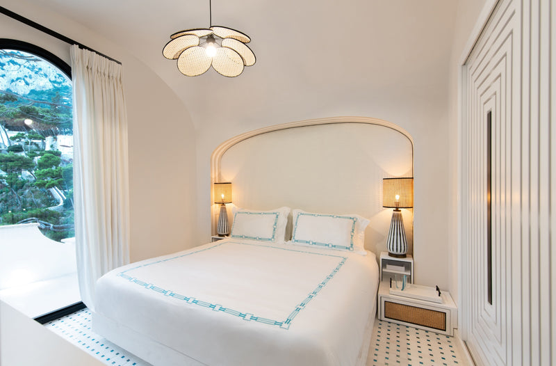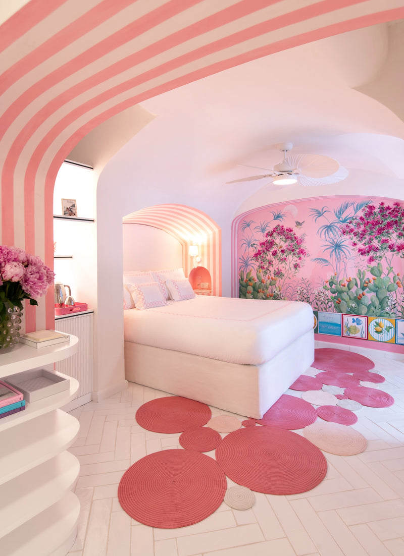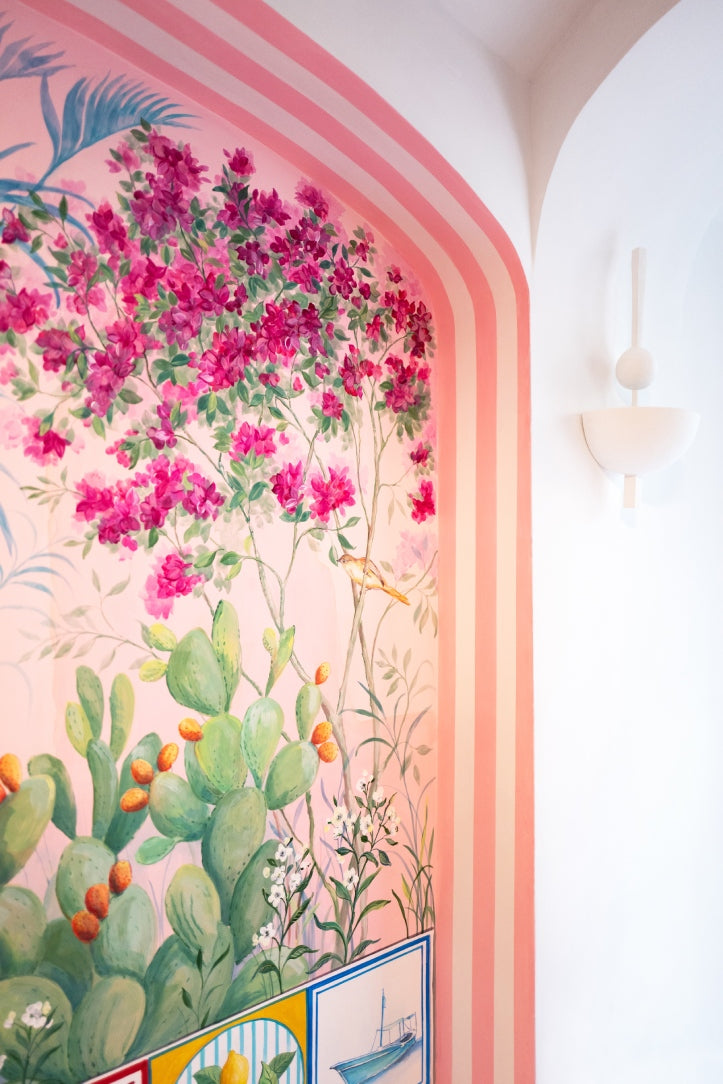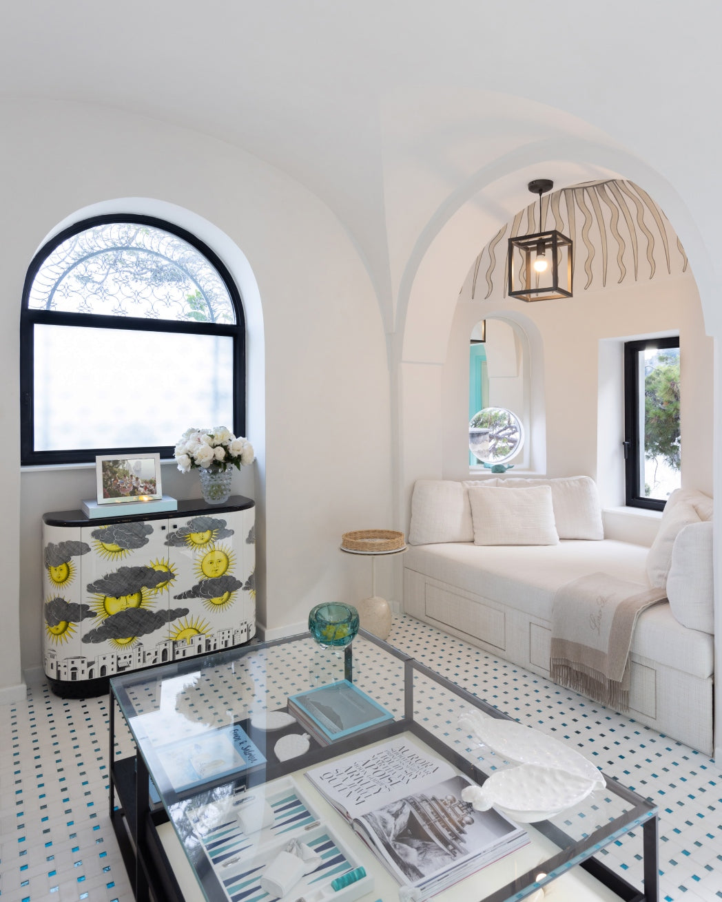 From custom Sicis white Taxos marble mosaic floors to murals painted by Francesca Marrabini, Capri Retreat has a doll-house effect by the sea.