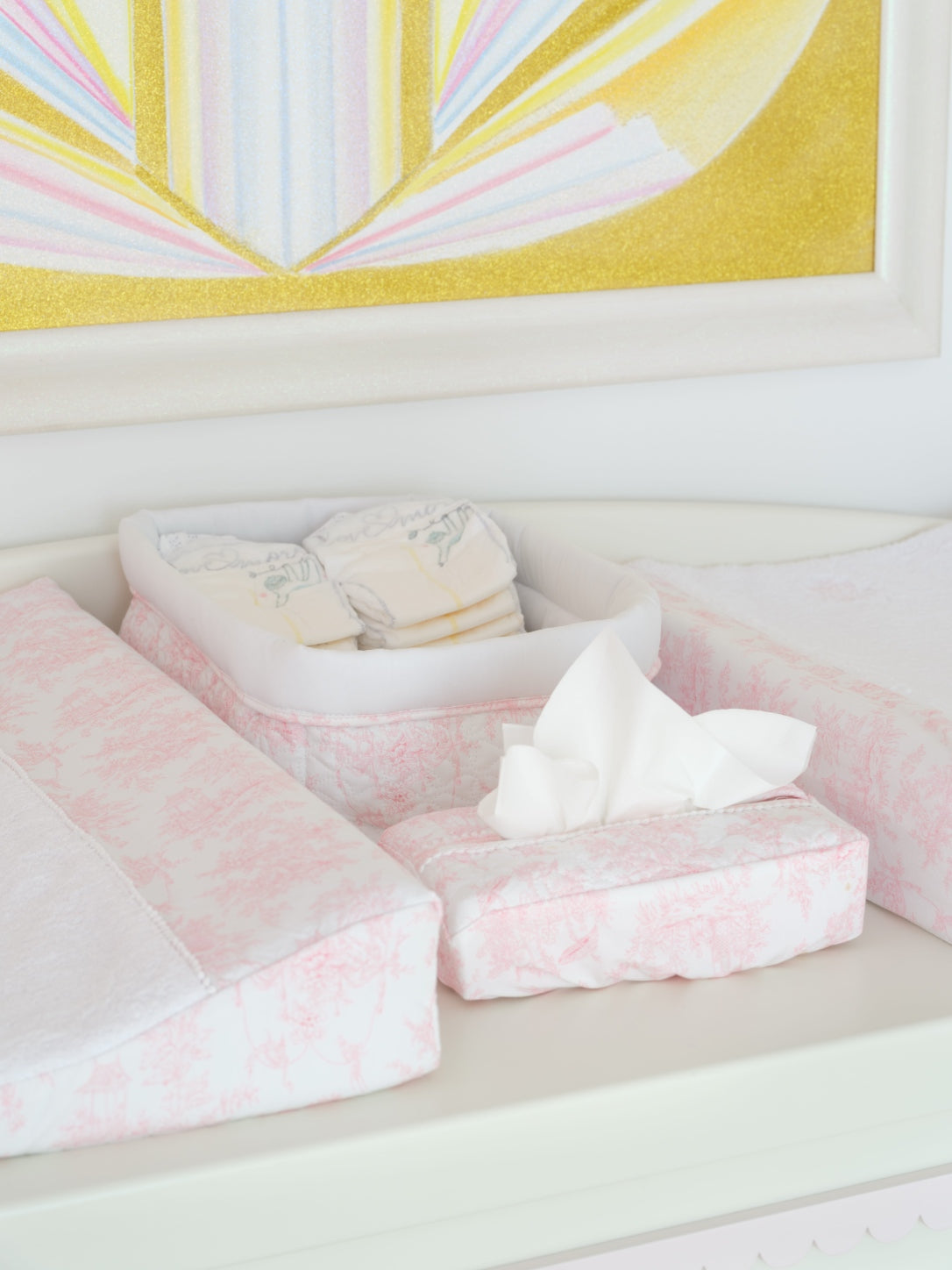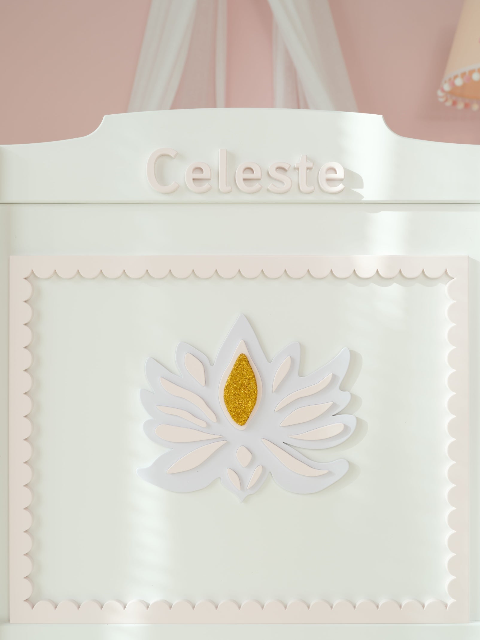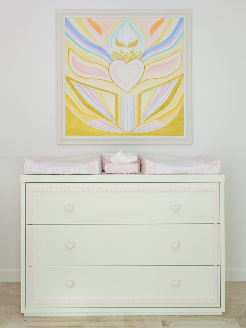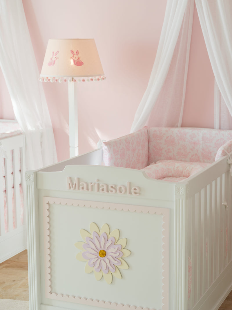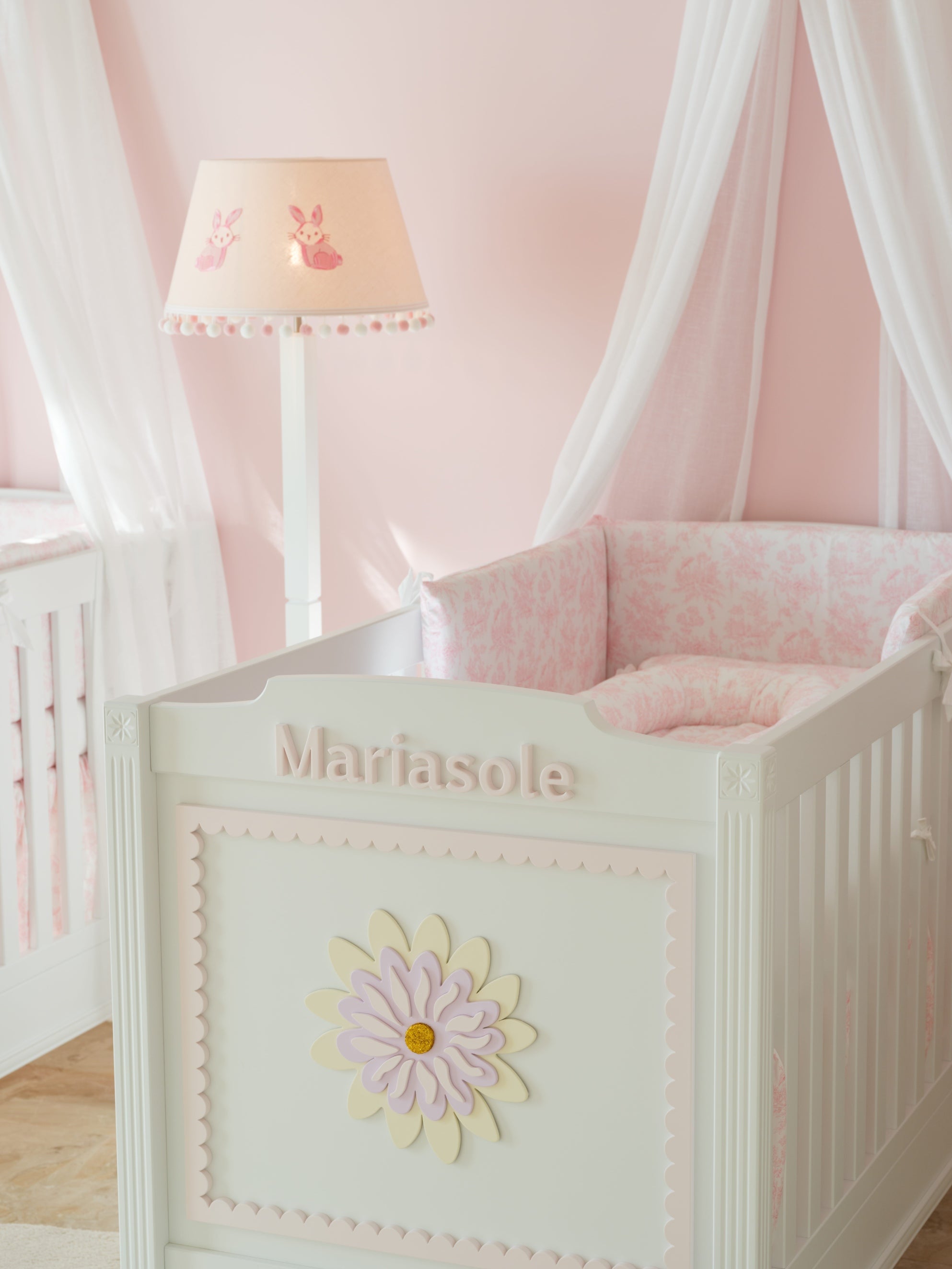 Injecting a personal touch, the clients contributed powerful artwork, proudly displayed alongside personalized Theophile & Patachou cribs featuring custom made laser-cut wooden symbols and each of the twins names.