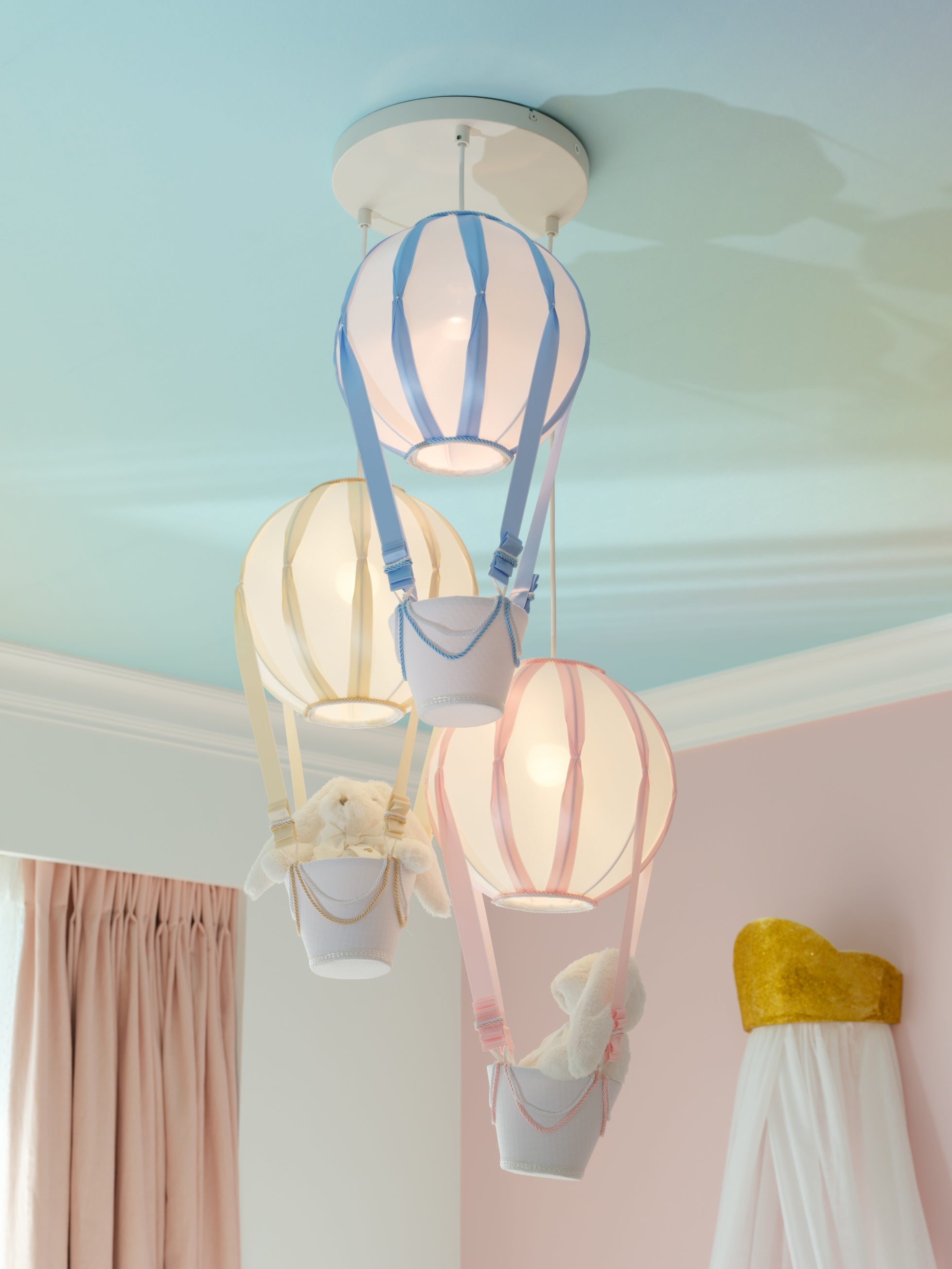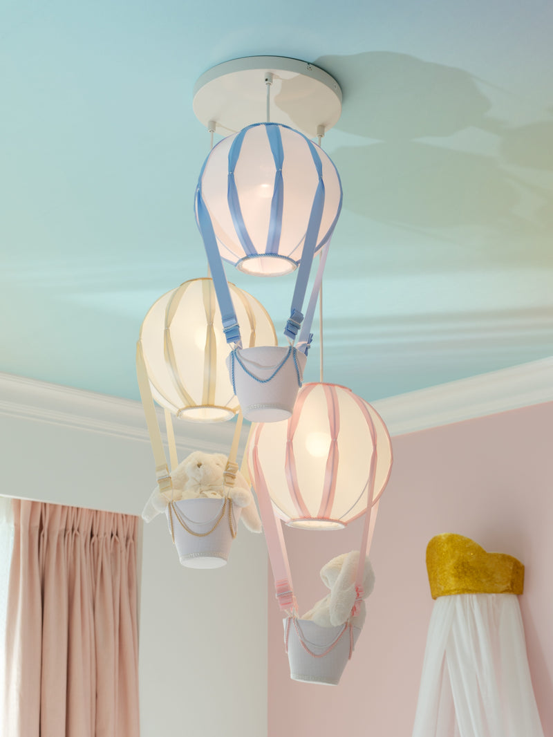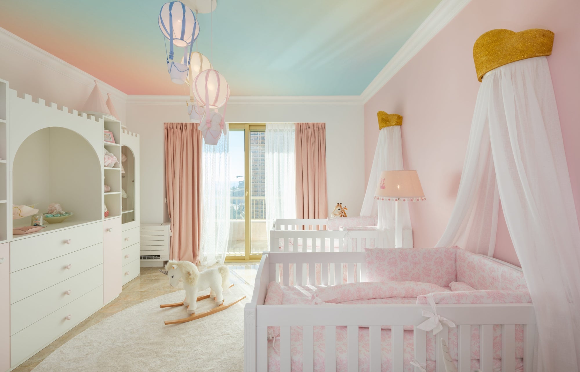 The ceiling boasts holographic wallpaper in pastel tones, paired with Savio Firmino’s hot air balloon lights for a magical backdrop.