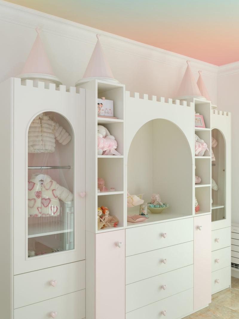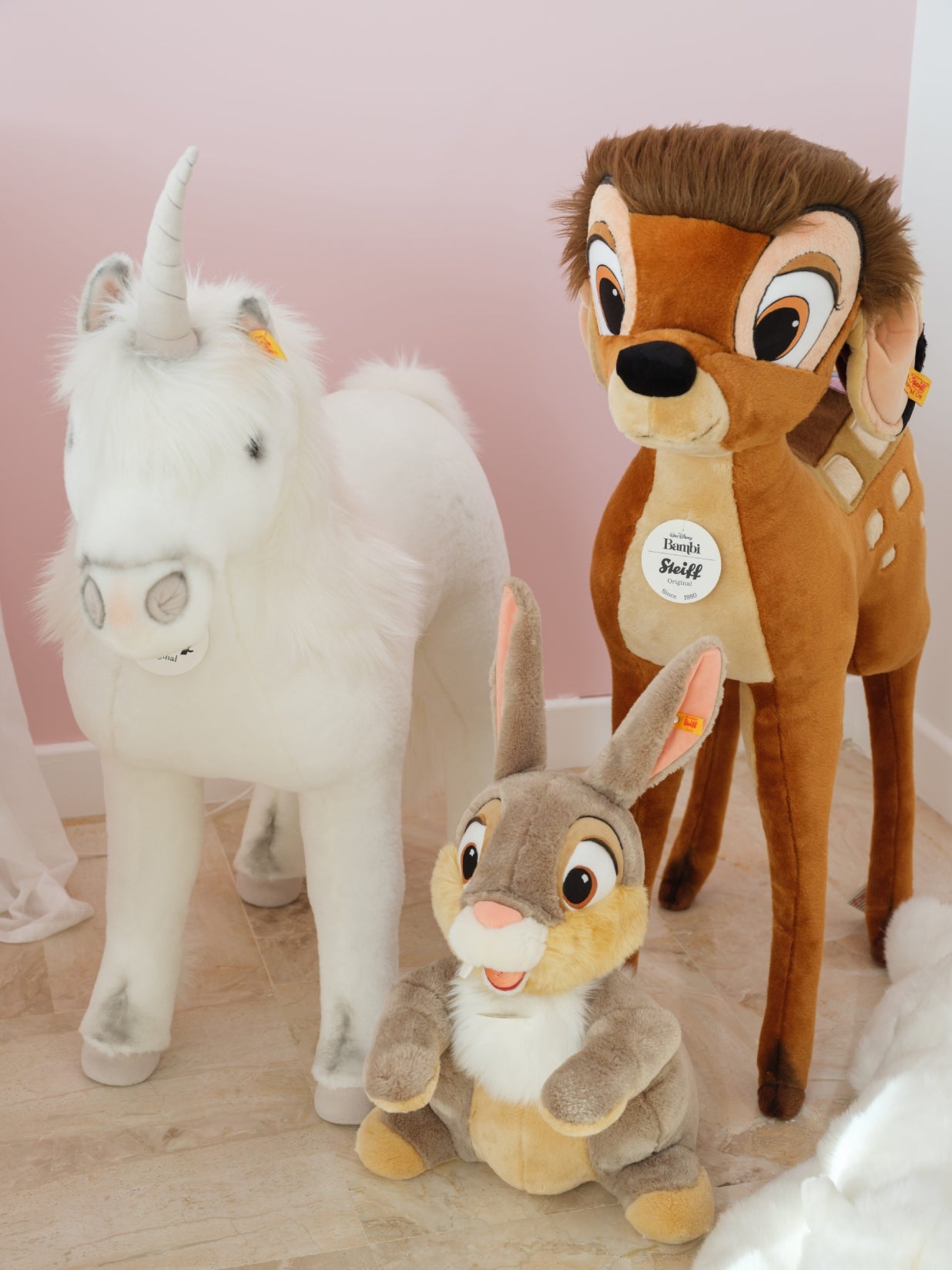 Finally, we created a custom castle bookcase and accessorised the room with a majestic Steiff unicorn, a Bambi, and a rabbit to wrap up the magical kingdom theme.
