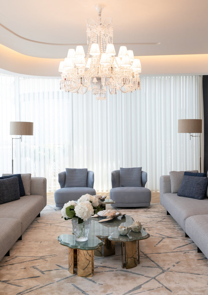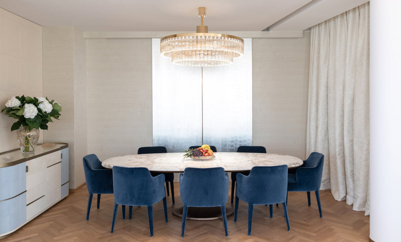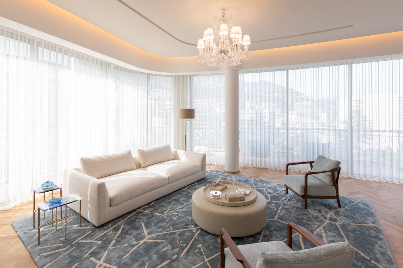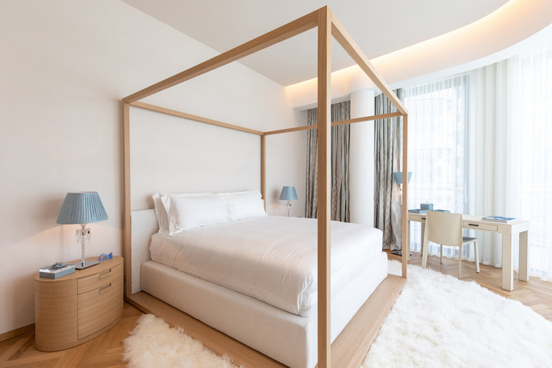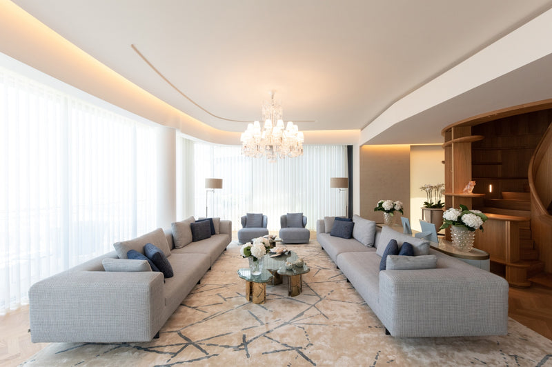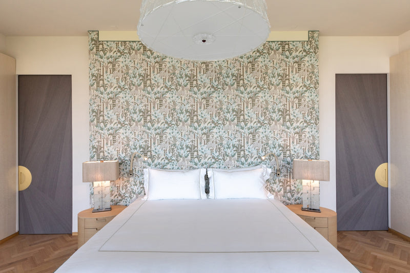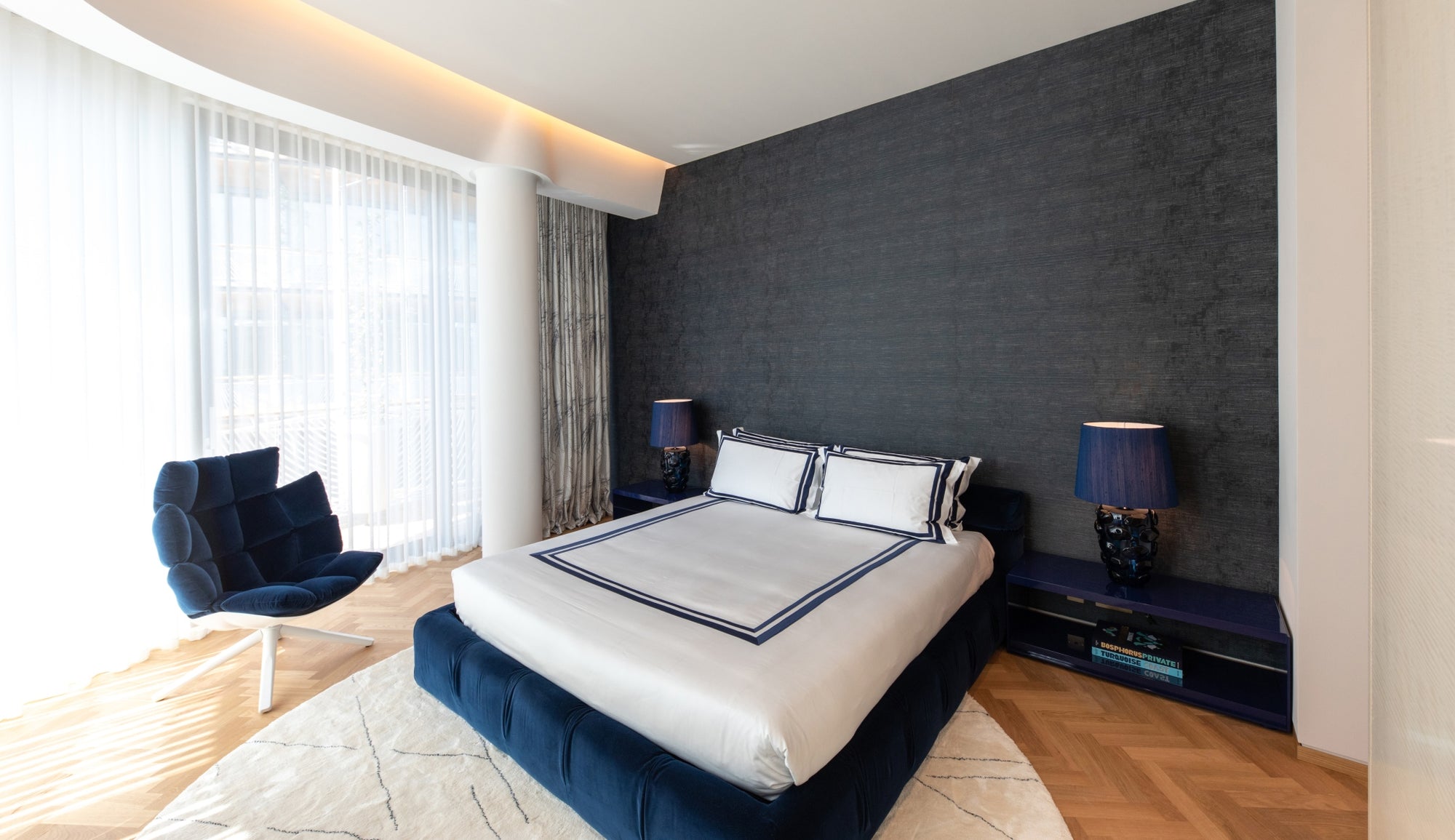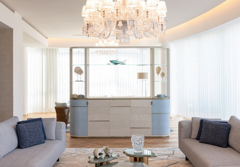 The soft furnishings by Paola Lenti, Baxter and B&B in soft colors with touches of pale blue perfectly complement the natural light that floods the space, creating a serene and calming atmosphere. Custom pieces such as sideboards, nightstands and panels add to the luxurious feel of the space, with their use of shagreen, leather, brass, suede, silver leaf, and other premium materials.