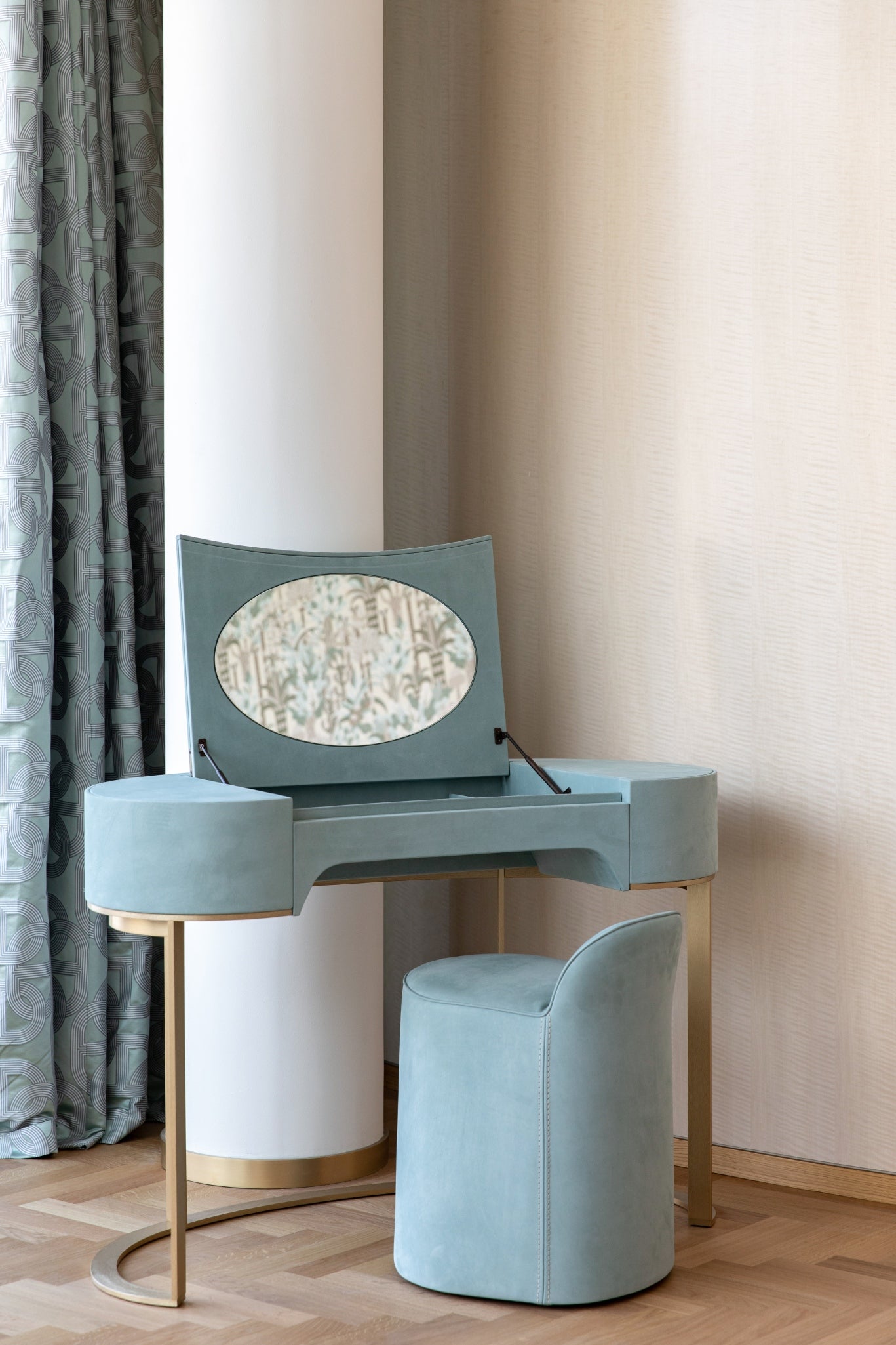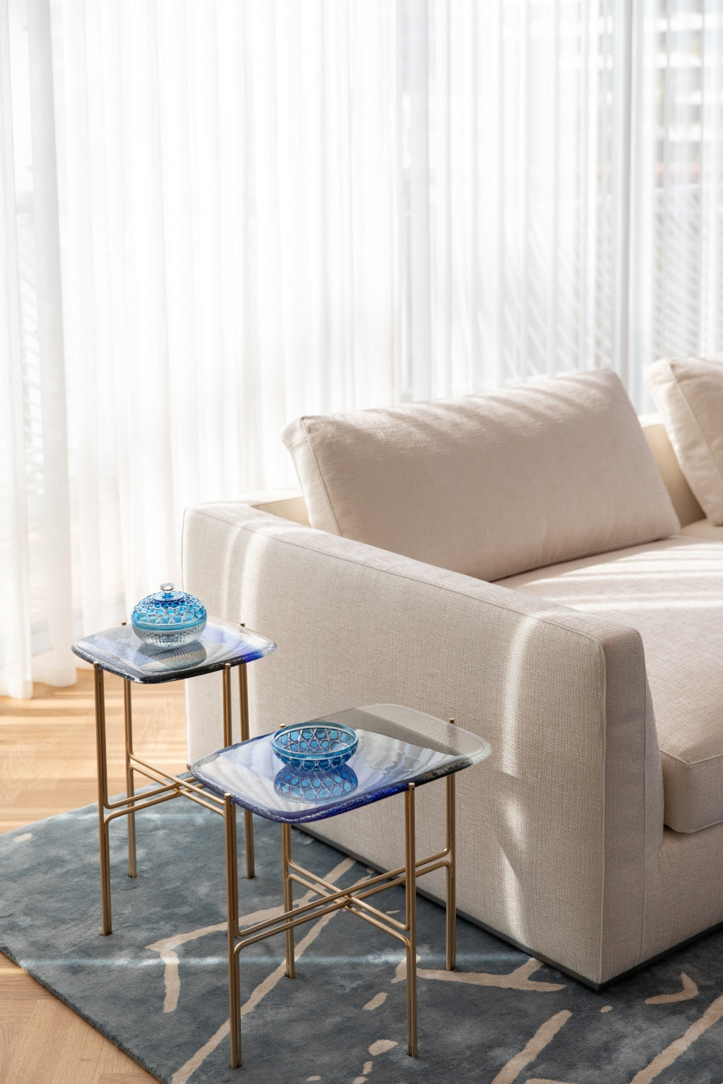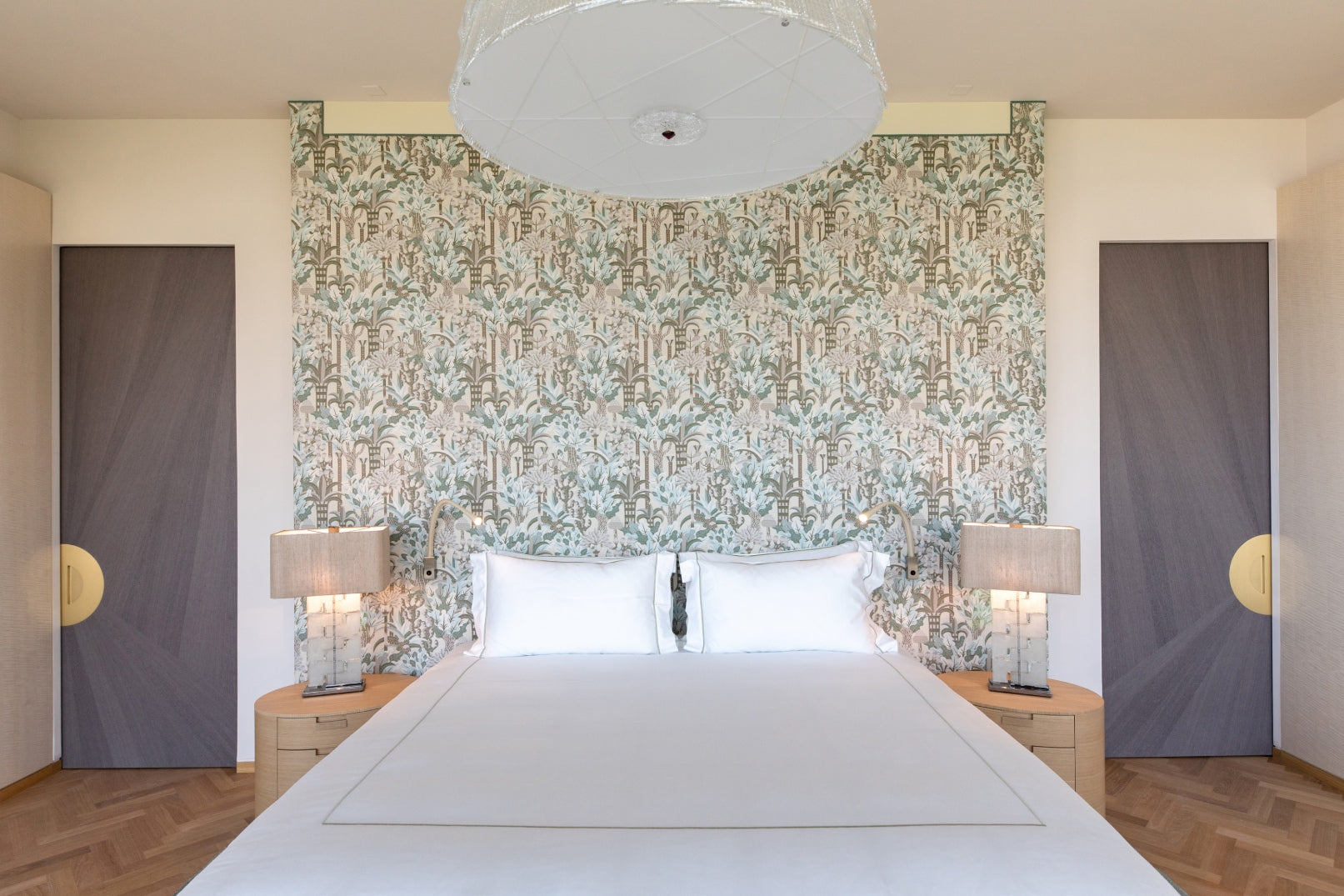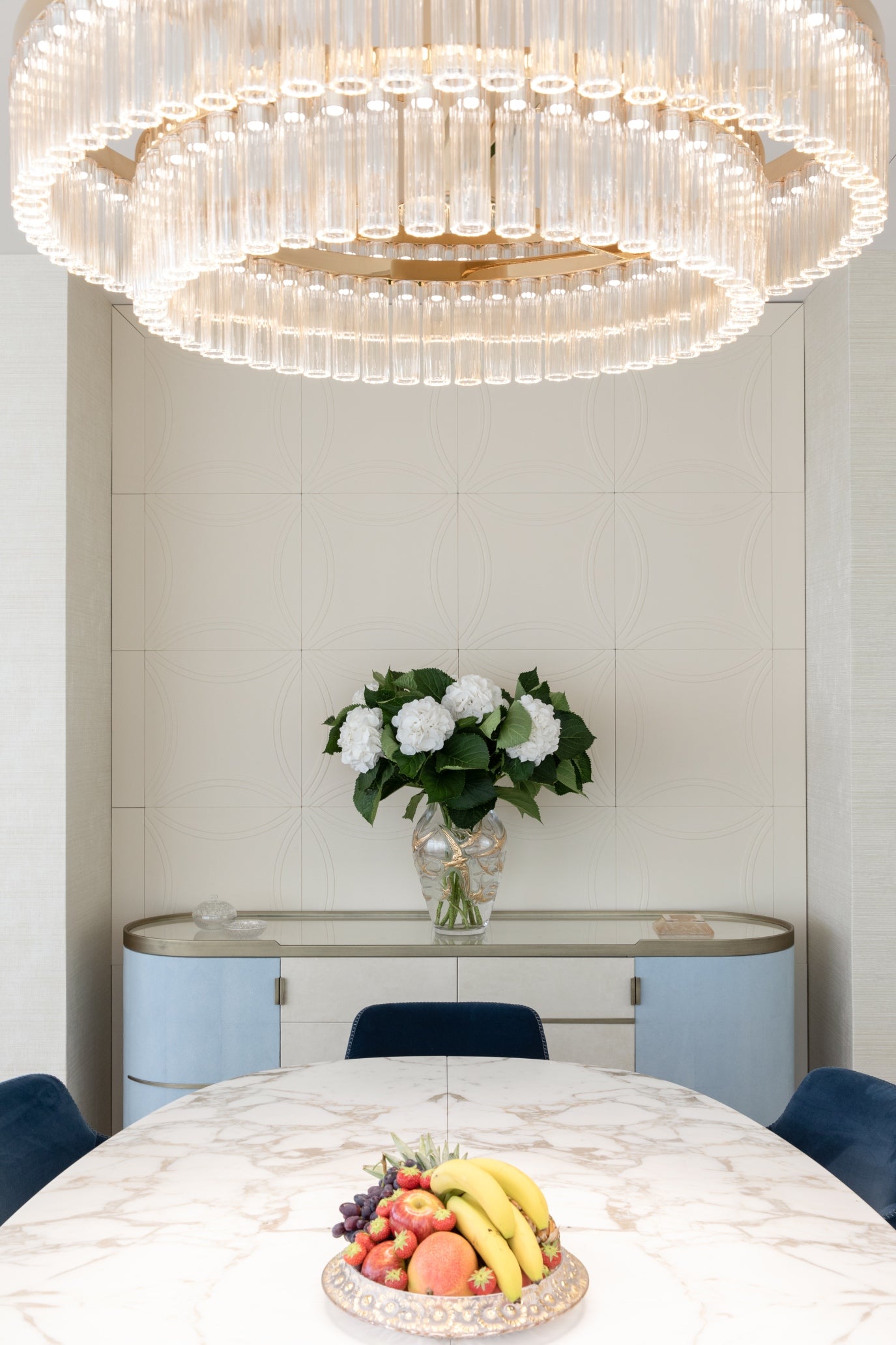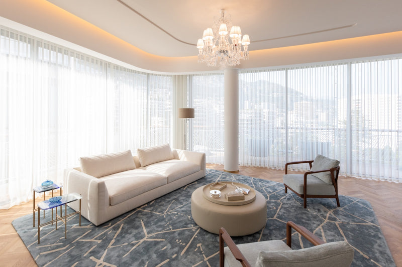 The soft furnishings by Paola Lenti, Baxter and B&B in soft colors with touches of pale blue perfectly complement the natural light that floods the space, creating a serene and calming atmosphere. Custom pieces such as sideboards, nightstands and panels add to the luxurious feel of the space, with their use of shagreen, leather, brass, suede, silver leaf, and other premium materials.