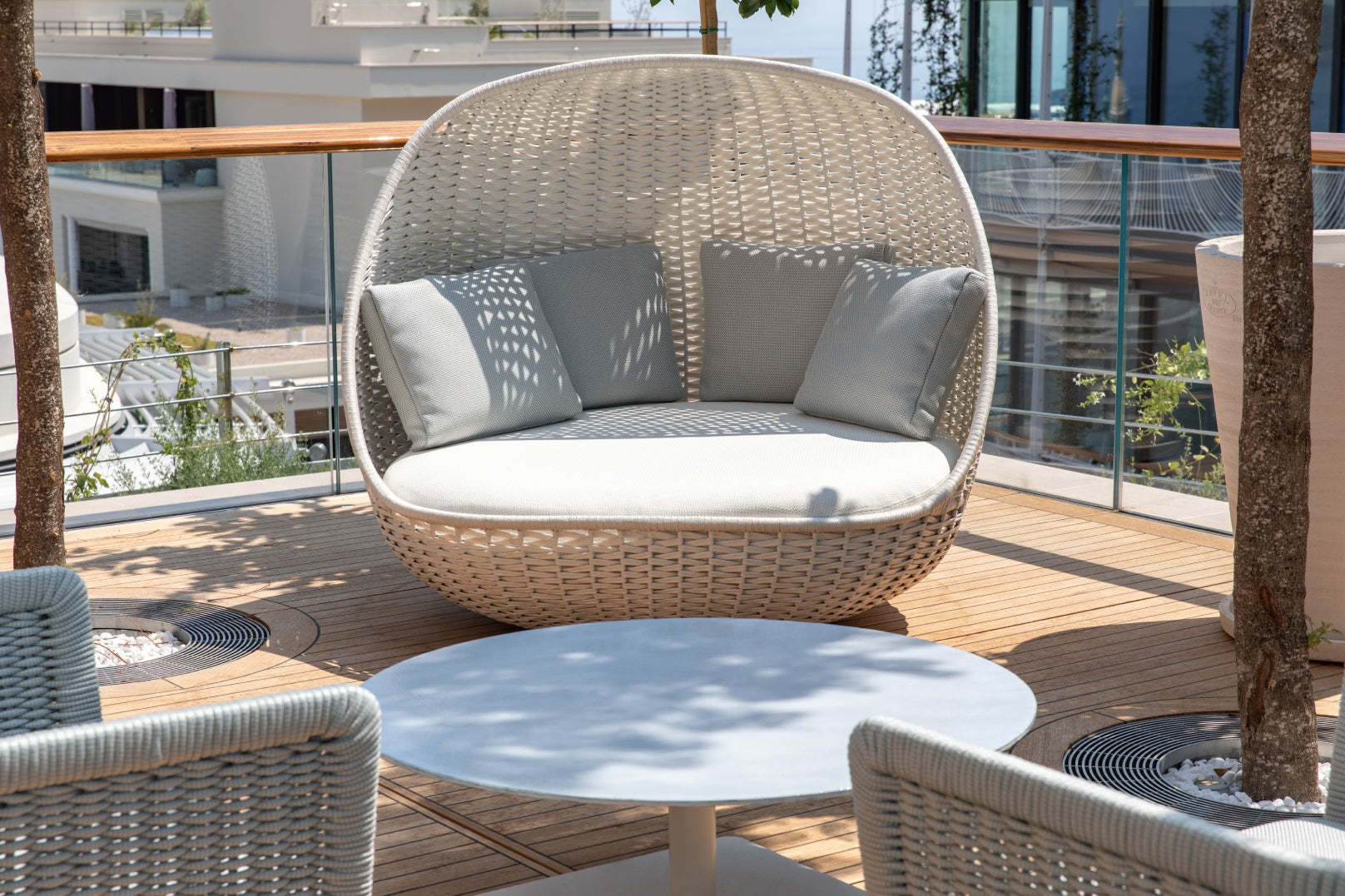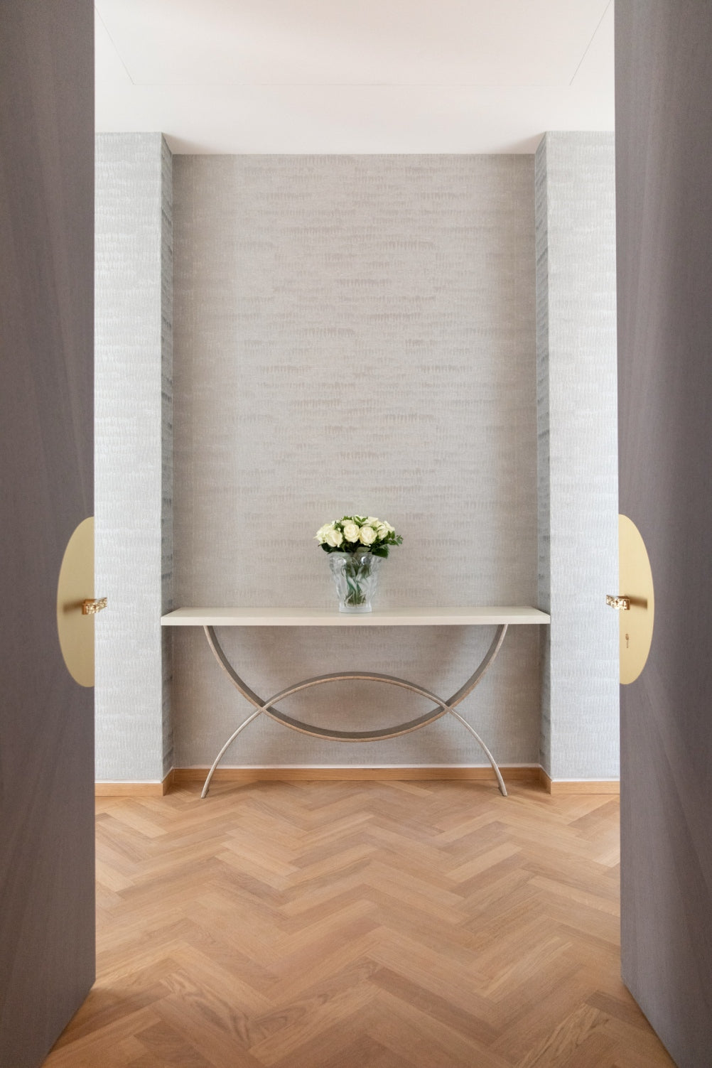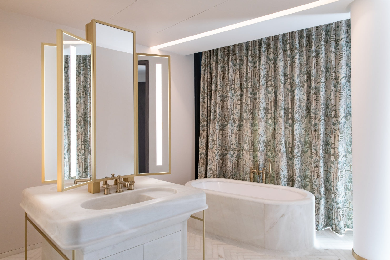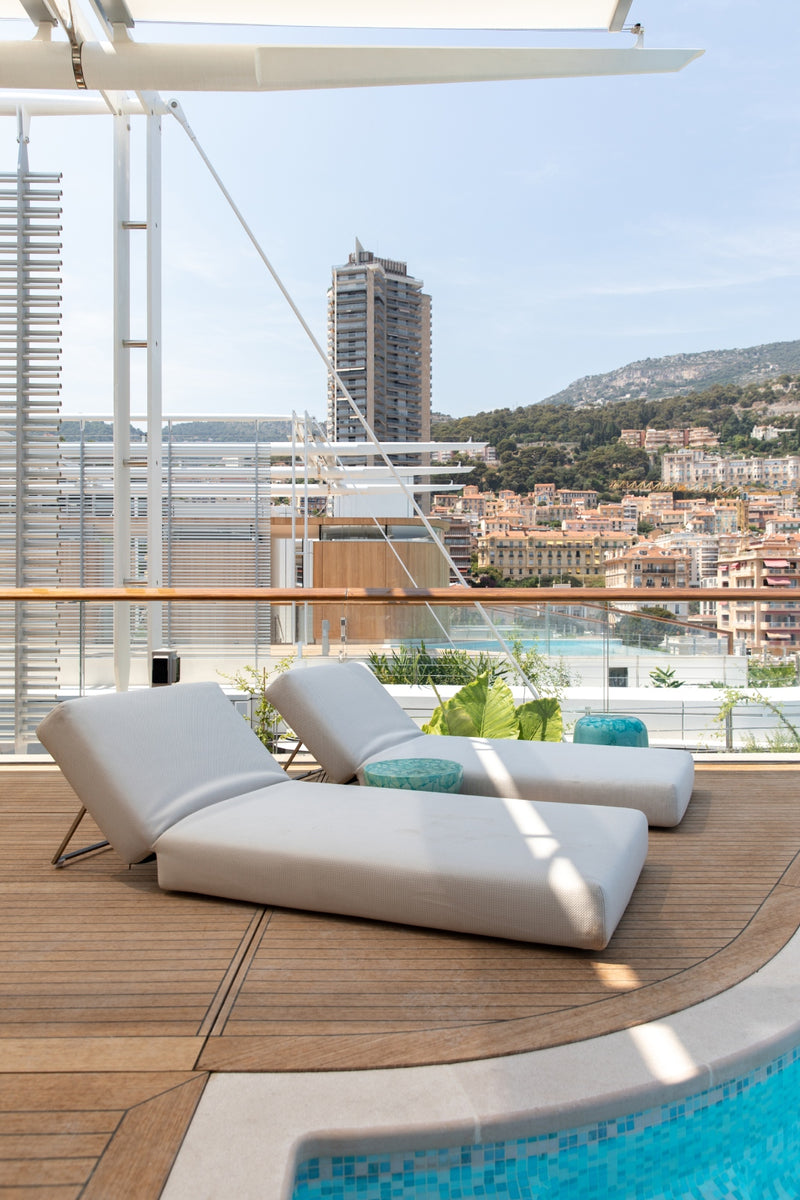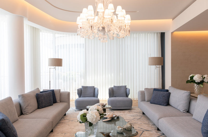 The soft furnishings by Paola Lenti, Baxter and B&B in soft colors with touches of pale blue perfectly complement the natural light that floods the space, creating a serene and calming atmosphere. Custom pieces such as sideboards, nightstands and panels add to the luxurious feel of the space, with their use of shagreen, leather, brass, suede, silver leaf, and other premium materials.