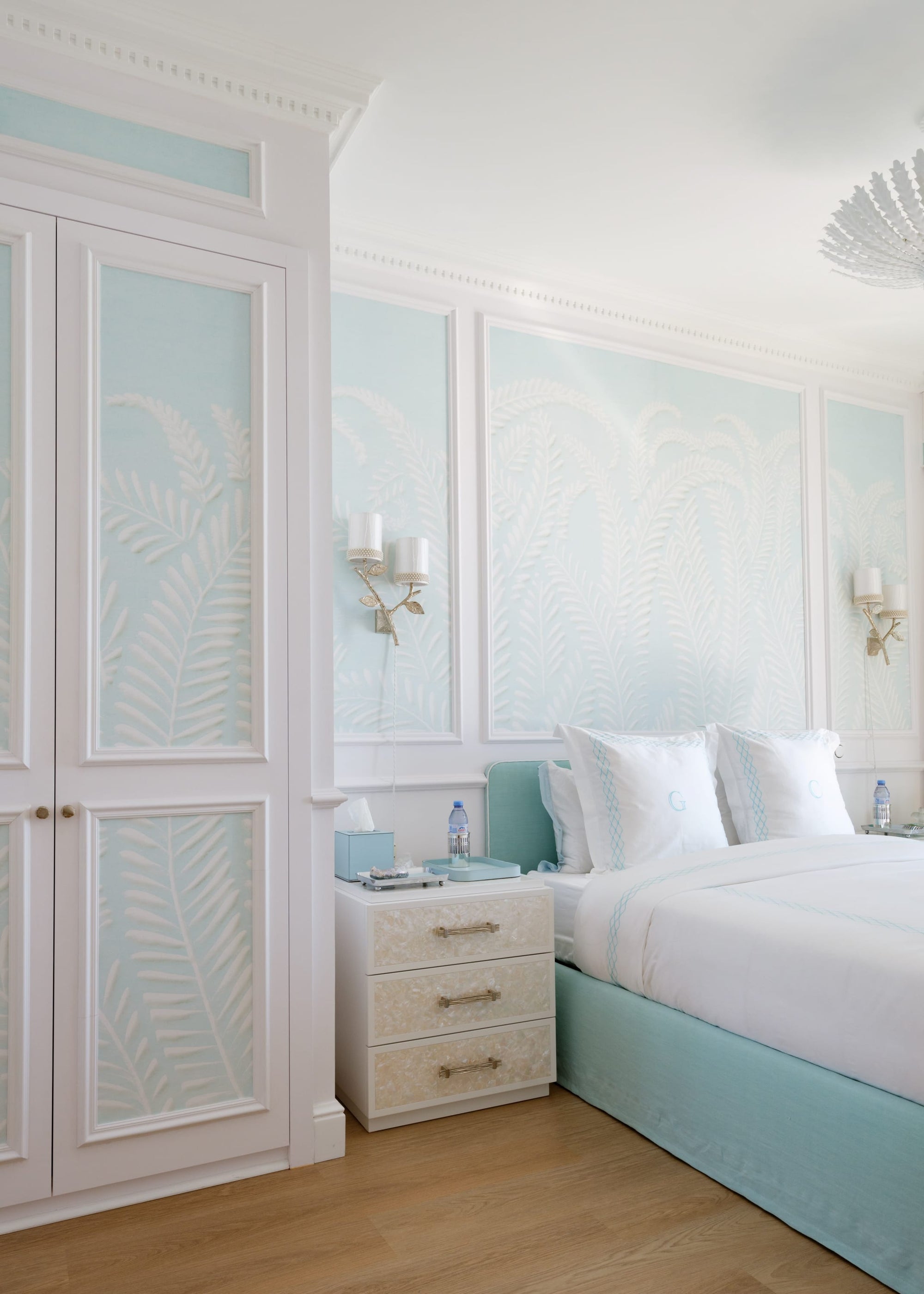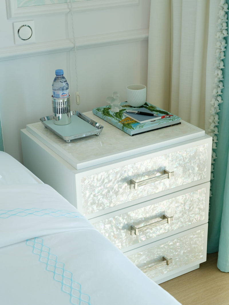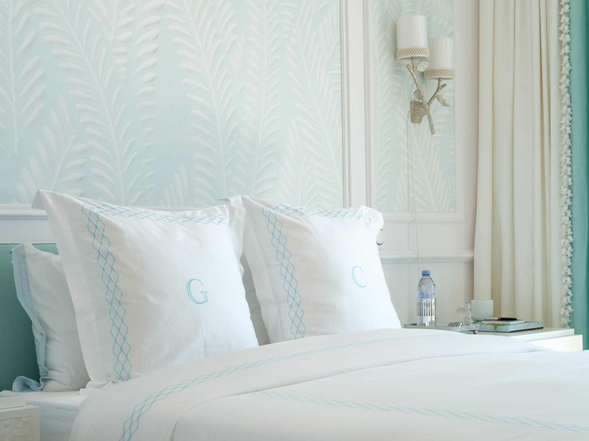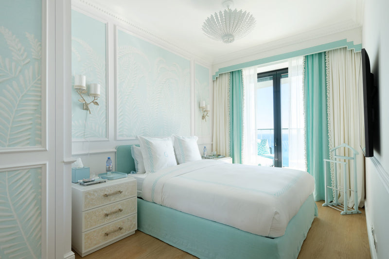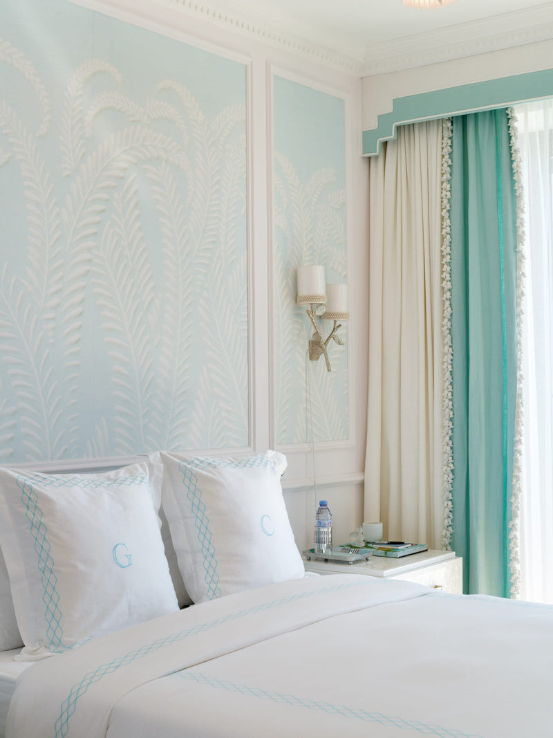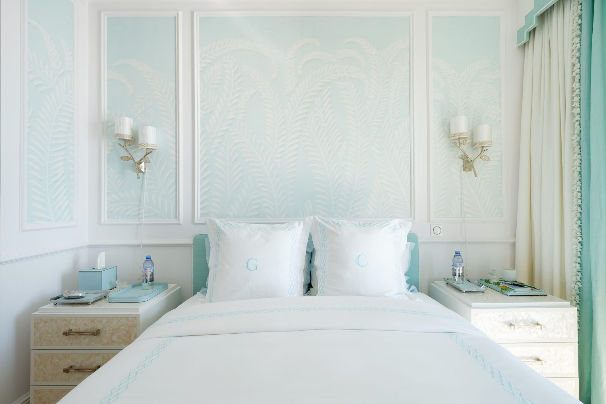 While the living room exudes energy, the bedroom offers a serene, hotel-inspired retreat. From hand-painted wallpaper and intricate boiseries to custom mother-of-pearl bedside tables, every detail exudes elegance. Luxurious touches, like whimsical pompom curtains, create a dreamy atmosphere, turning the bedroom into a haven.