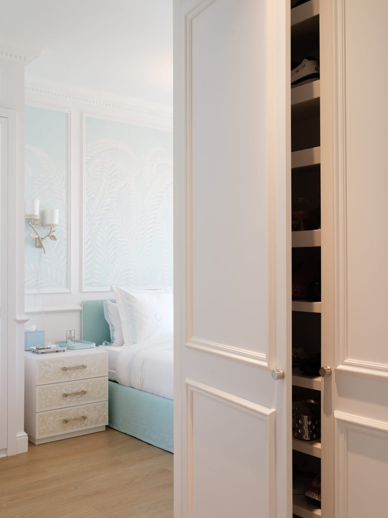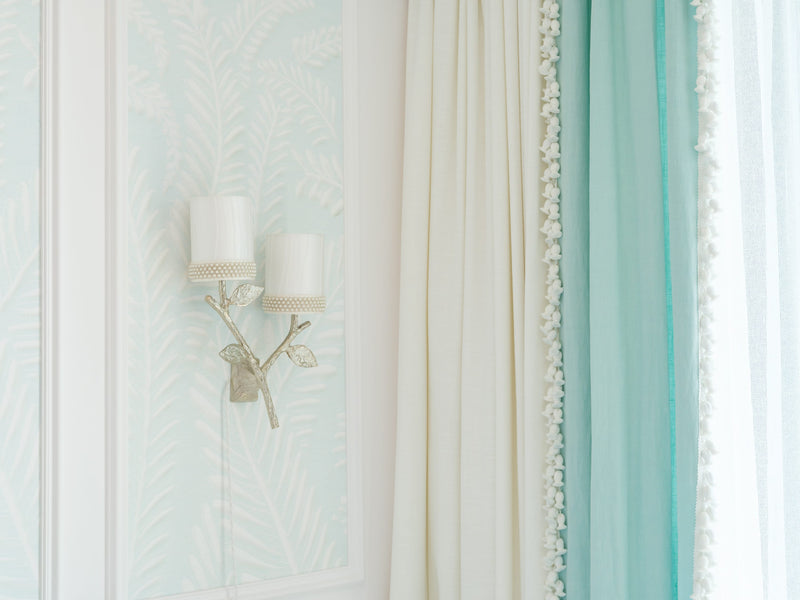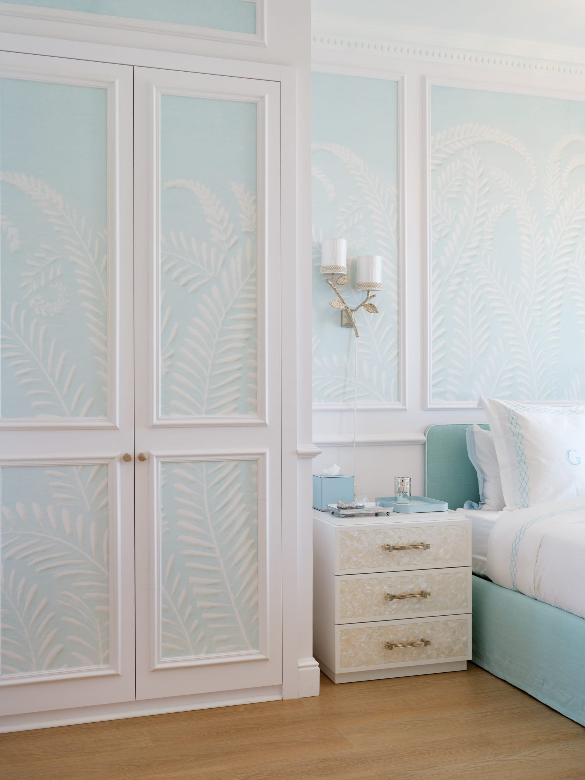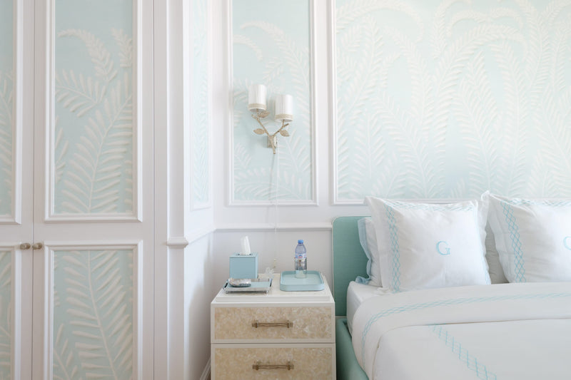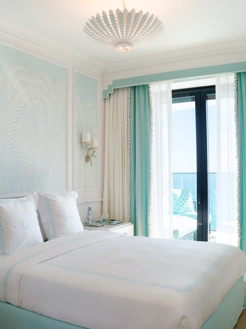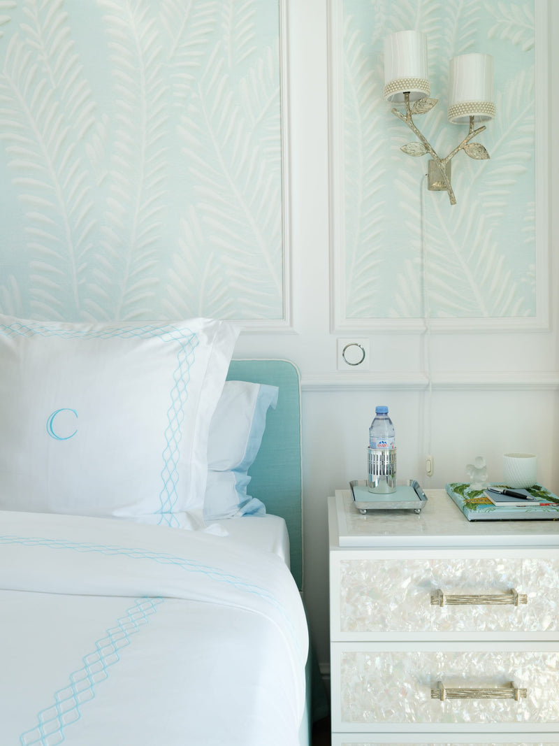 While the living room exudes energy, the bedroom offers a serene, hotel-inspired retreat. From hand-painted wallpaper and intricate boiseries to custom mother-of-pearl bedside tables, every detail exudes elegance. Luxurious touches, like whimsical pompom curtains, create a dreamy atmosphere, turning the bedroom into a haven.