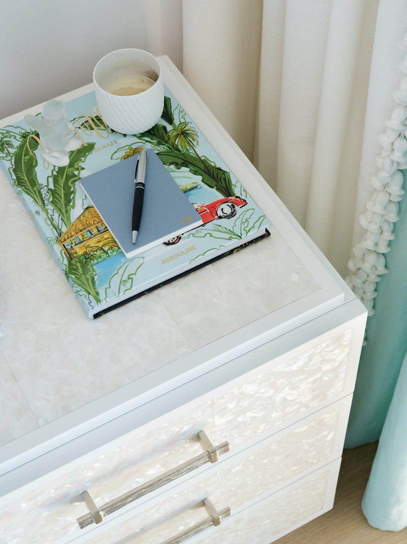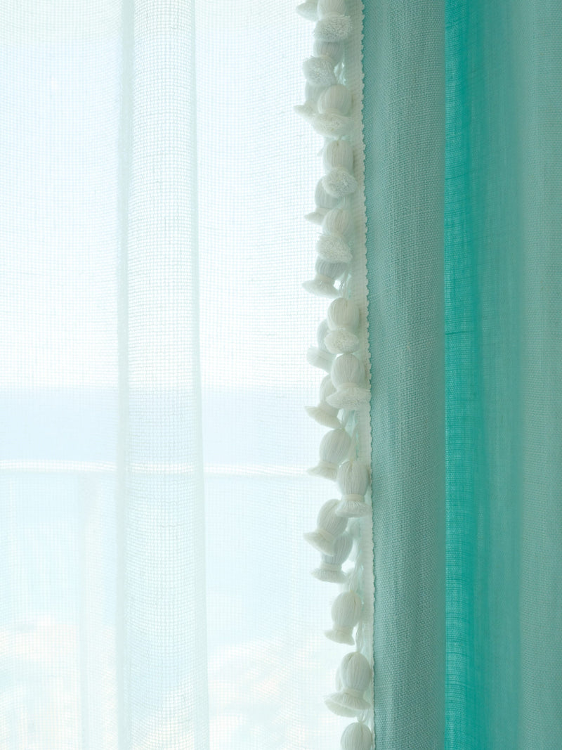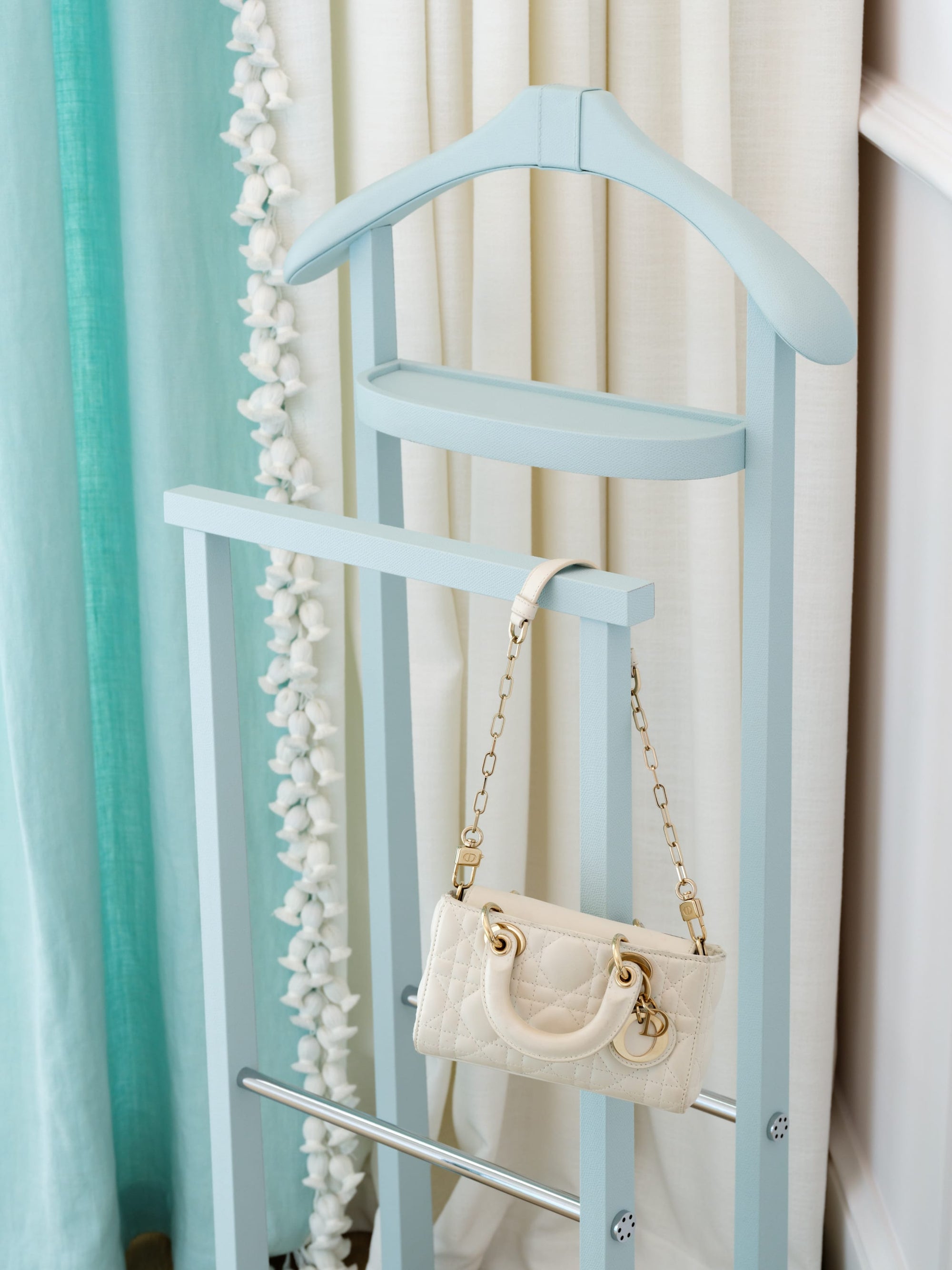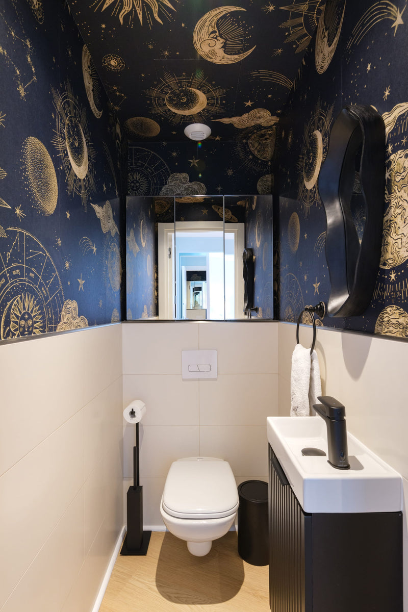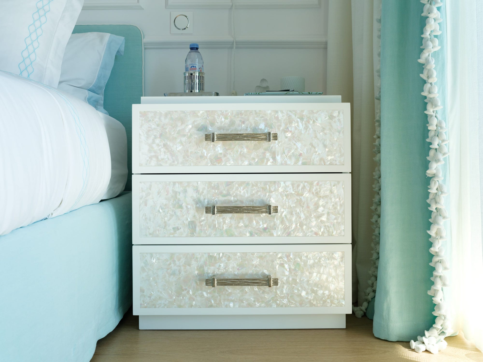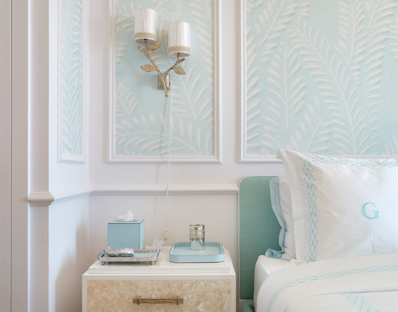 While the living room exudes energy, the bedroom offers a serene, hotel-inspired retreat. From hand-painted wallpaper and intricate boiseries to custom mother-of-pearl bedside tables, every detail exudes elegance. Luxurious touches, like whimsical pompom curtains, create a dreamy atmosphere, turning the bedroom into a haven.